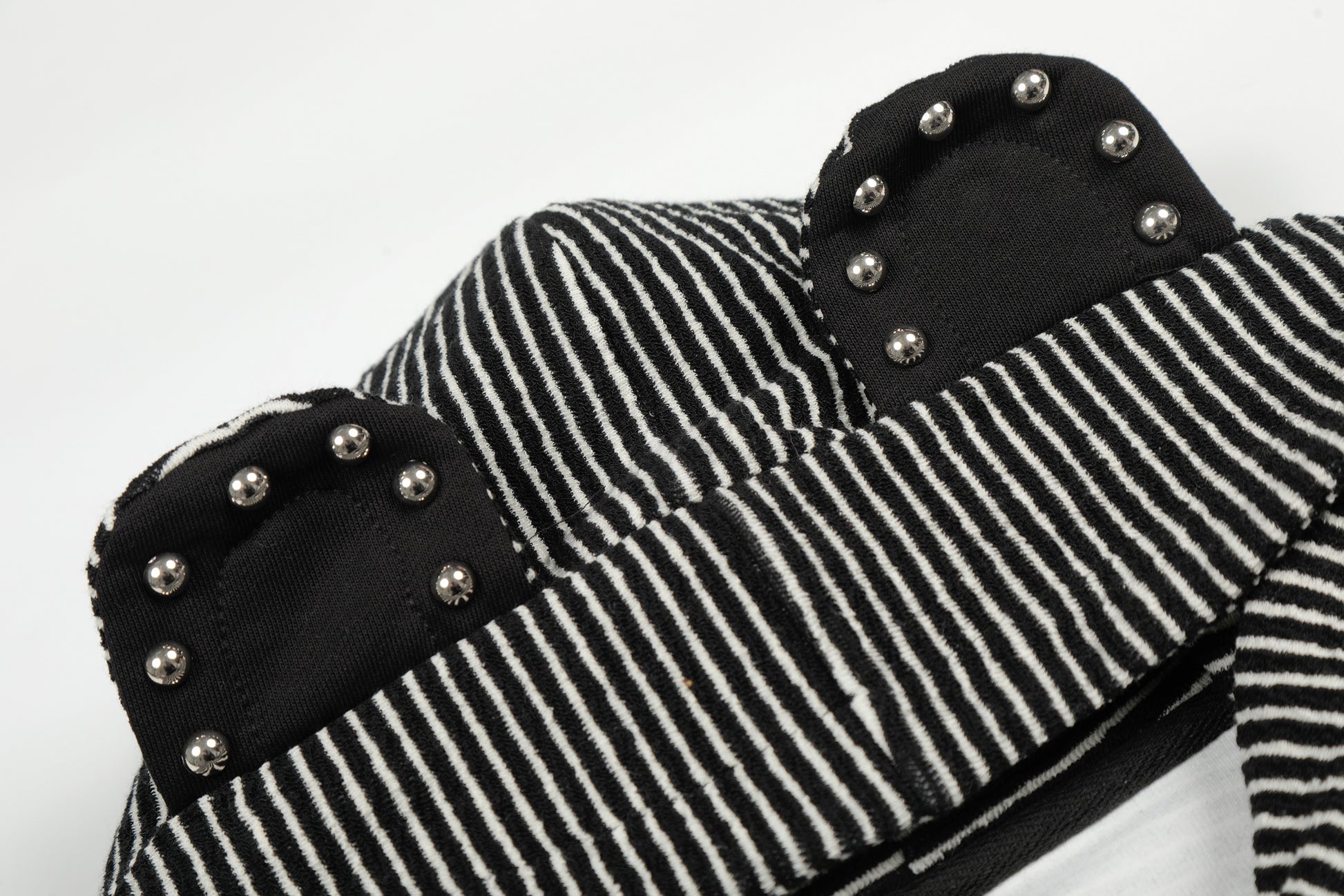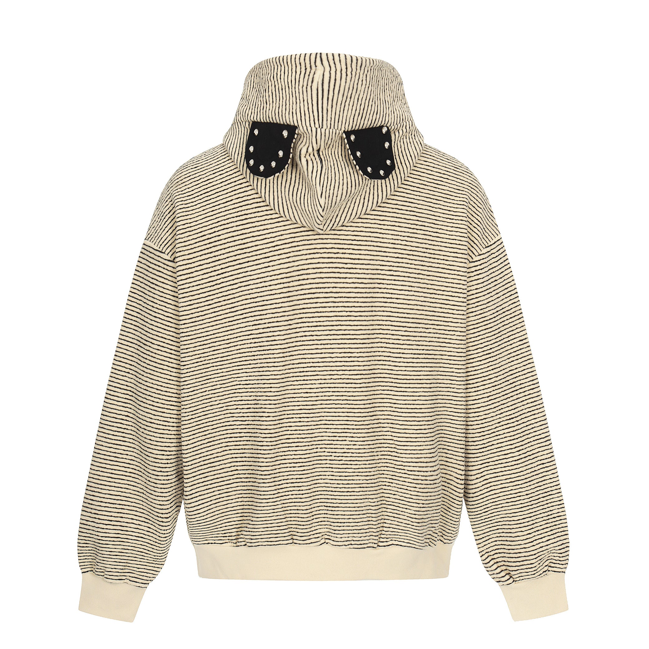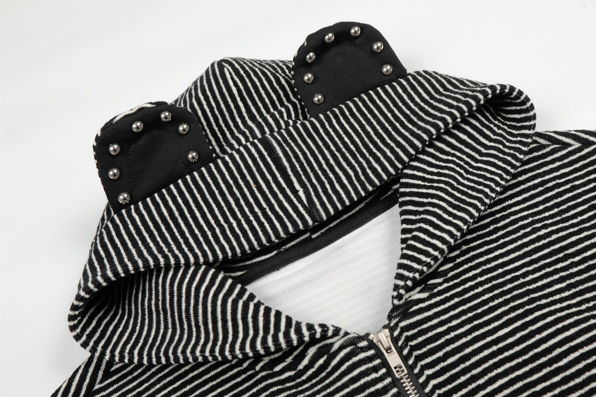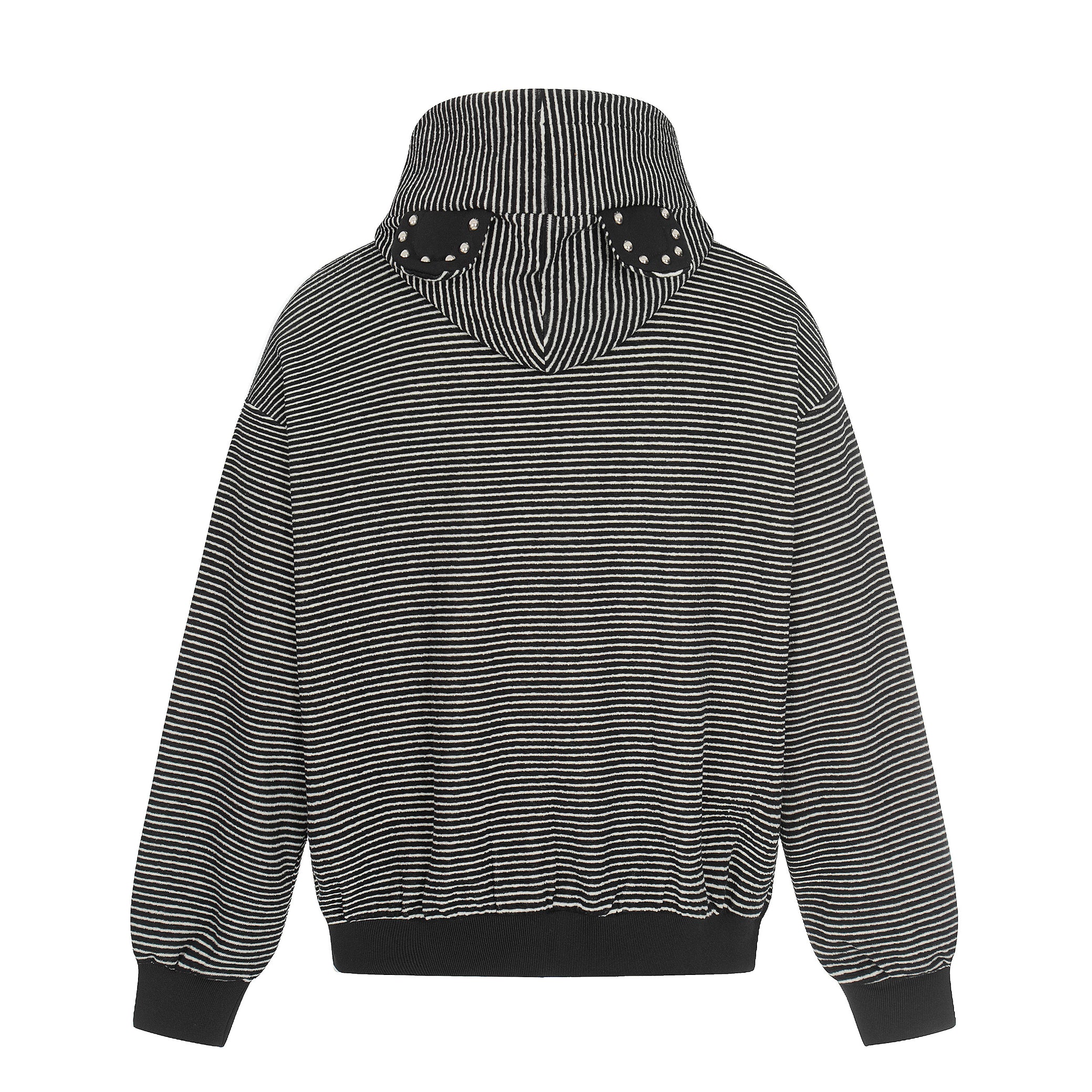 Clothing details: Full zip-front closure, attached hood design, all-over stripe fabric, chest logo detail, front pockets, ribbed cuffs and hem, relaxed fit.