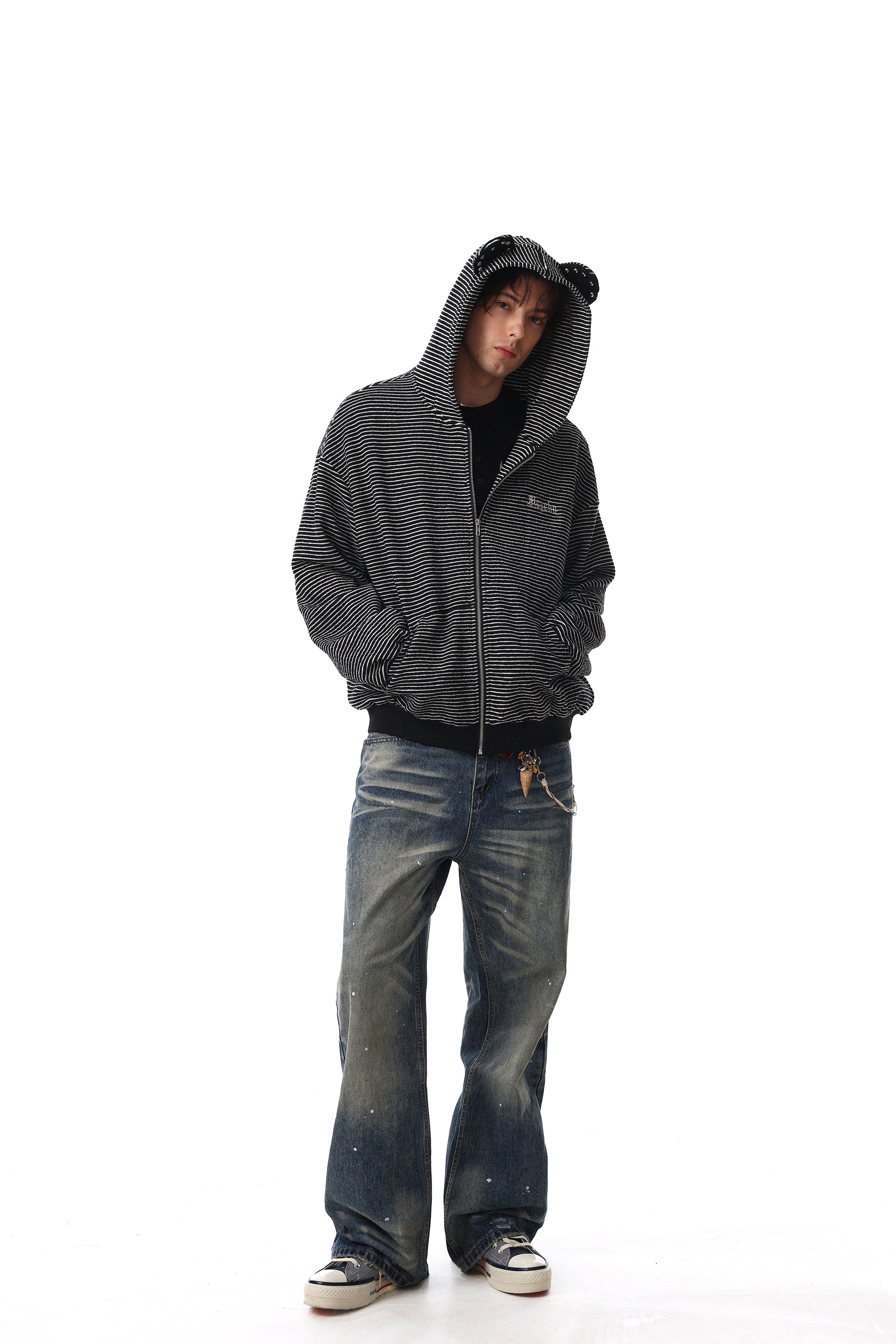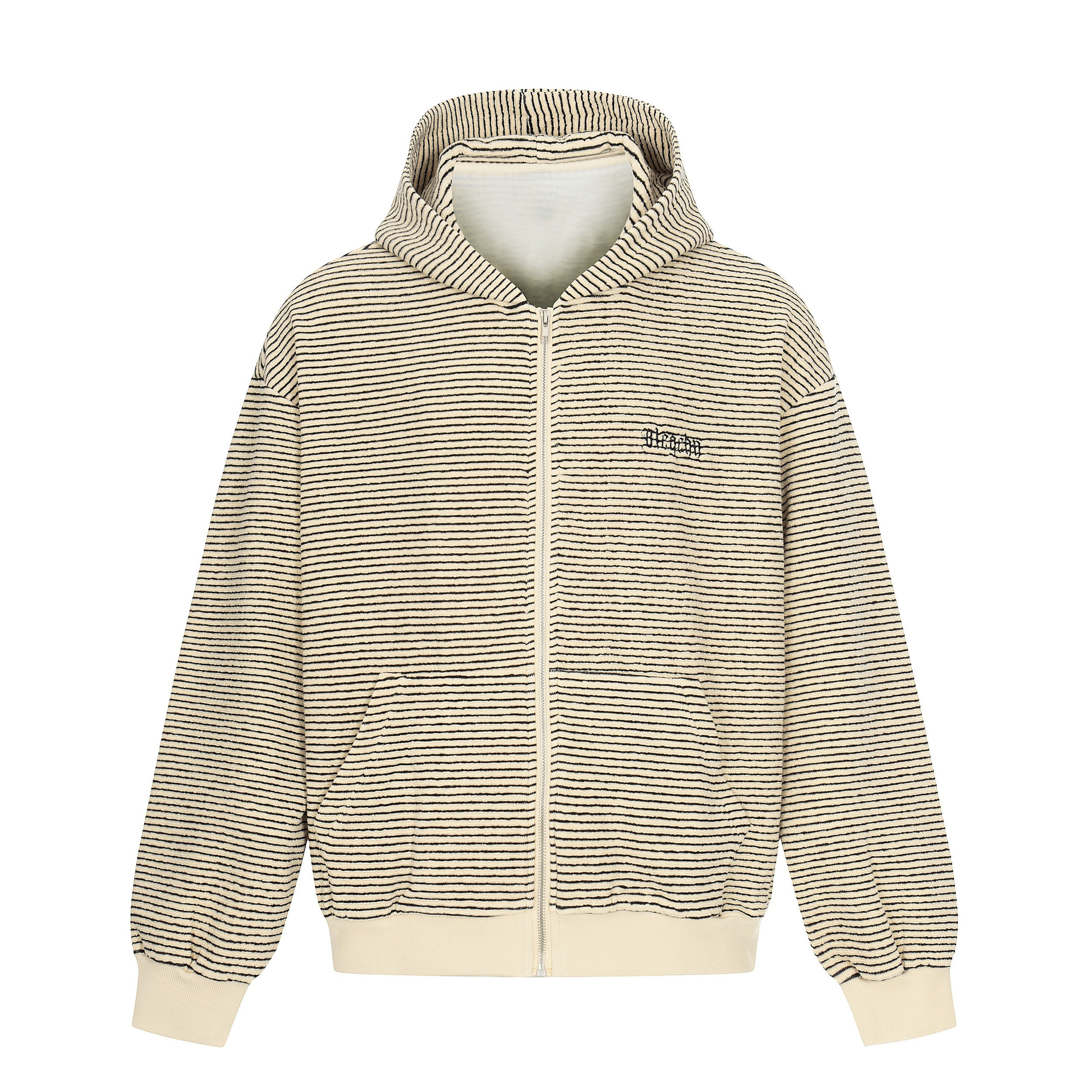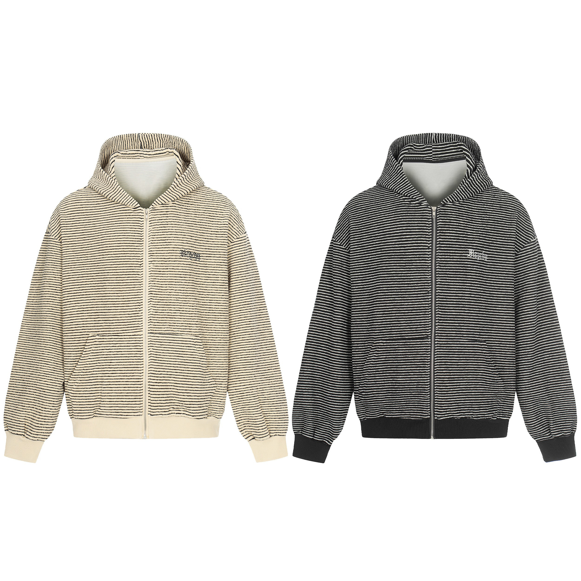 The Omirad Striped Zip Hoodie features a classic full zip-up hoodie silhouette with an all-over horizontal stripe texture and a clean, minimal finish. Designed for everyday streetwear layering, this piece delivers a relaxed look with subtle detail and comfortable wear.