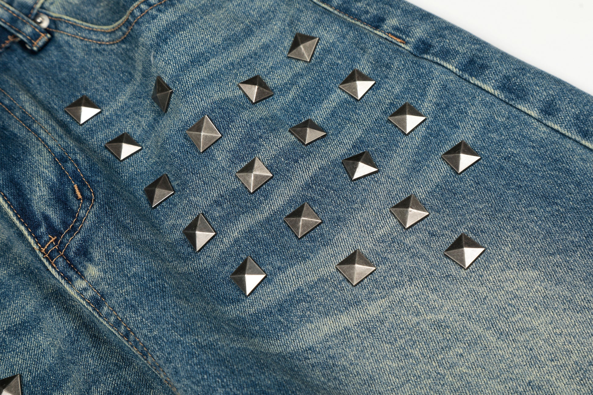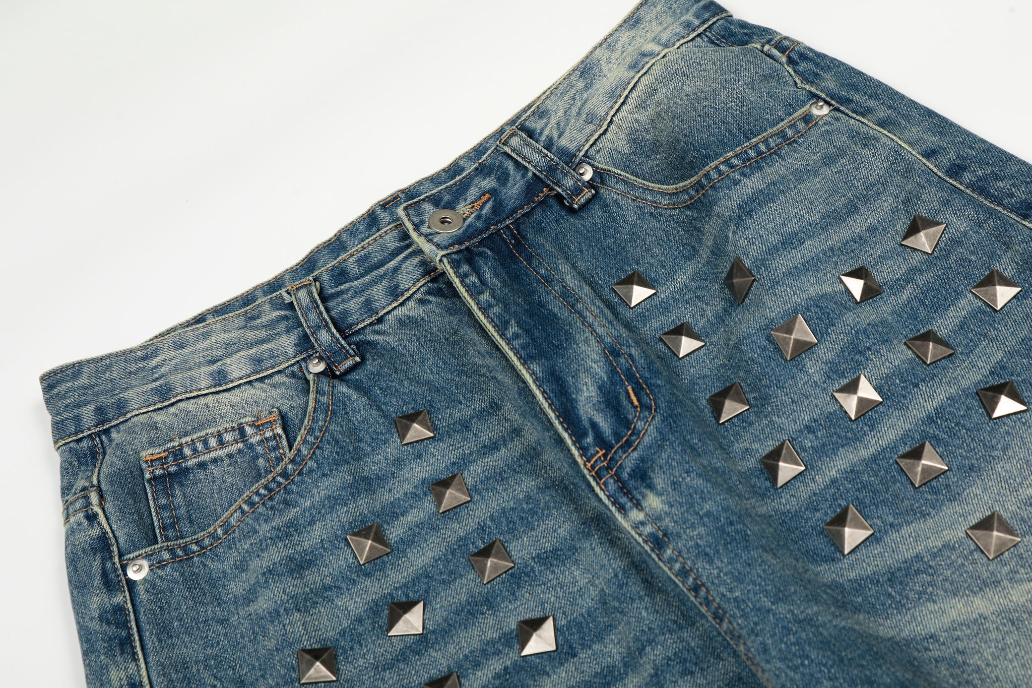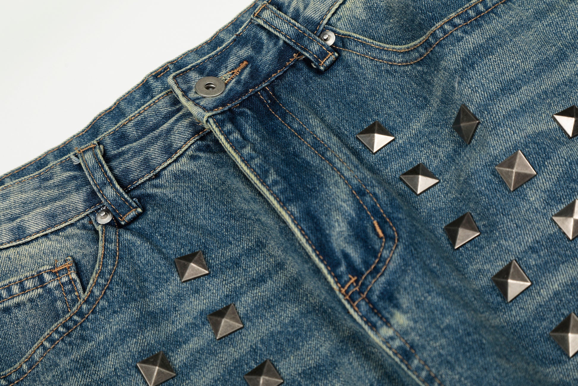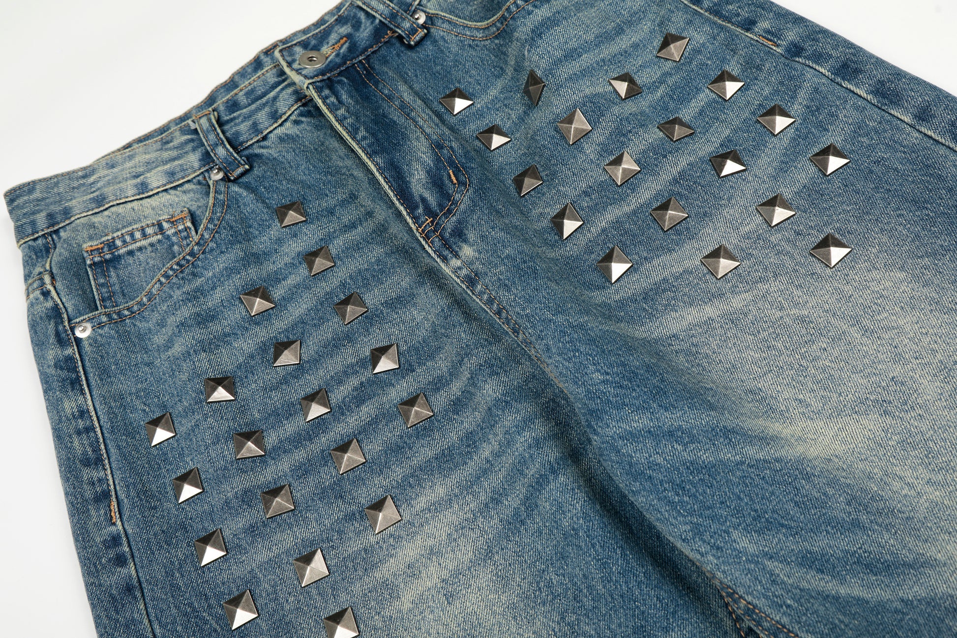 The Omirad Studded Wide-Leg Vintage Wash Jeans bring bold attitude to classic denim. Featuring metal pyramid studs arranged across the front panels, this pair blends raw street energy with standout detailing. The wide-leg silhouette and heavy vintage wash create an effortless retro look, while the premium cotton-blend fabric ensures durability and everyday comfort. Designed to elevate any streetwear fit, these jeans deliver texture, structure, and unmistakable edge.
