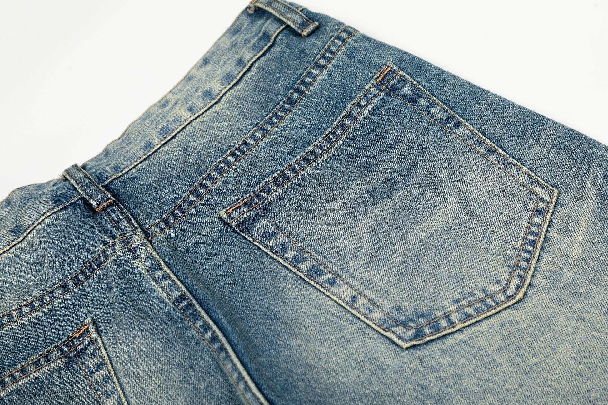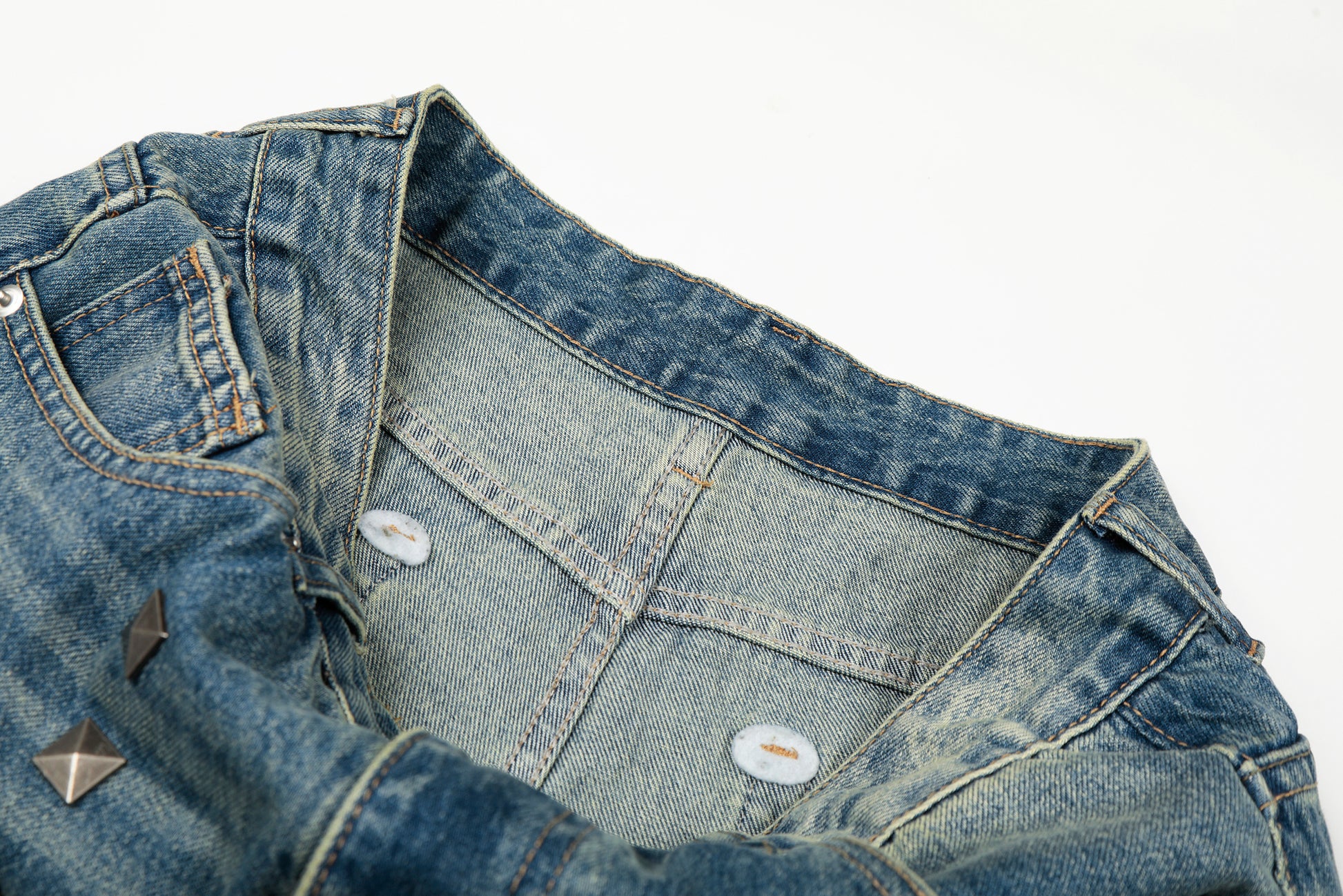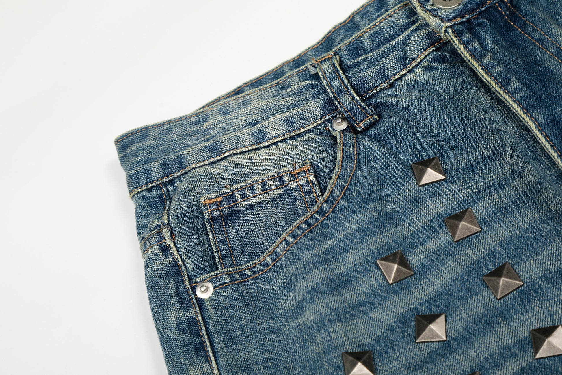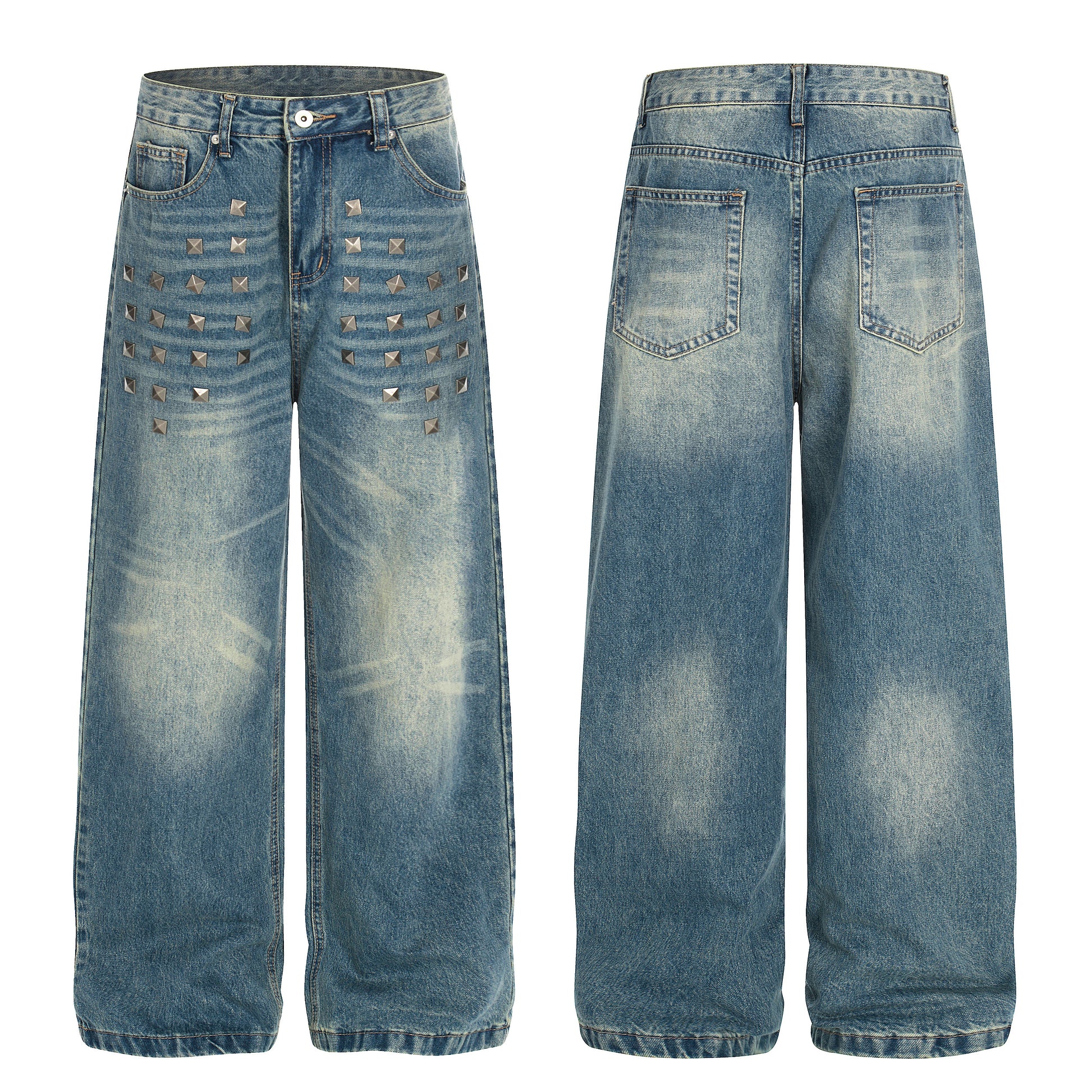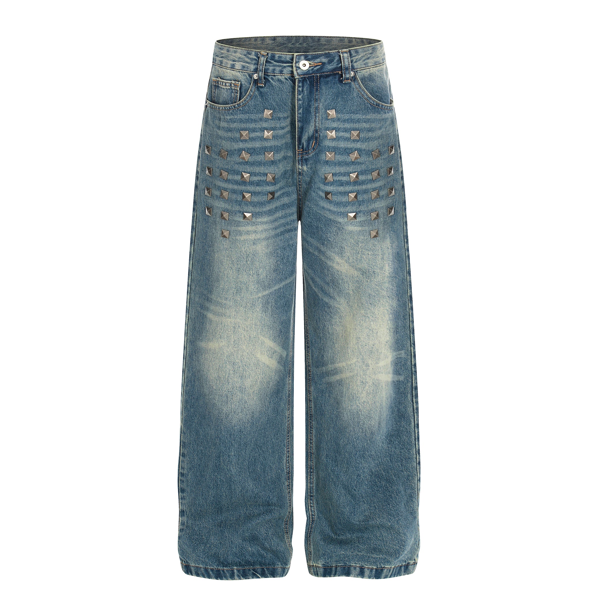 The Omirad Studded Wide-Leg Vintage Wash Jeans bring bold attitude to classic denim. Featuring metal pyramid studs arranged across the front panels, this pair blends raw street energy with standout detailing. The wide-leg silhouette and heavy vintage wash create an effortless retro look, while the premium cotton-blend fabric ensures durability and everyday comfort. Designed to elevate any streetwear fit, these jeans deliver texture, structure, and unmistakable edge.