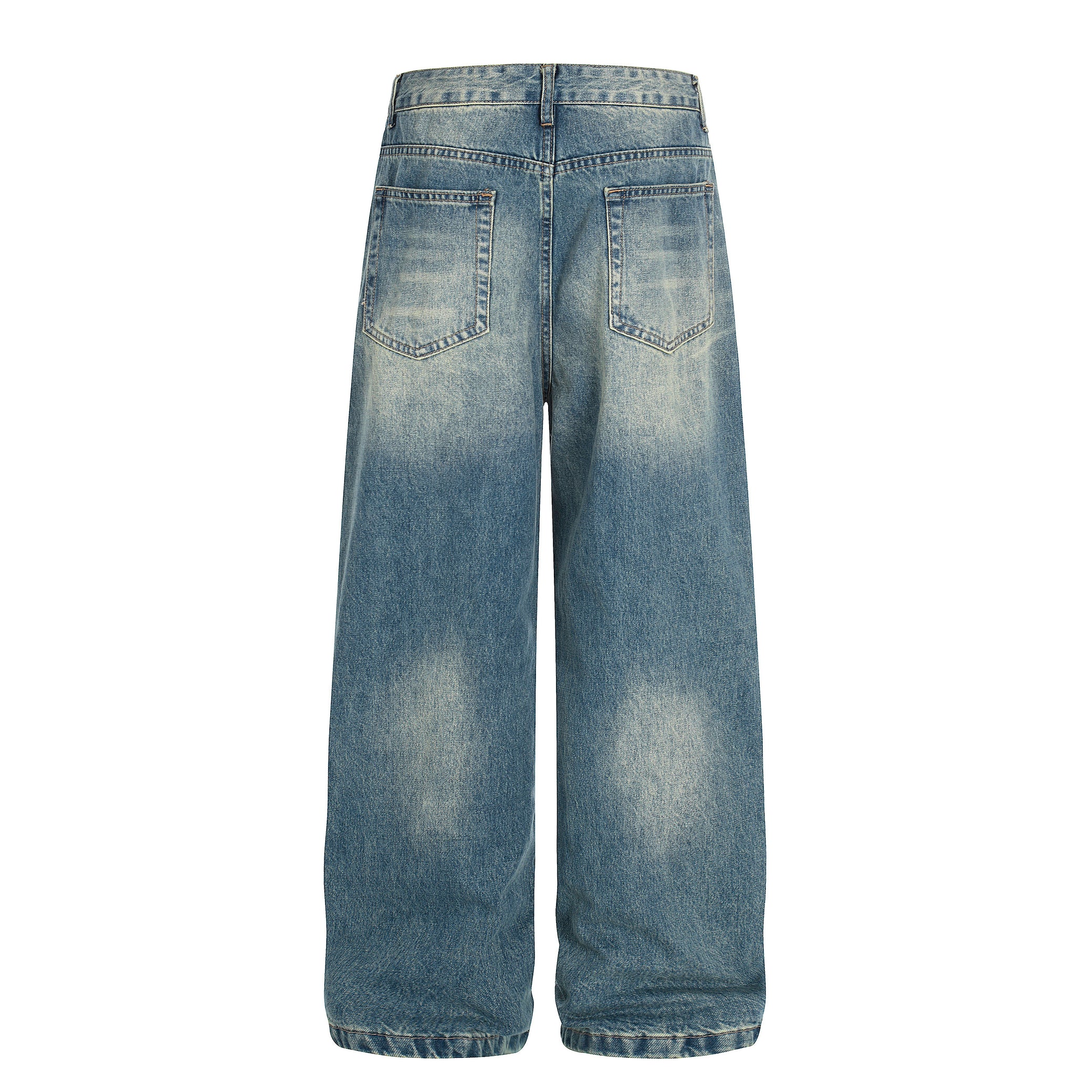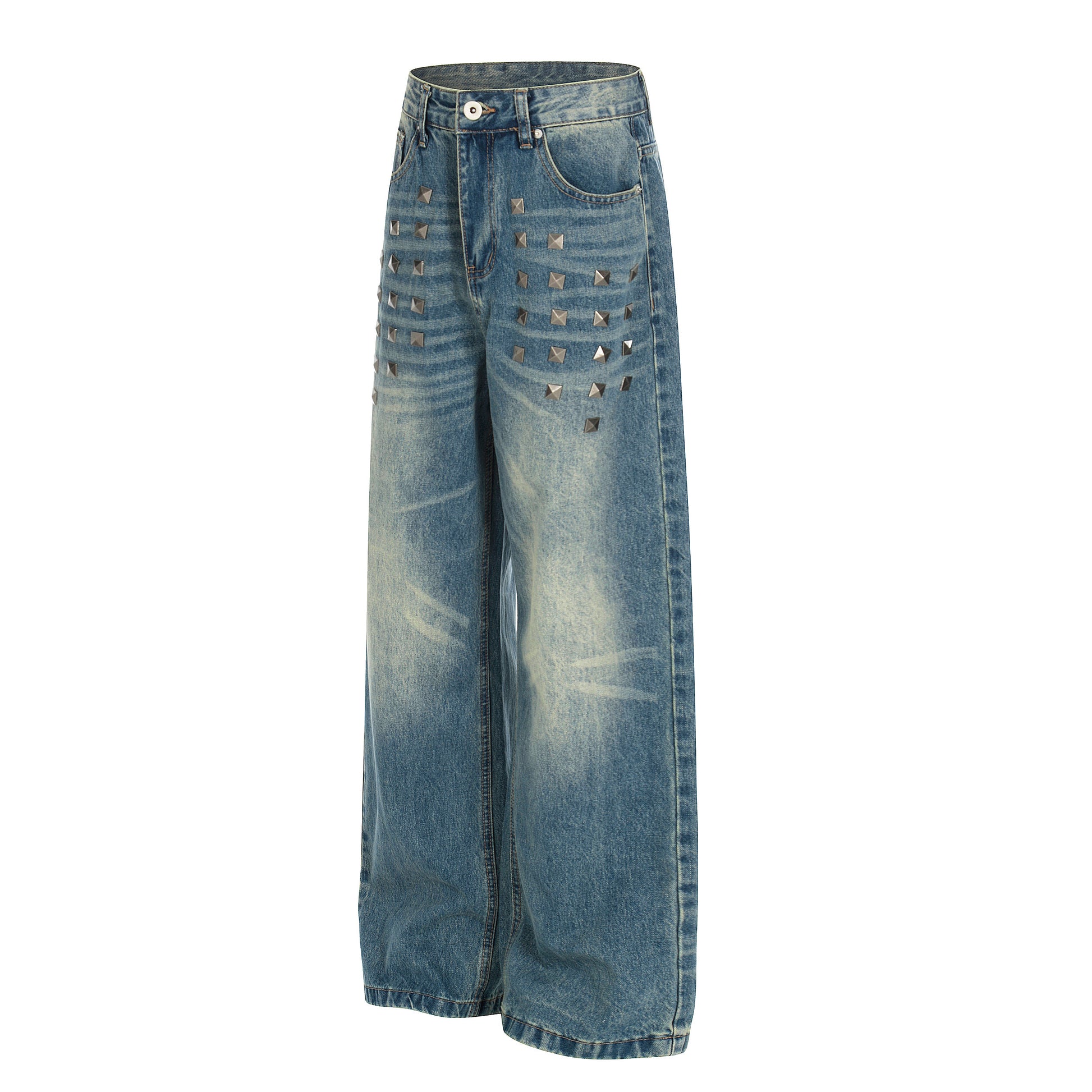 Clothing details: Metal stud embellishments, vintage wash finish, wide-leg silhouette