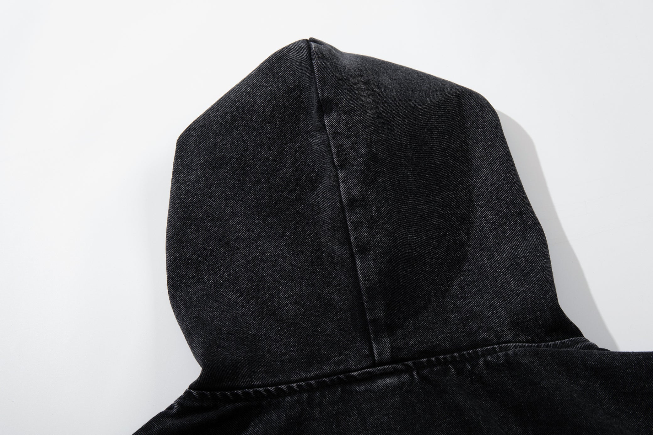 Clothing details: Washed denim hoodie design, metal toggle front closure, adjustable hood, kangaroo front pocket, elasticated hem and cuffs, relaxed fit, vintage faded finish, structured cotton denim fabric.