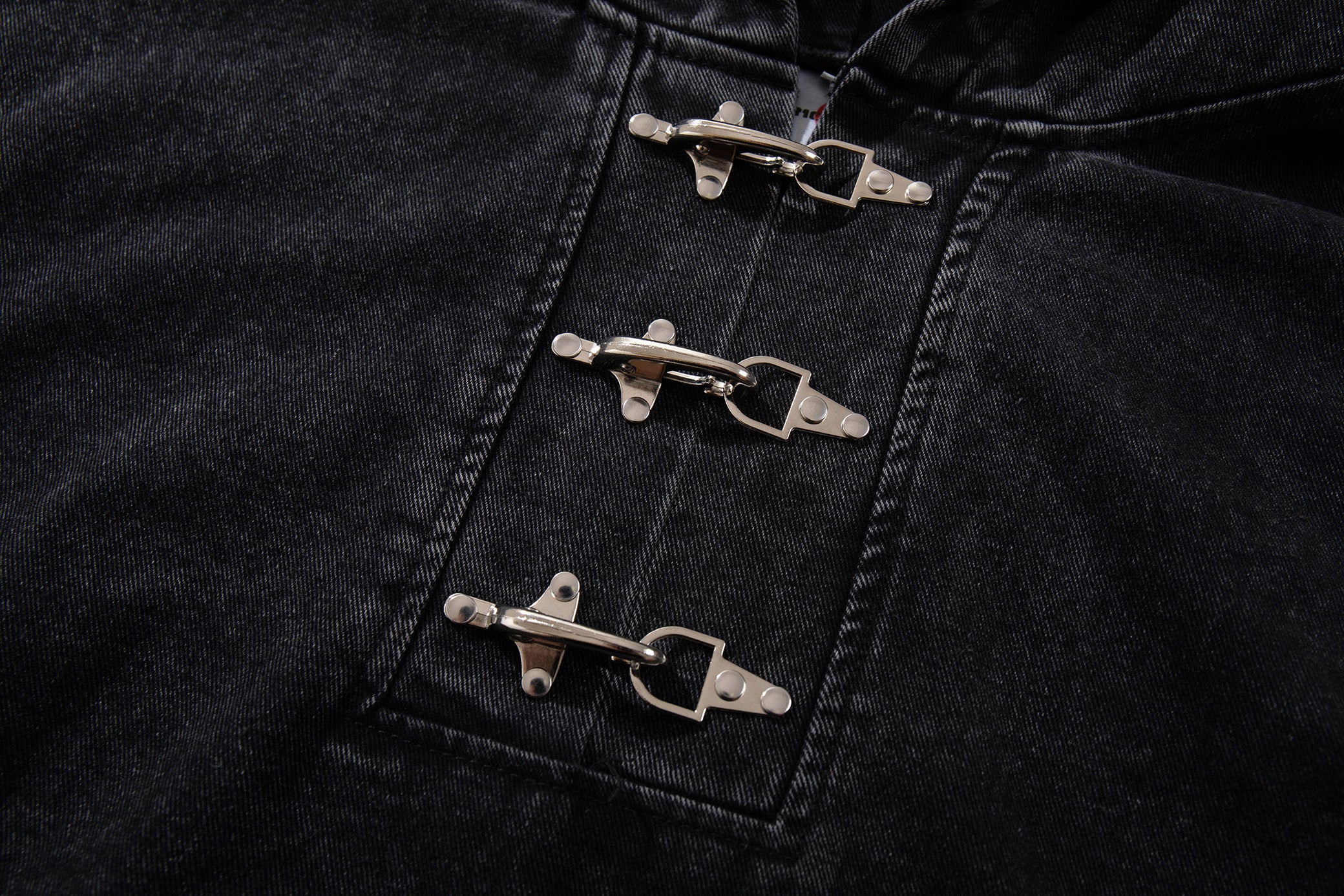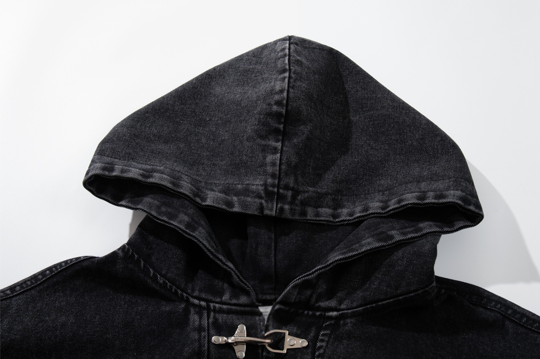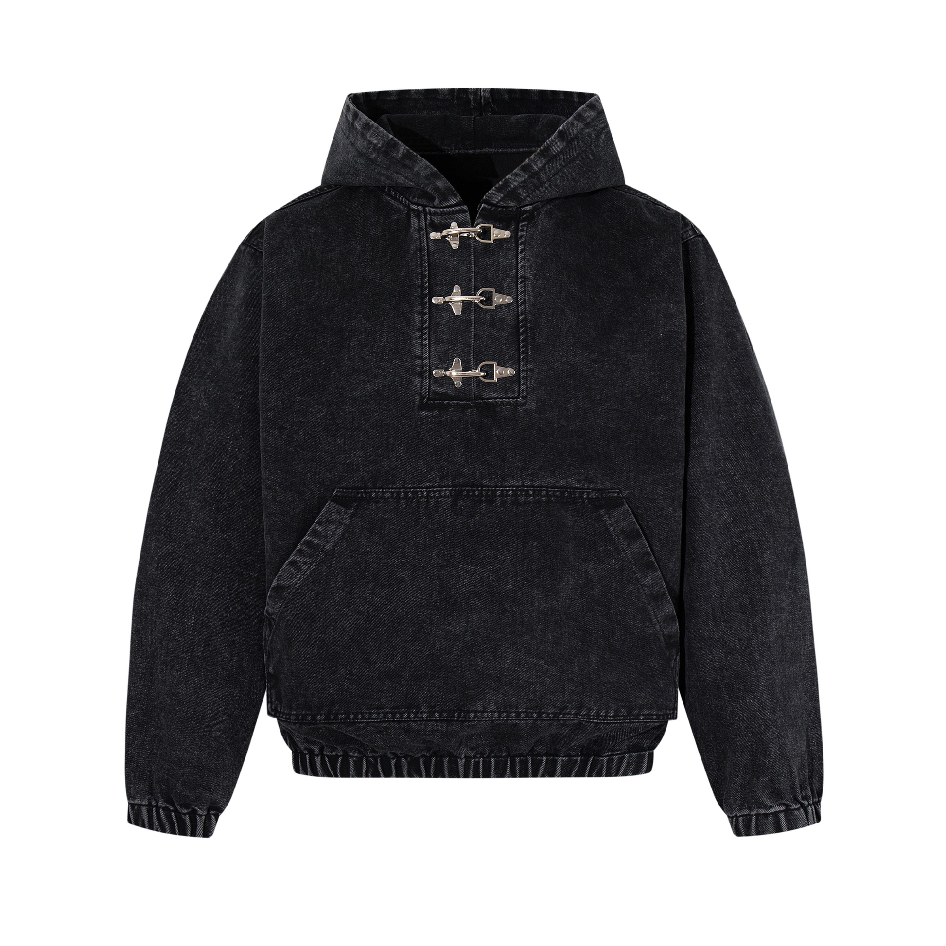 The Omirad Toggle-Front Washed Denim Hoodie blends classic hoodie comfort with rugged denim attitude. Crafted from heavyweight washed cotton denim, it features a unique metal toggle placket at the chest that adds a utilitarian edge. The relaxed silhouette, elasticated hem, and spacious kangaroo pocket keep it functional, while the faded black wash delivers a worn-in streetwear aesthetic.