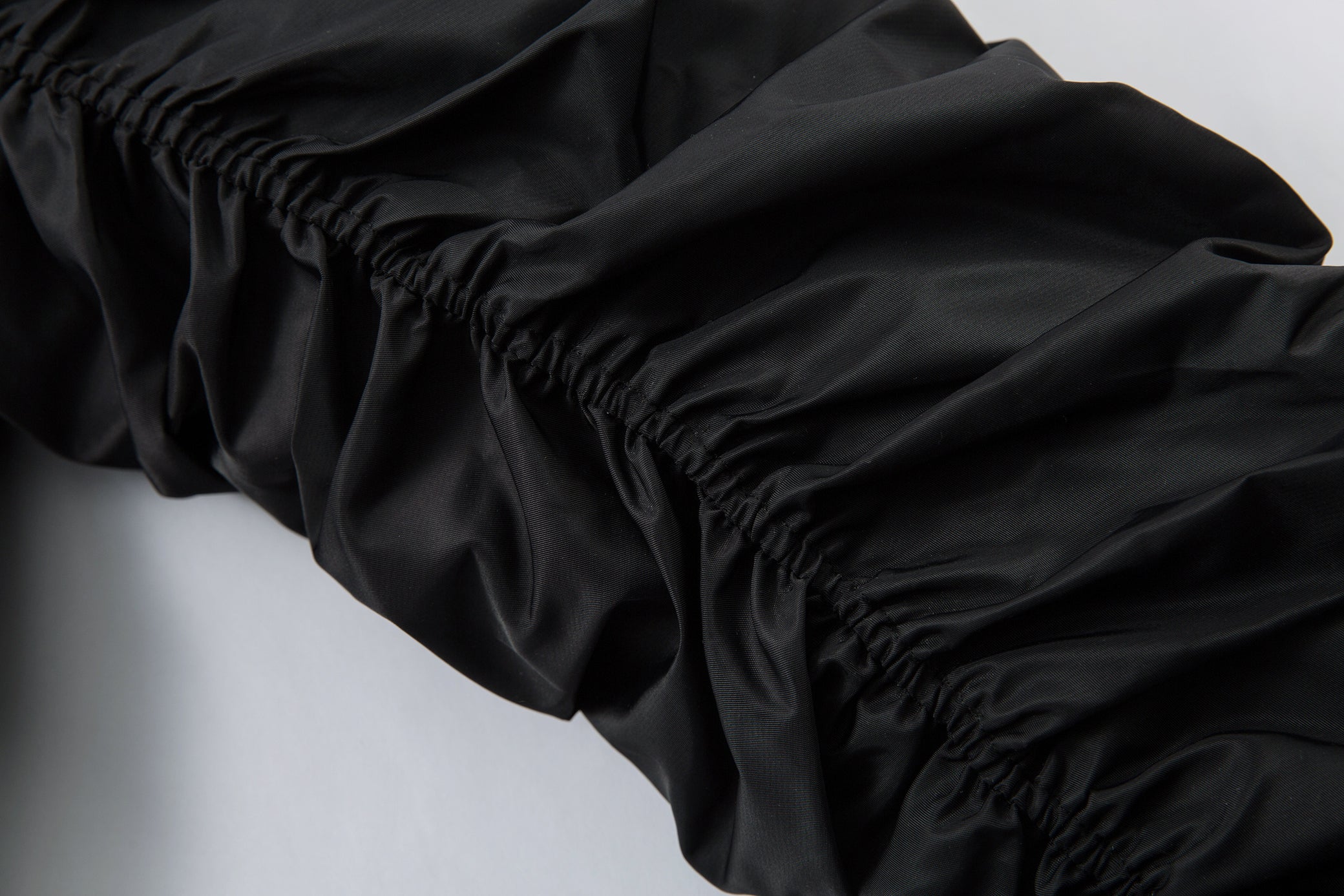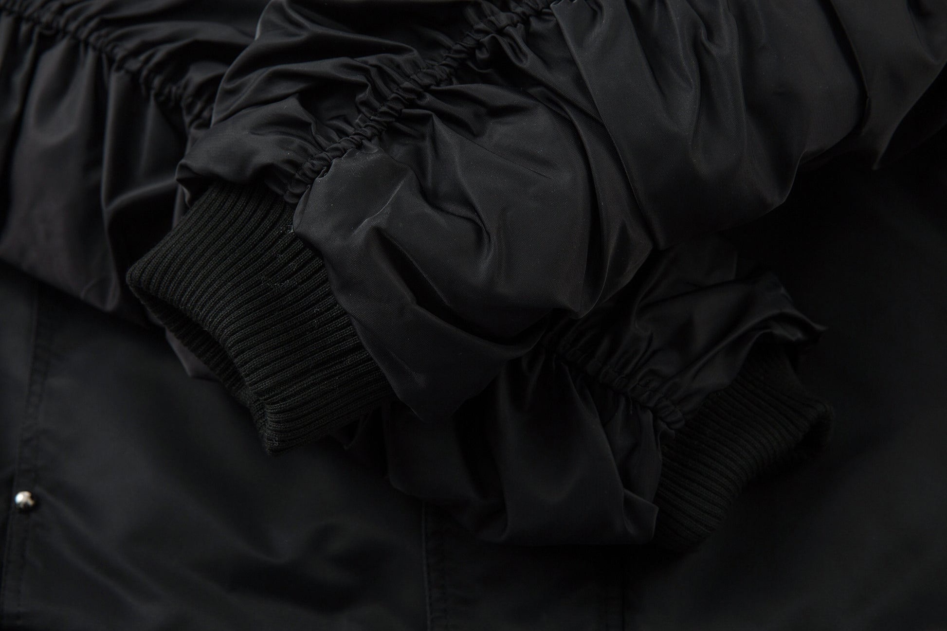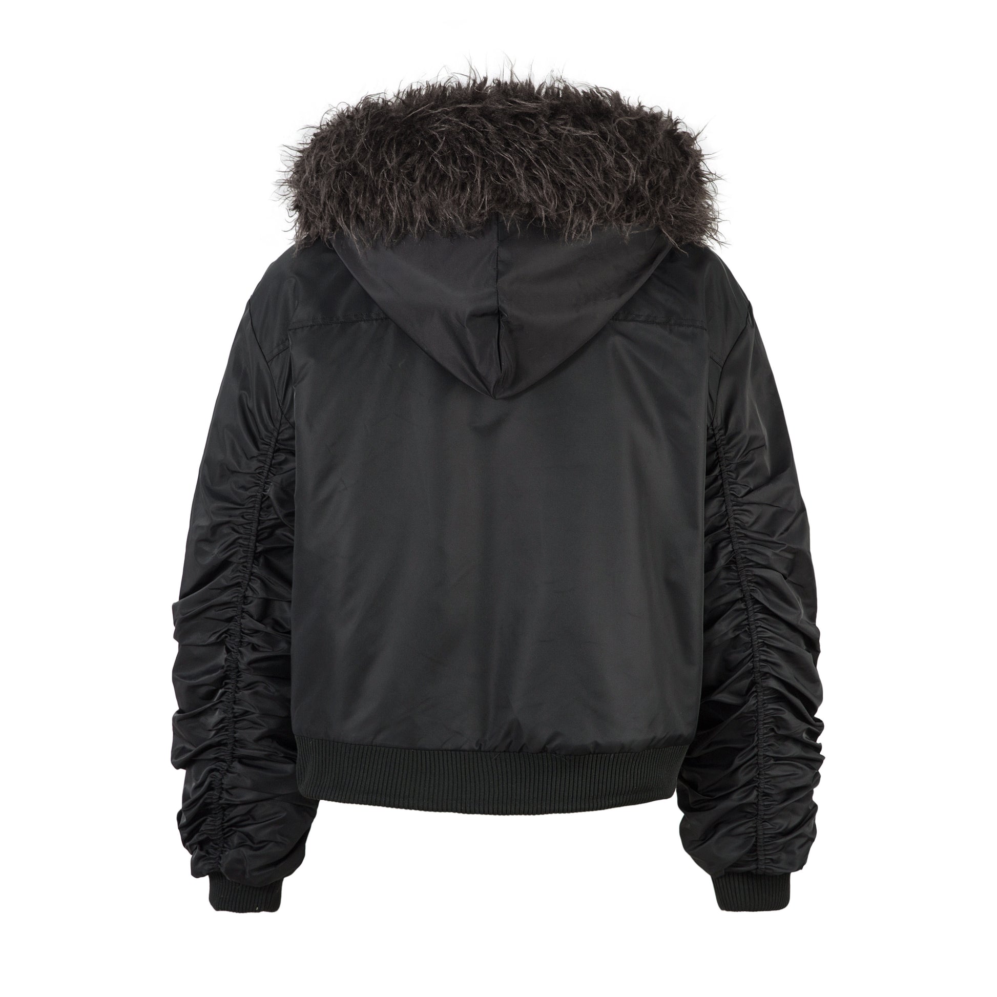 Clothing details: Detachable faux-fur hood, metal toggle-lock front closures, asymmetrical zipper design, ruched sleeves, ribbed cuffs and hem, insulated padded build, high-neck collar option, side pockets for everyday utility.