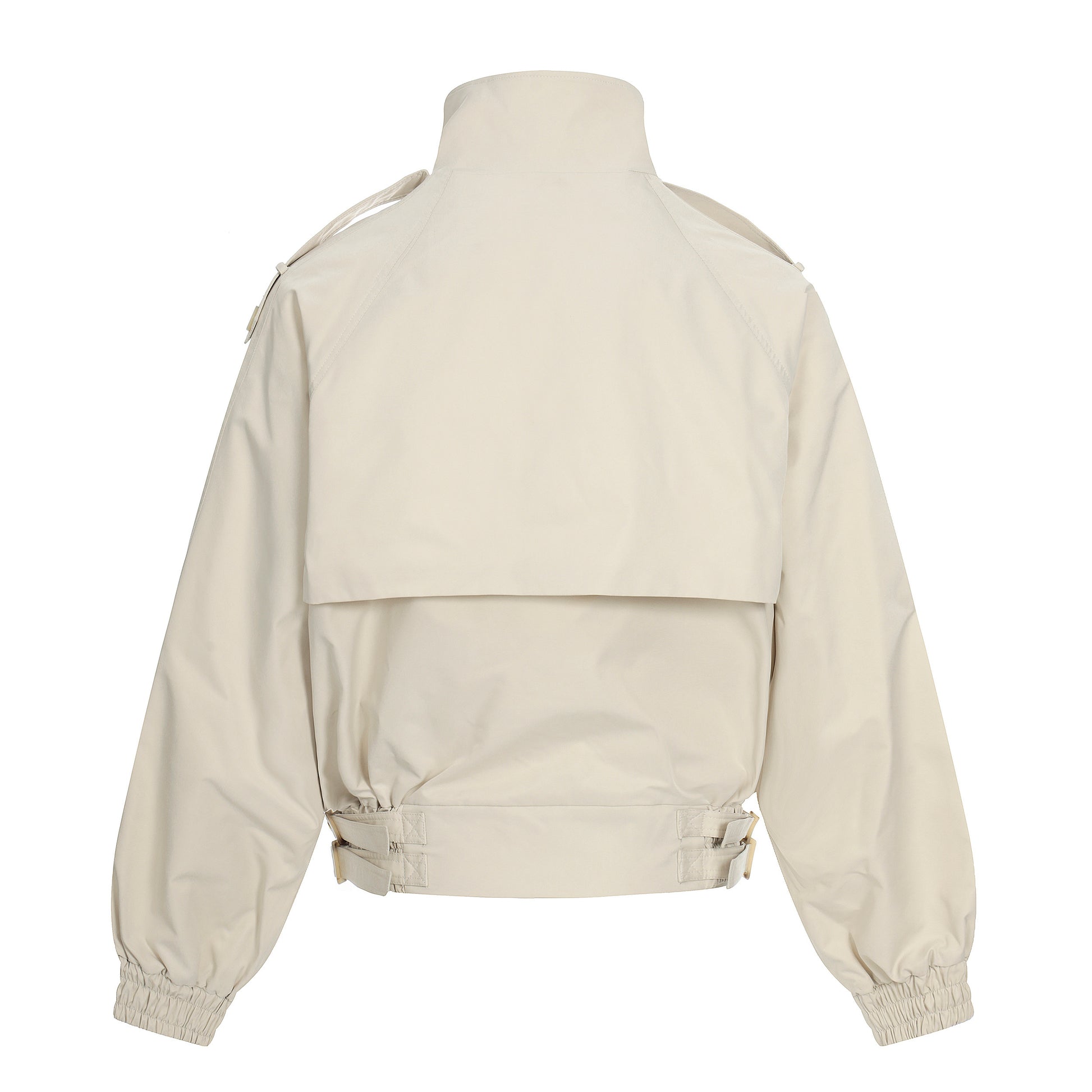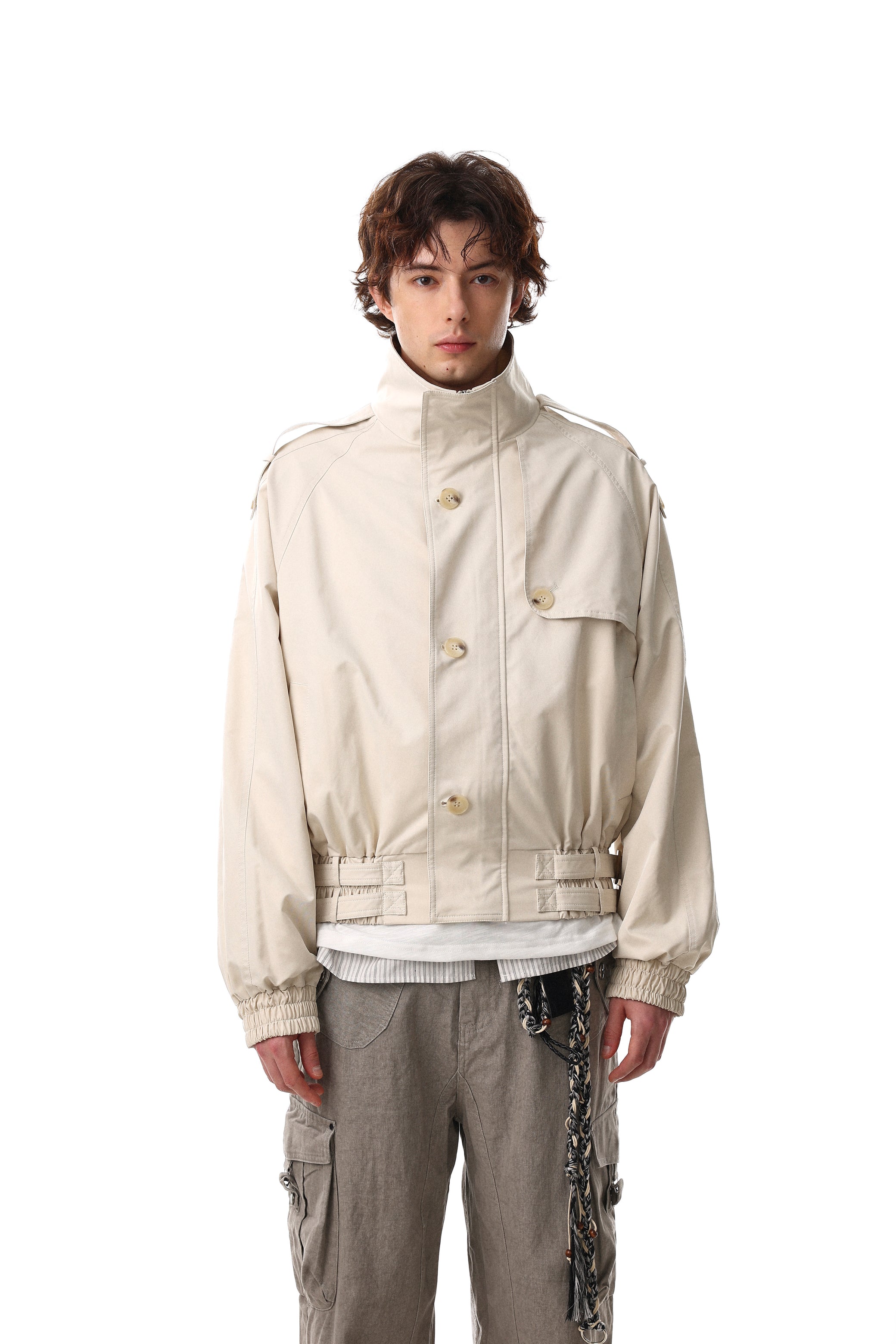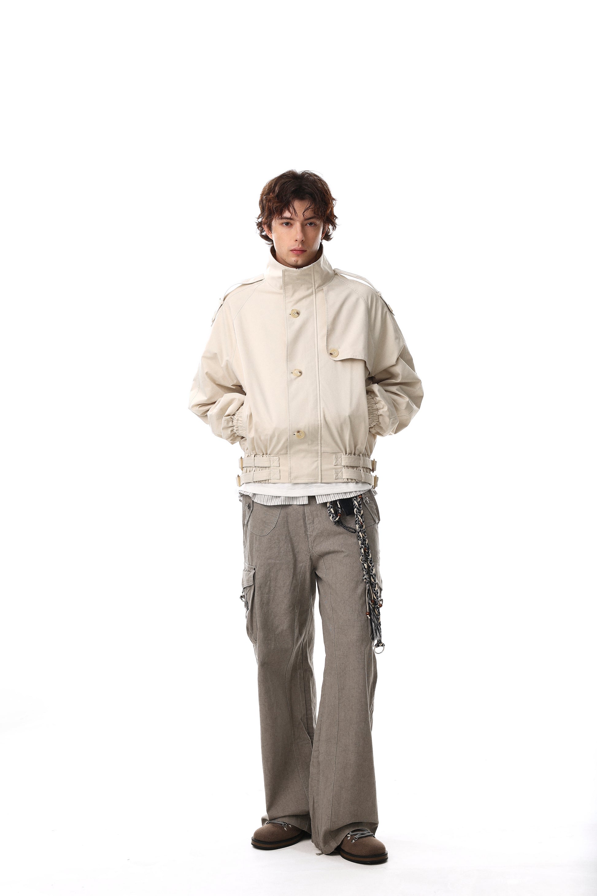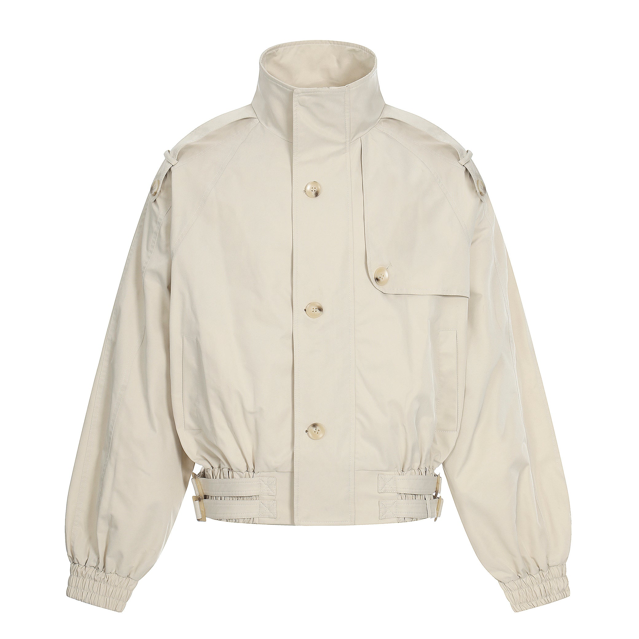 Clothing details: Stand collar design, button-front closure, utility-style chest pocket, elasticated cuffs, adjustable hem straps, relaxed cropped fit.