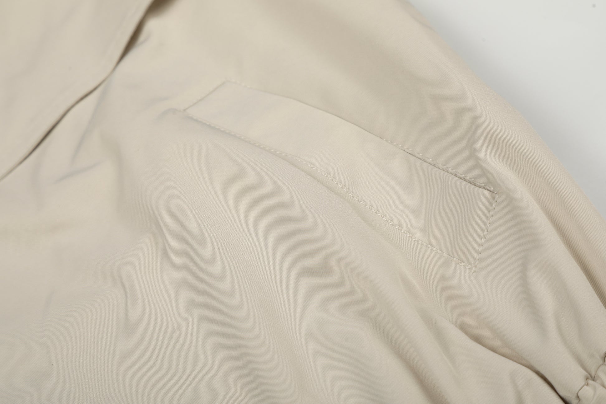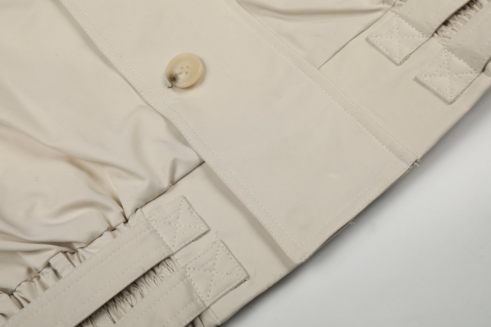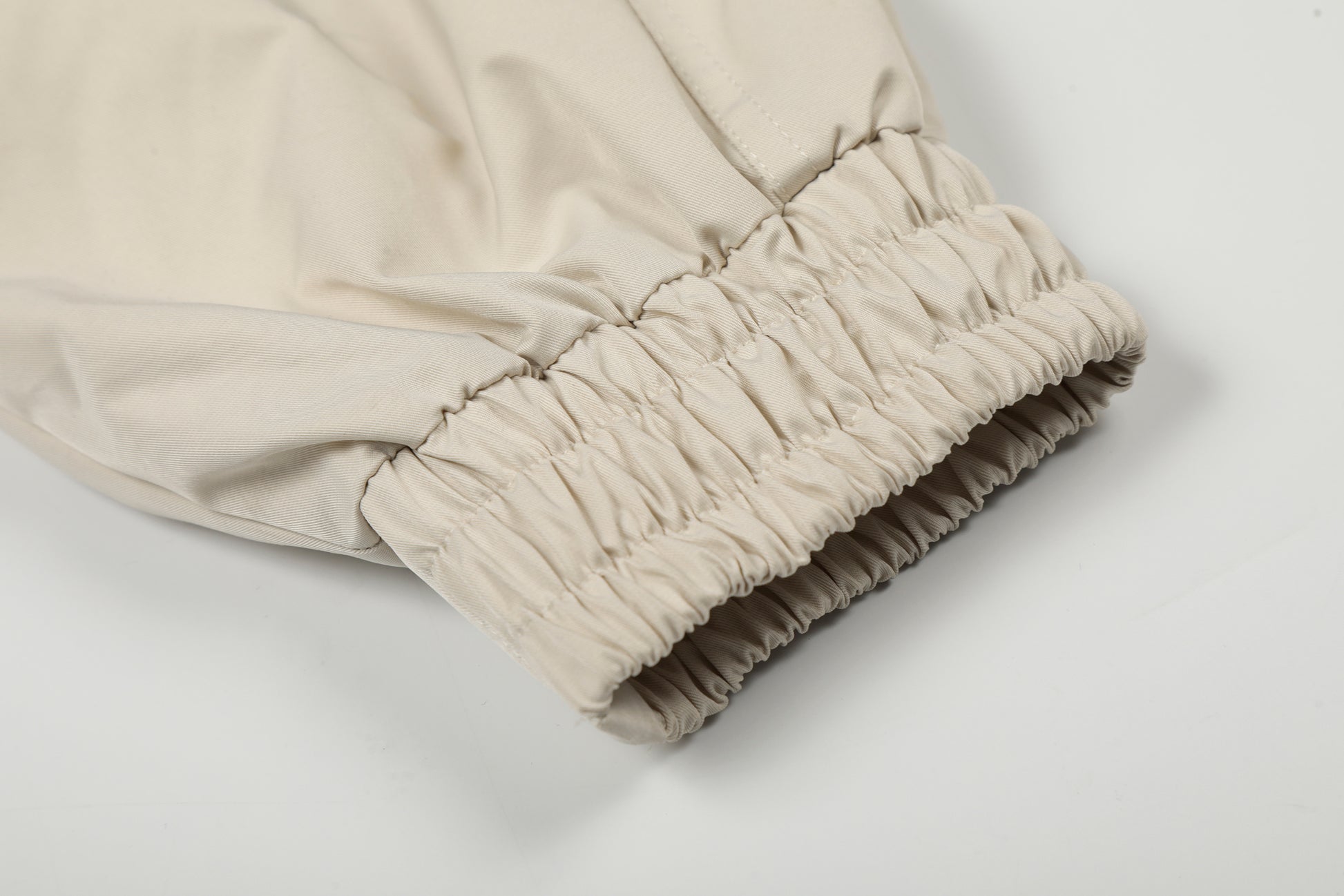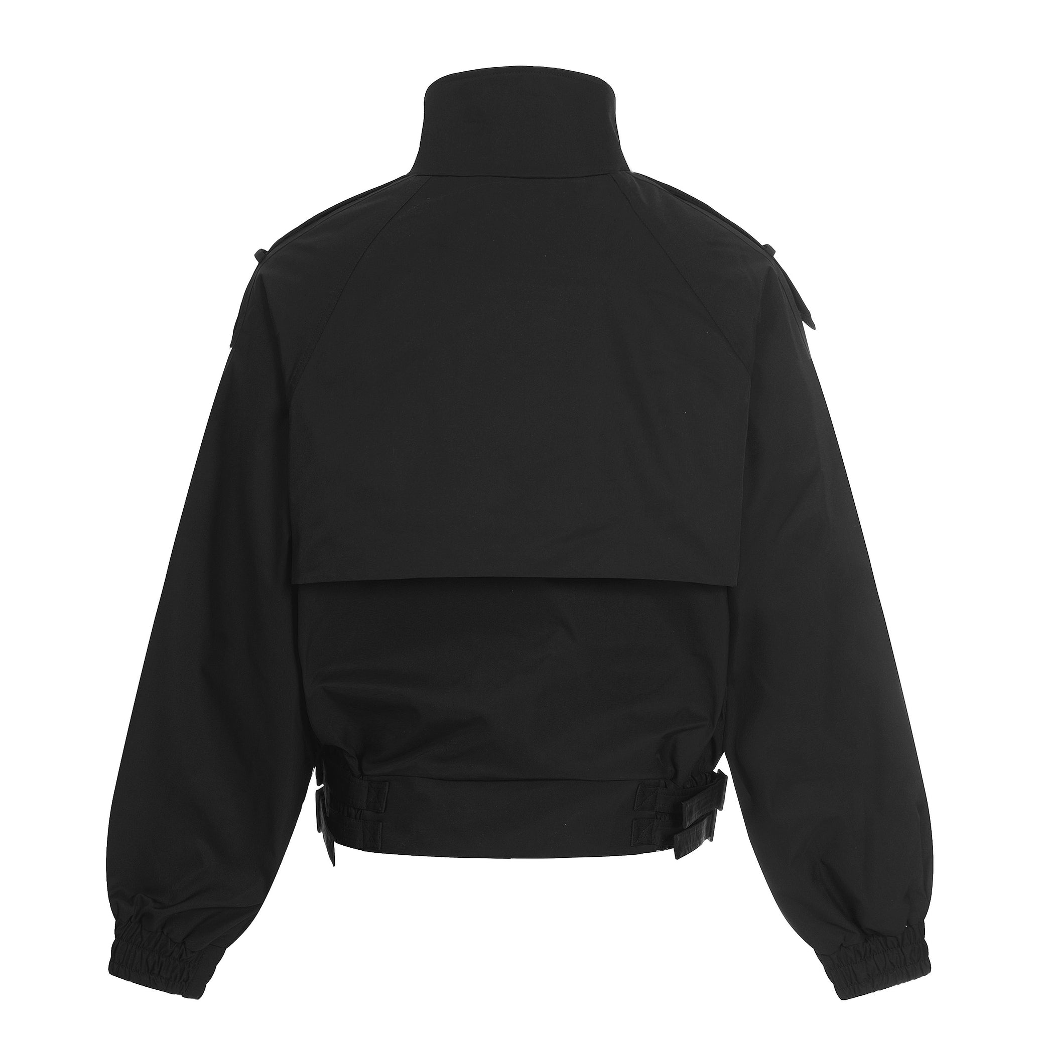 Clothing details: Stand collar design, button-front closure, utility-style chest pocket, elasticated cuffs, adjustable hem straps, relaxed cropped fit.