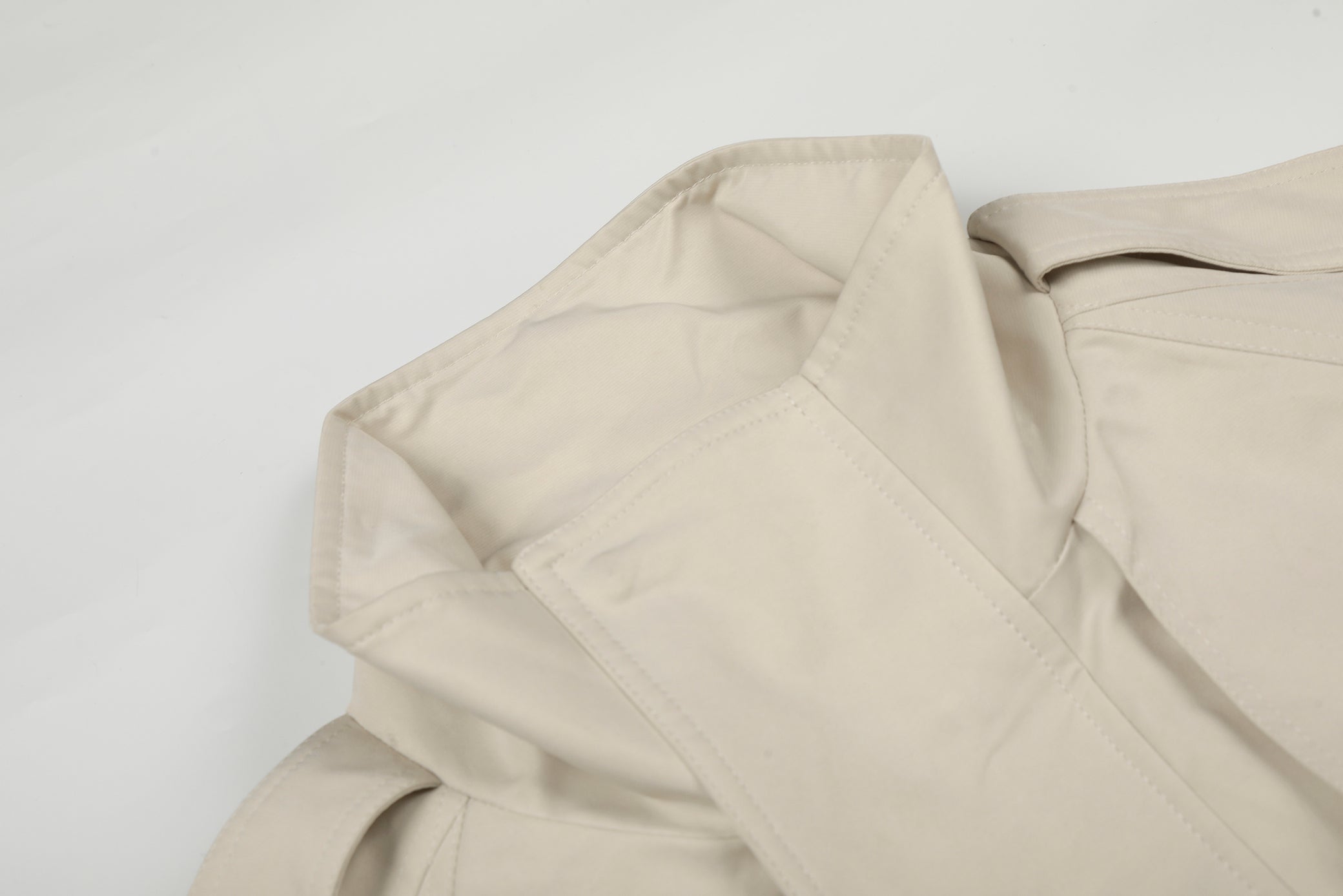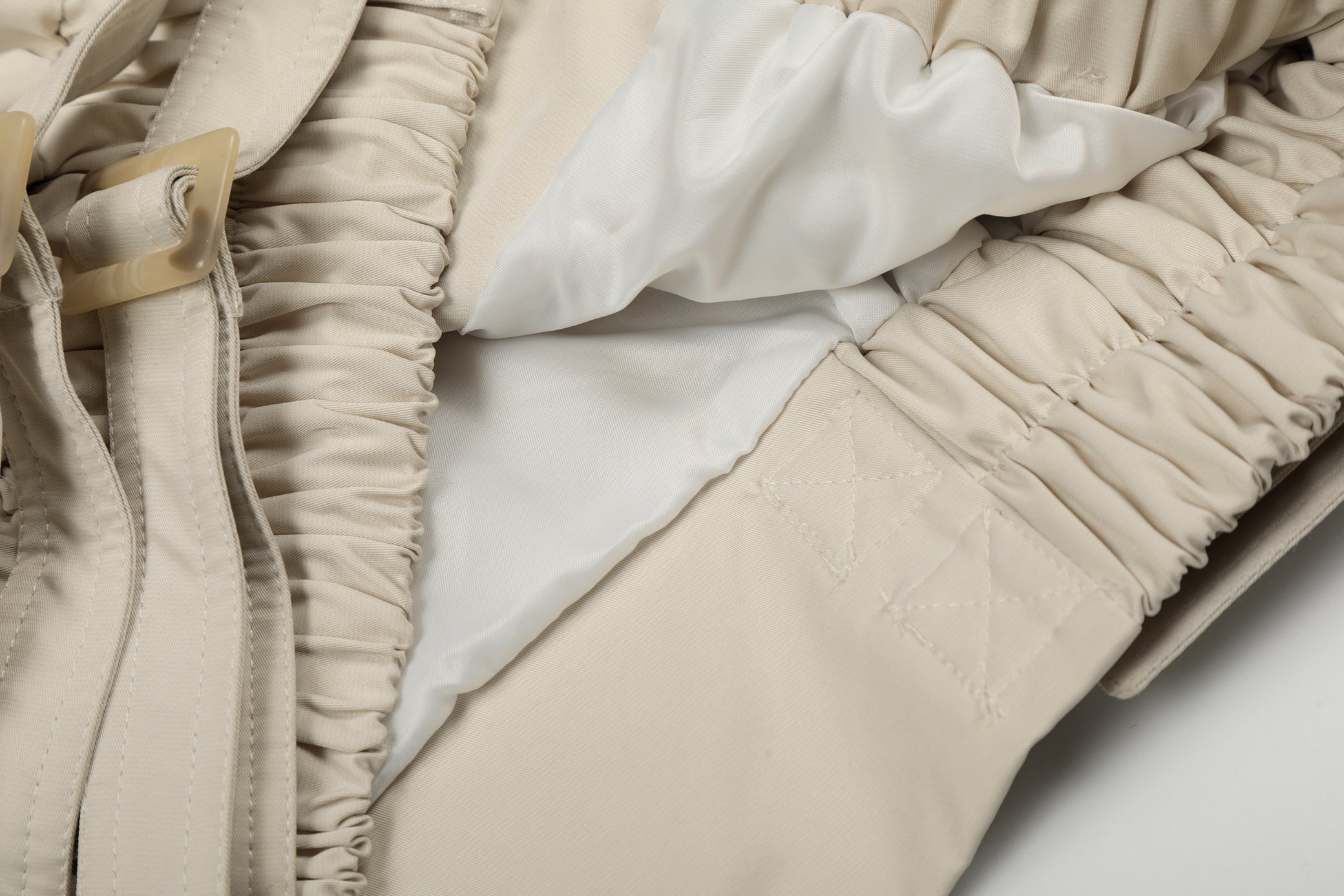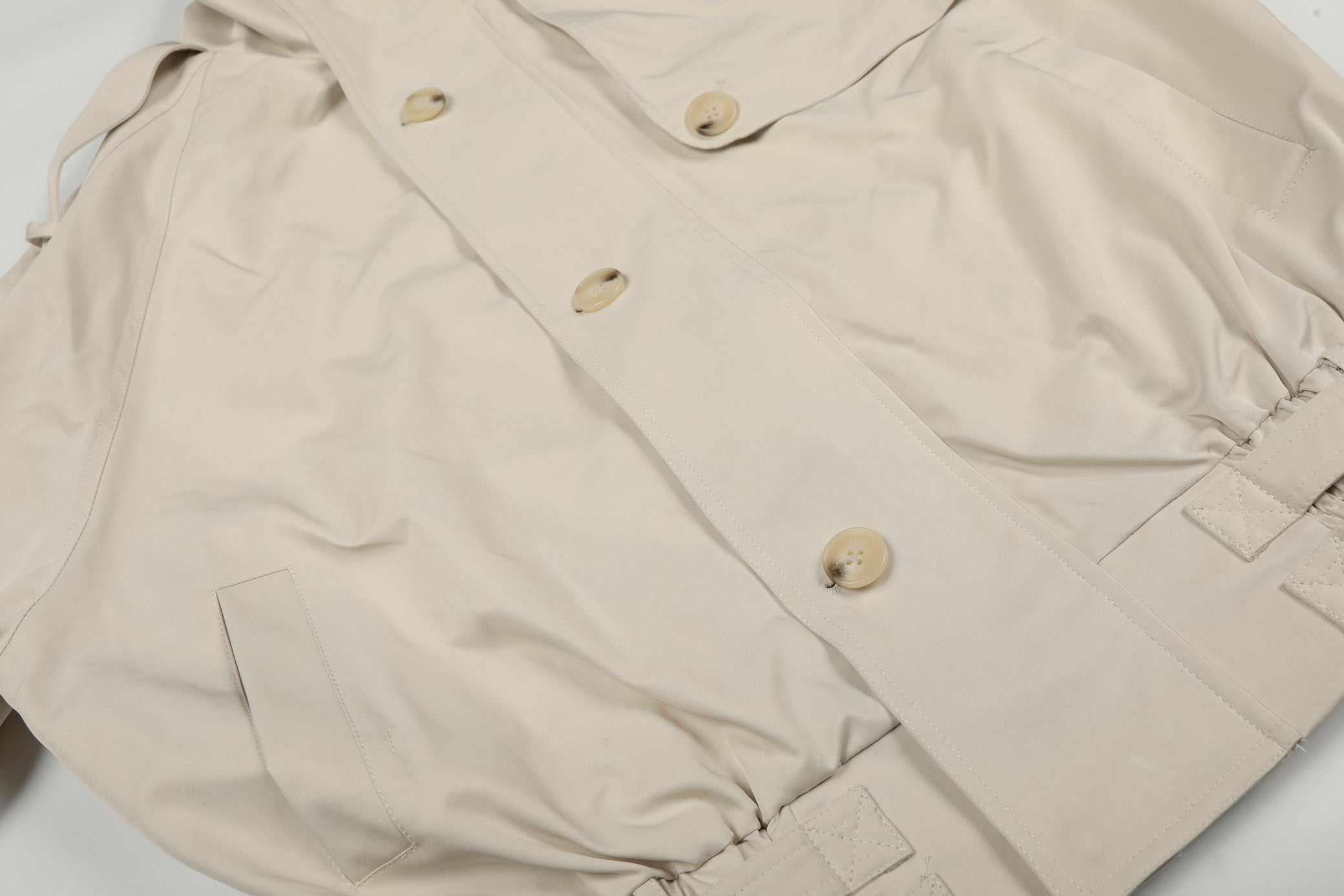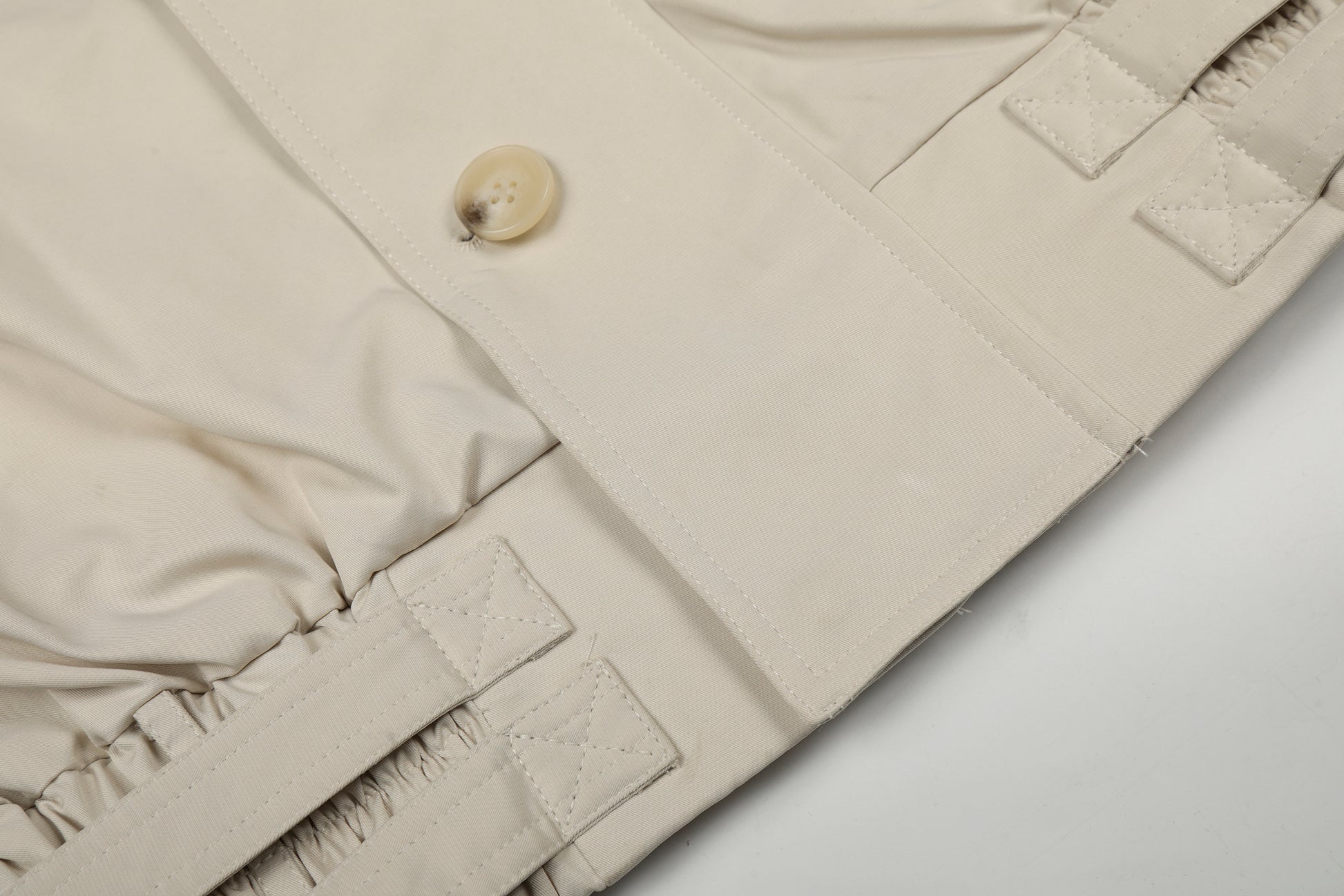 Clothing details: Stand collar design, button-front closure, utility-style chest pocket, elasticated cuffs, adjustable hem straps, relaxed cropped fit.