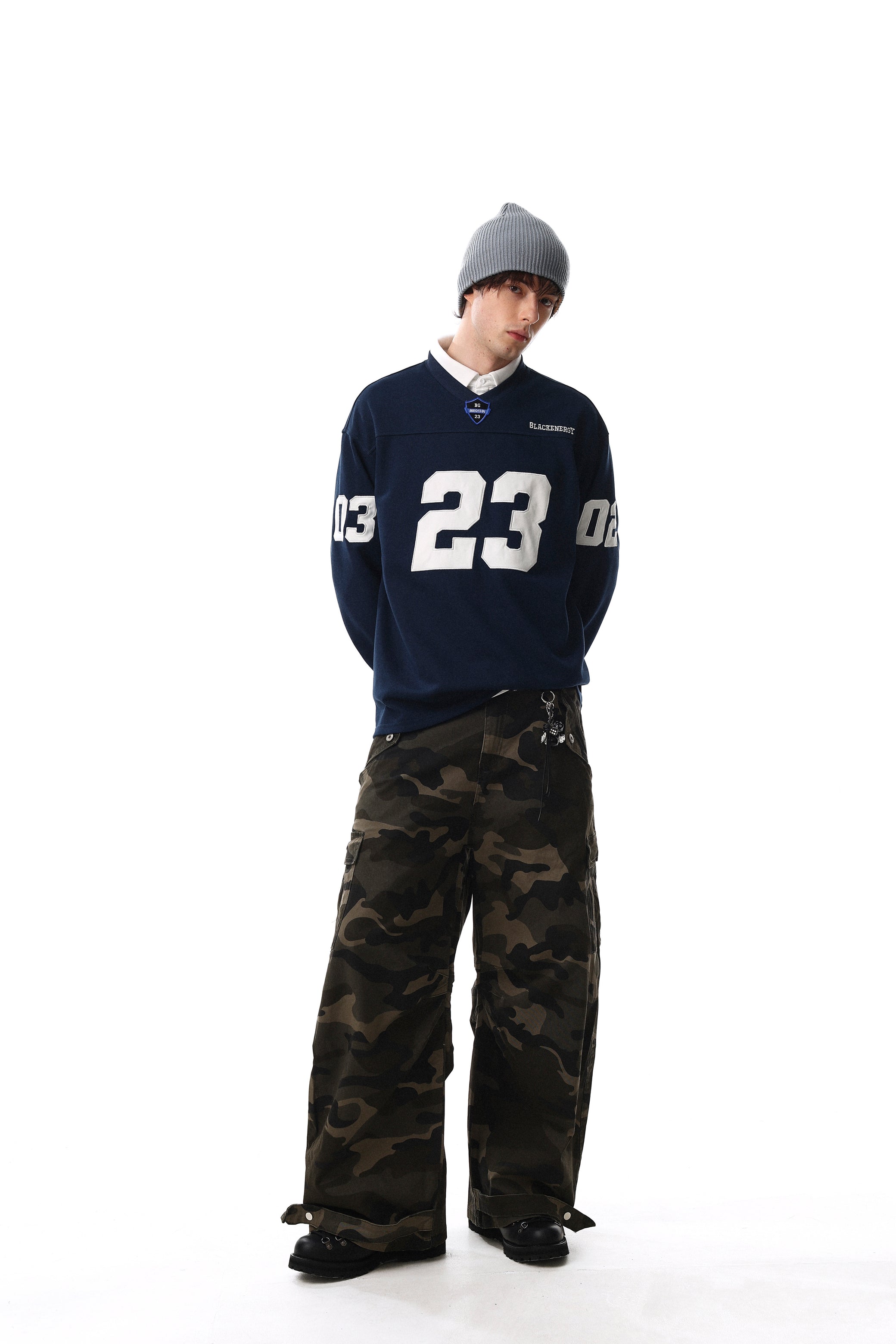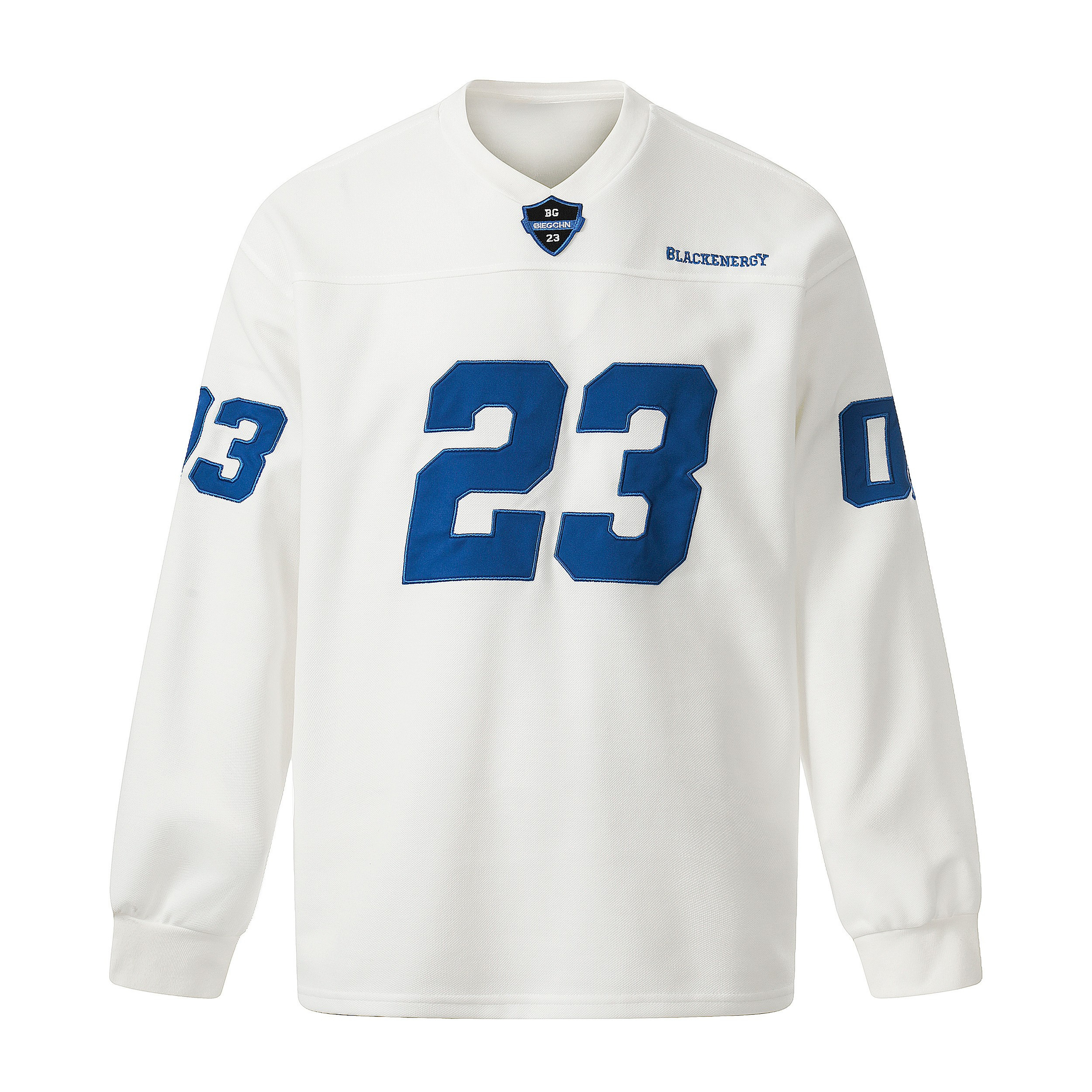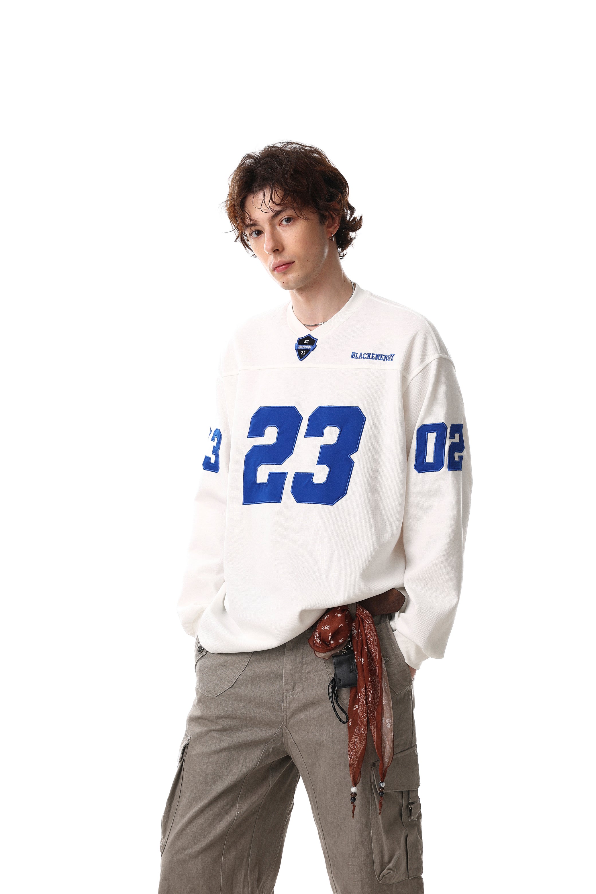 Clothing details: Front and sleeve number graphics, varsity-inspired design, long-sleeve silhouette.