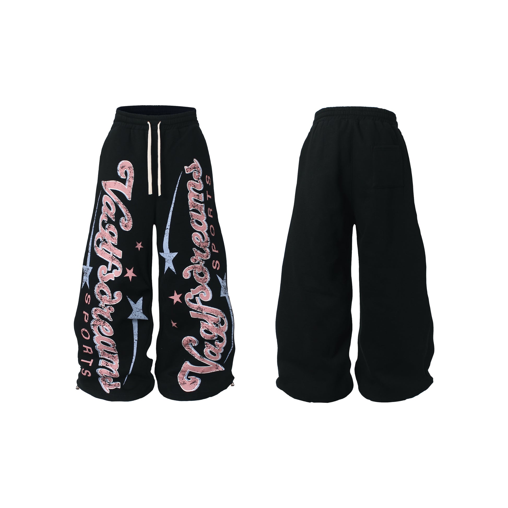 Clothing Details: Oversized fit, brushed fleece interior, “Vast Dreams Sports” letter print, side star graphics, elastic waistband with drawstring, adjustable ankle toggles