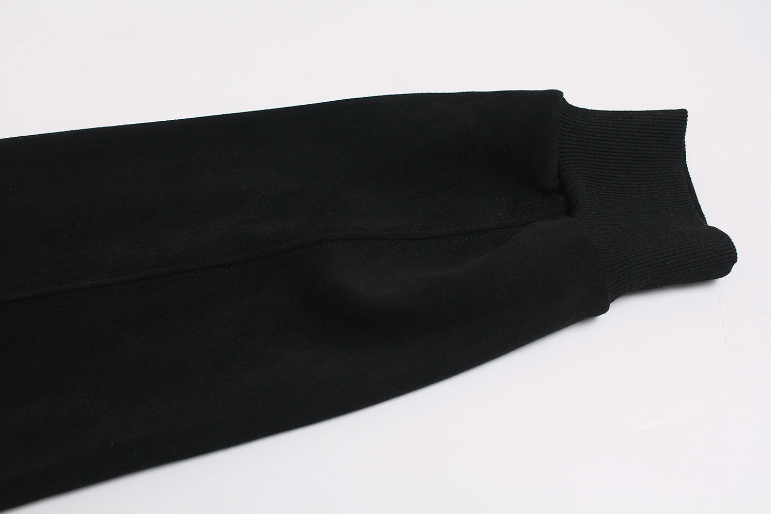 Clothing details: Suede texture, structured seams, full-zip front, ribbed cuffs and hem, embroidered lettering, relaxed fit.