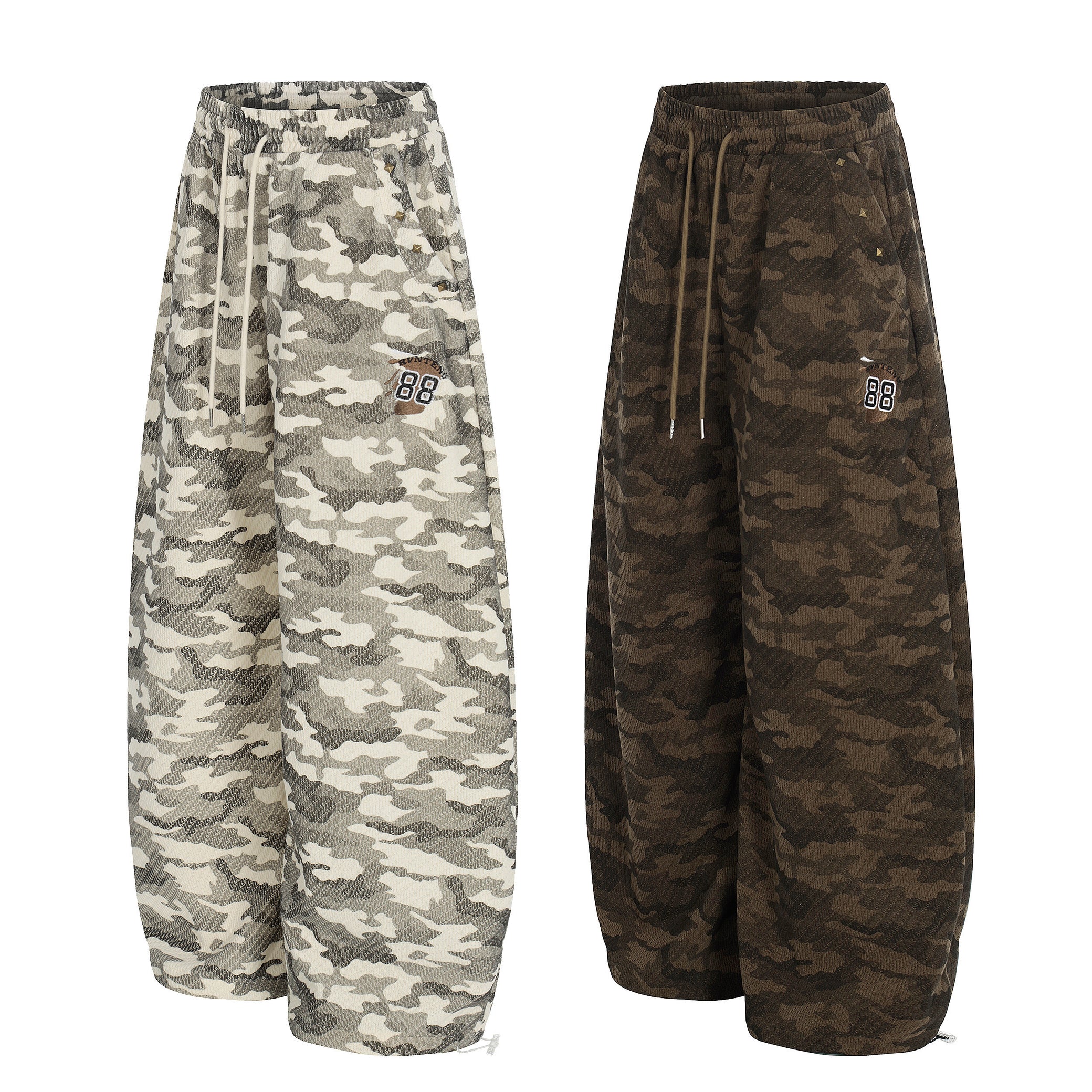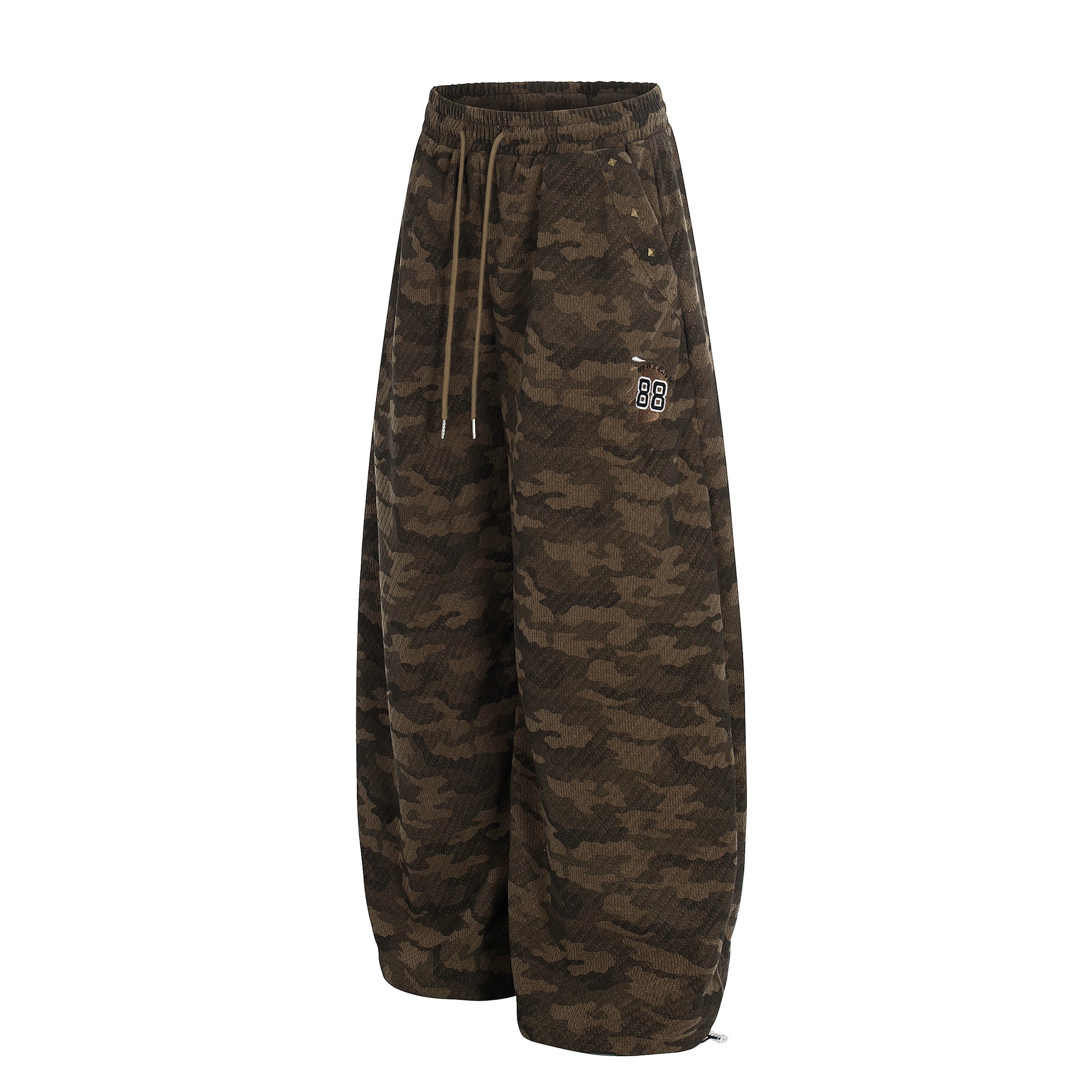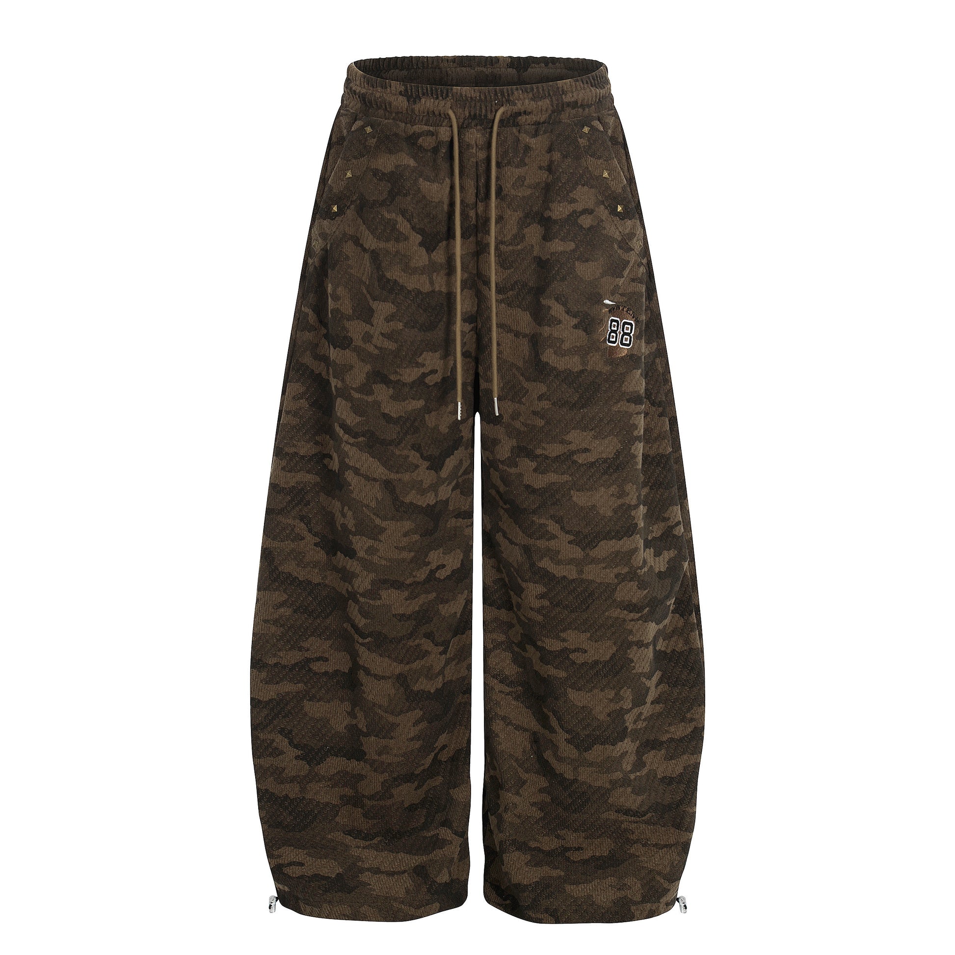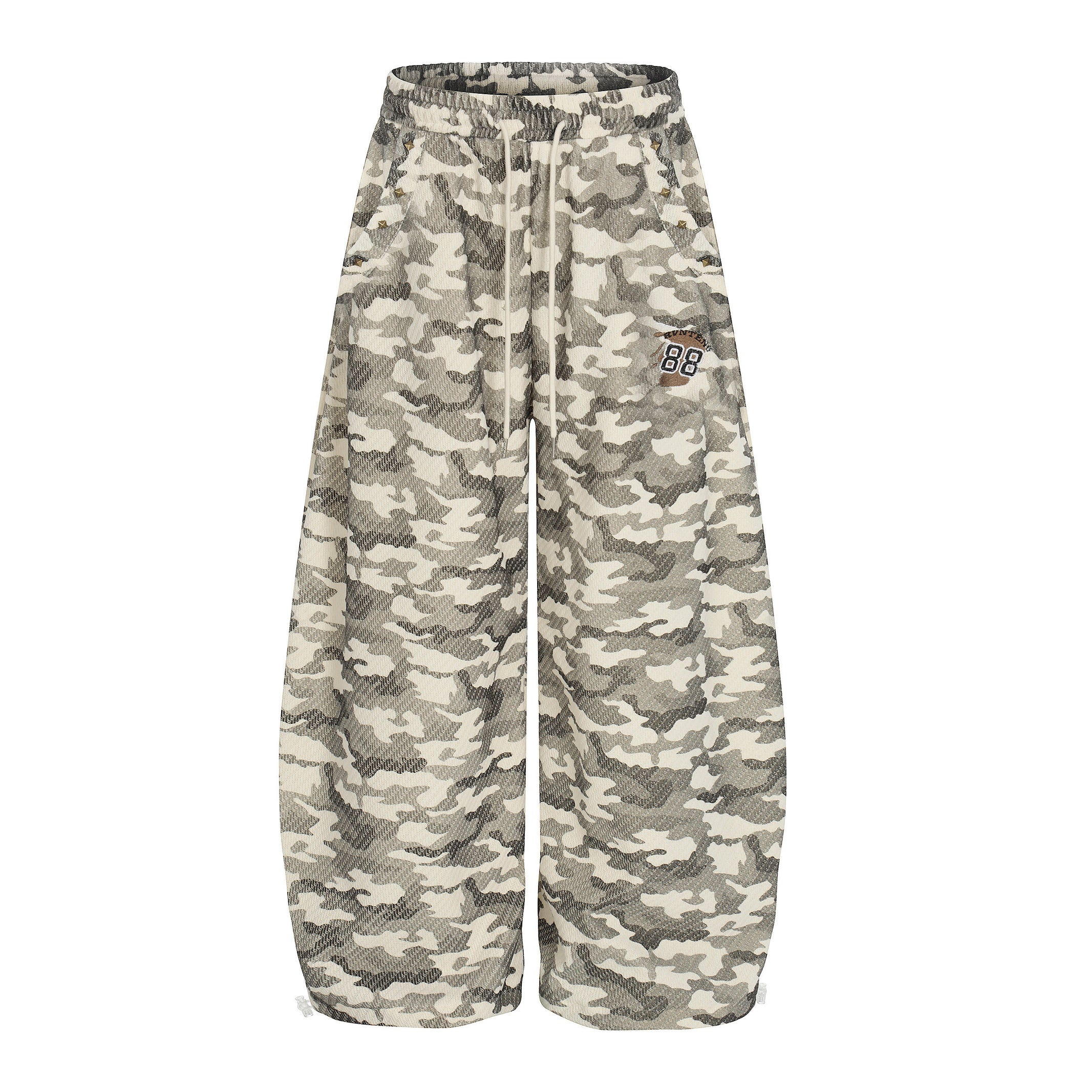 Clothing details: Vintage camo print finish, elastic waistband with adjustable drawstring, wide-leg cut with stacked drape, soft yet structured athletic fabric, breathable and comfortable for all-day wear, small embroidered number detail, relaxed streetwear fit with strong silhouette presence.