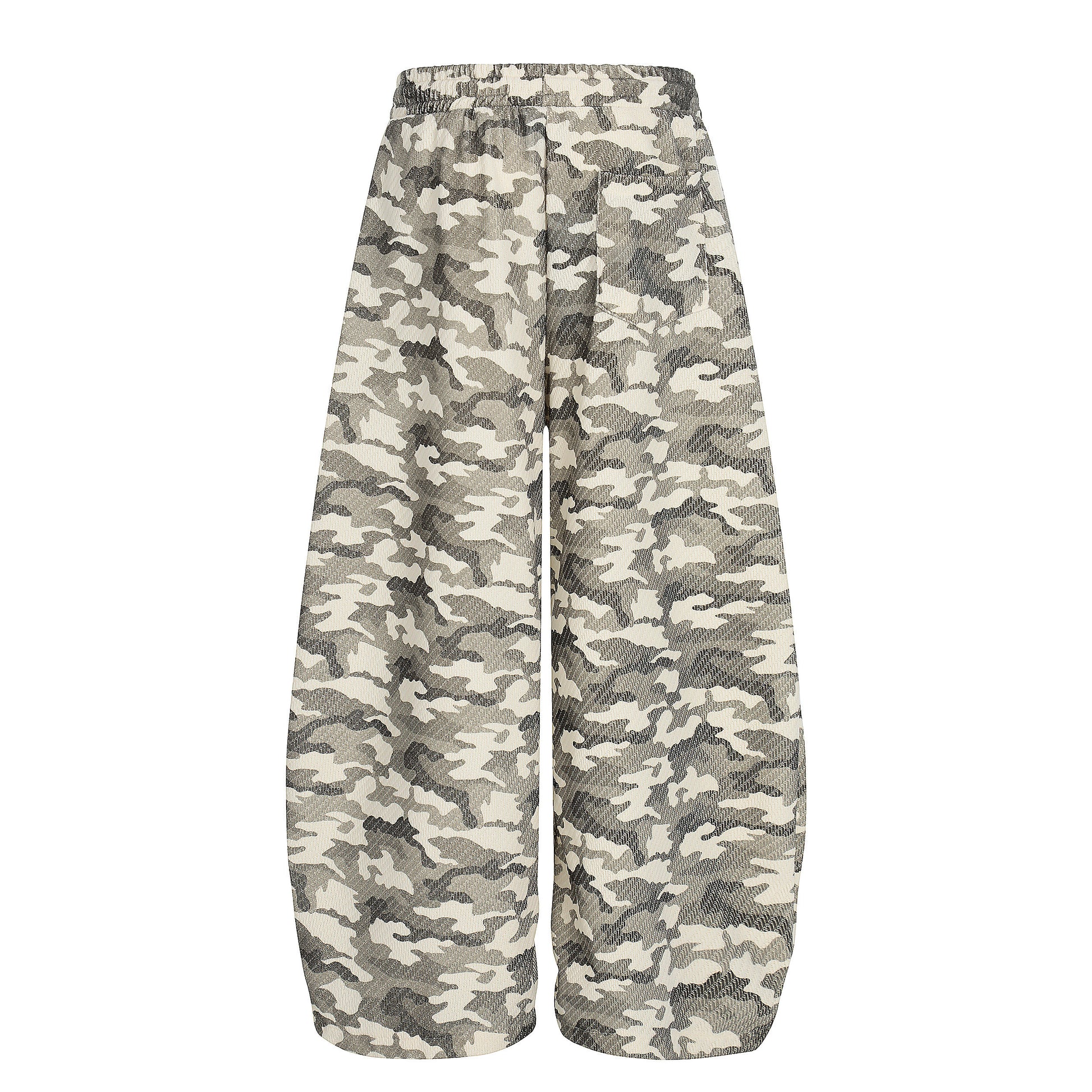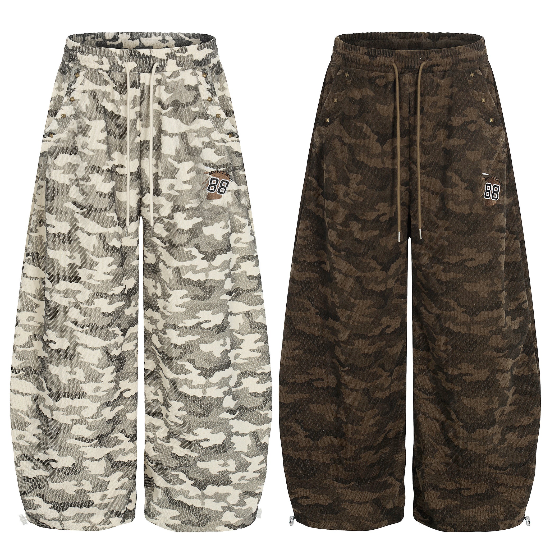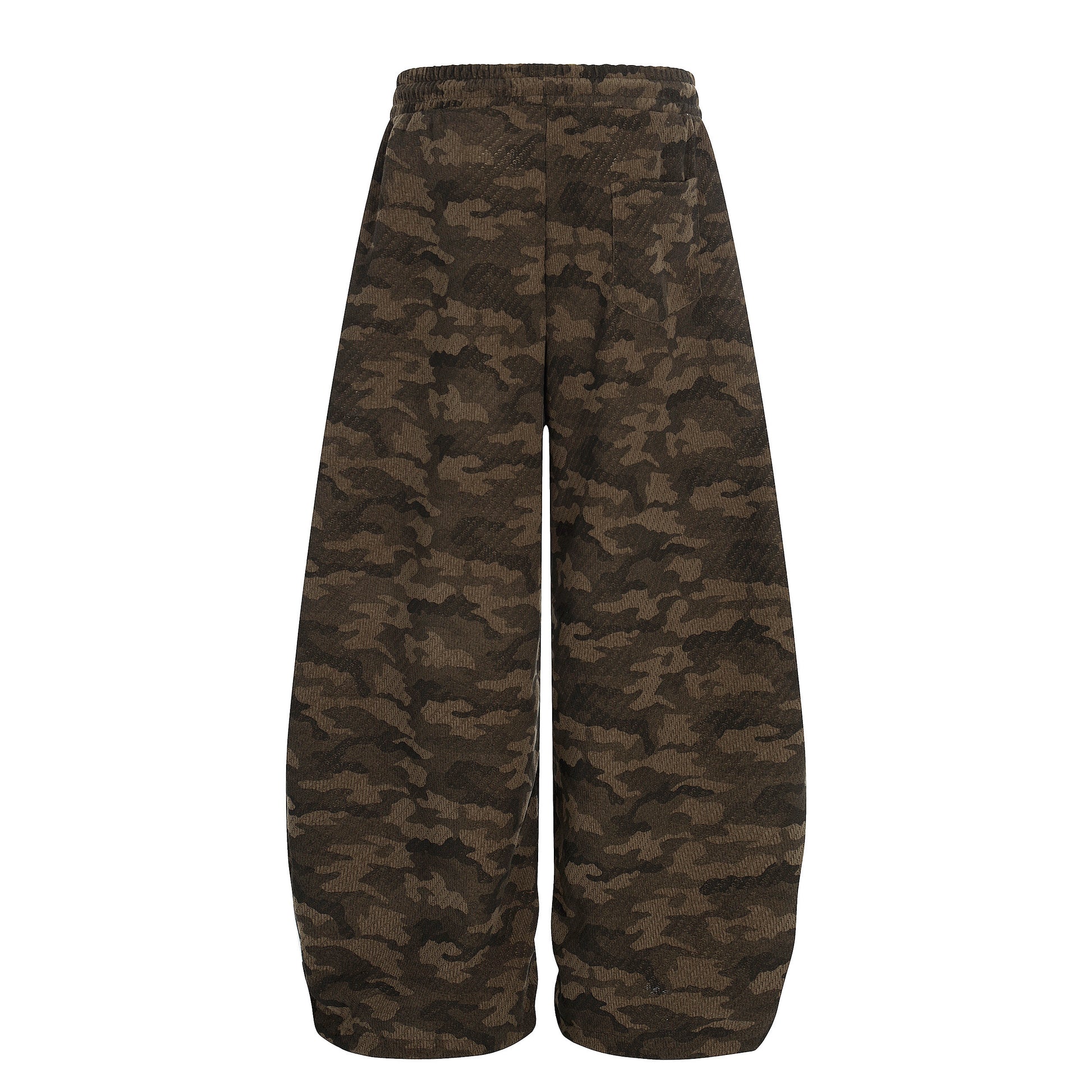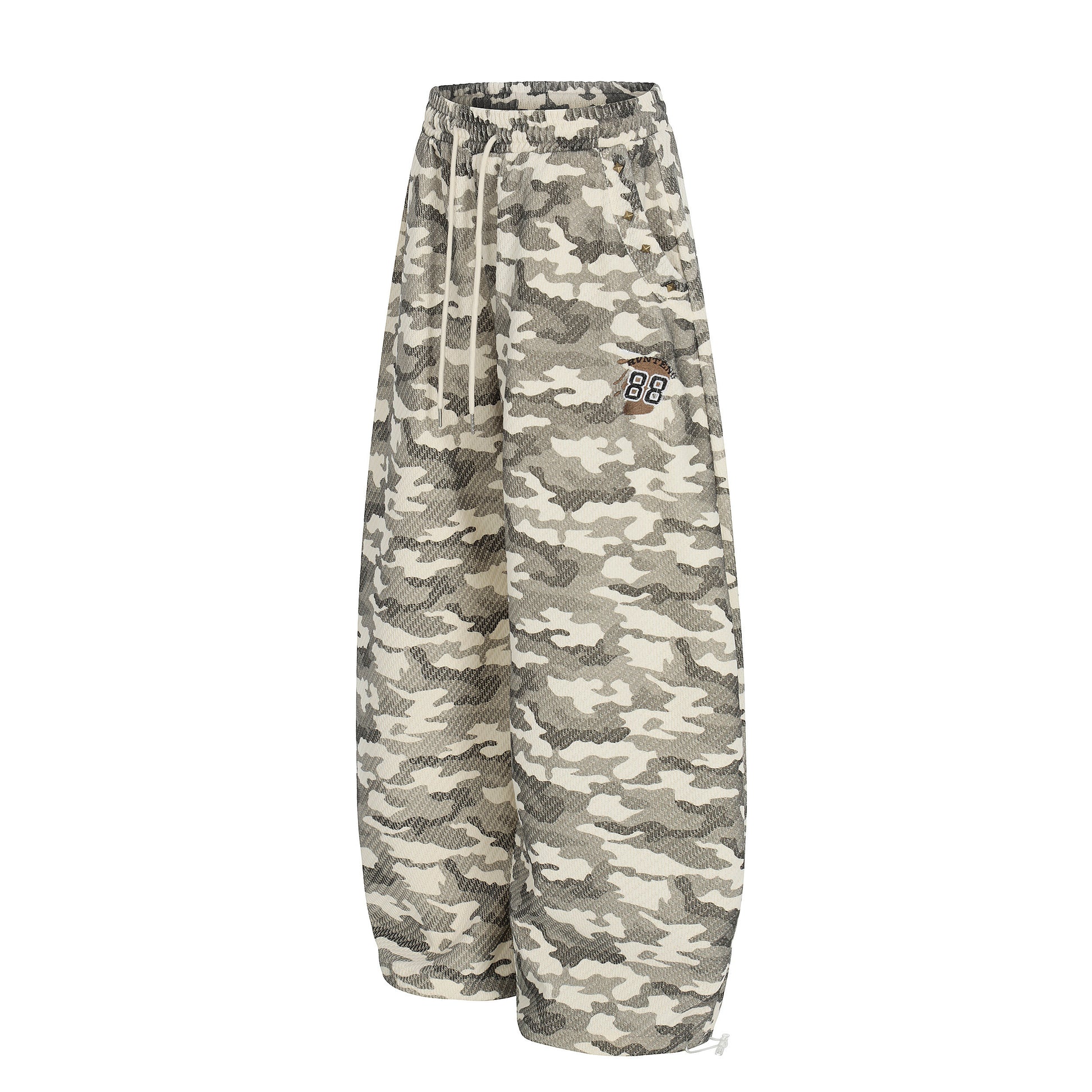 Clothing details: Vintage camo print finish, elastic waistband with adjustable drawstring, wide-leg cut with stacked drape, soft yet structured athletic fabric, breathable and comfortable for all-day wear, small embroidered number detail, relaxed streetwear fit with strong silhouette presence.