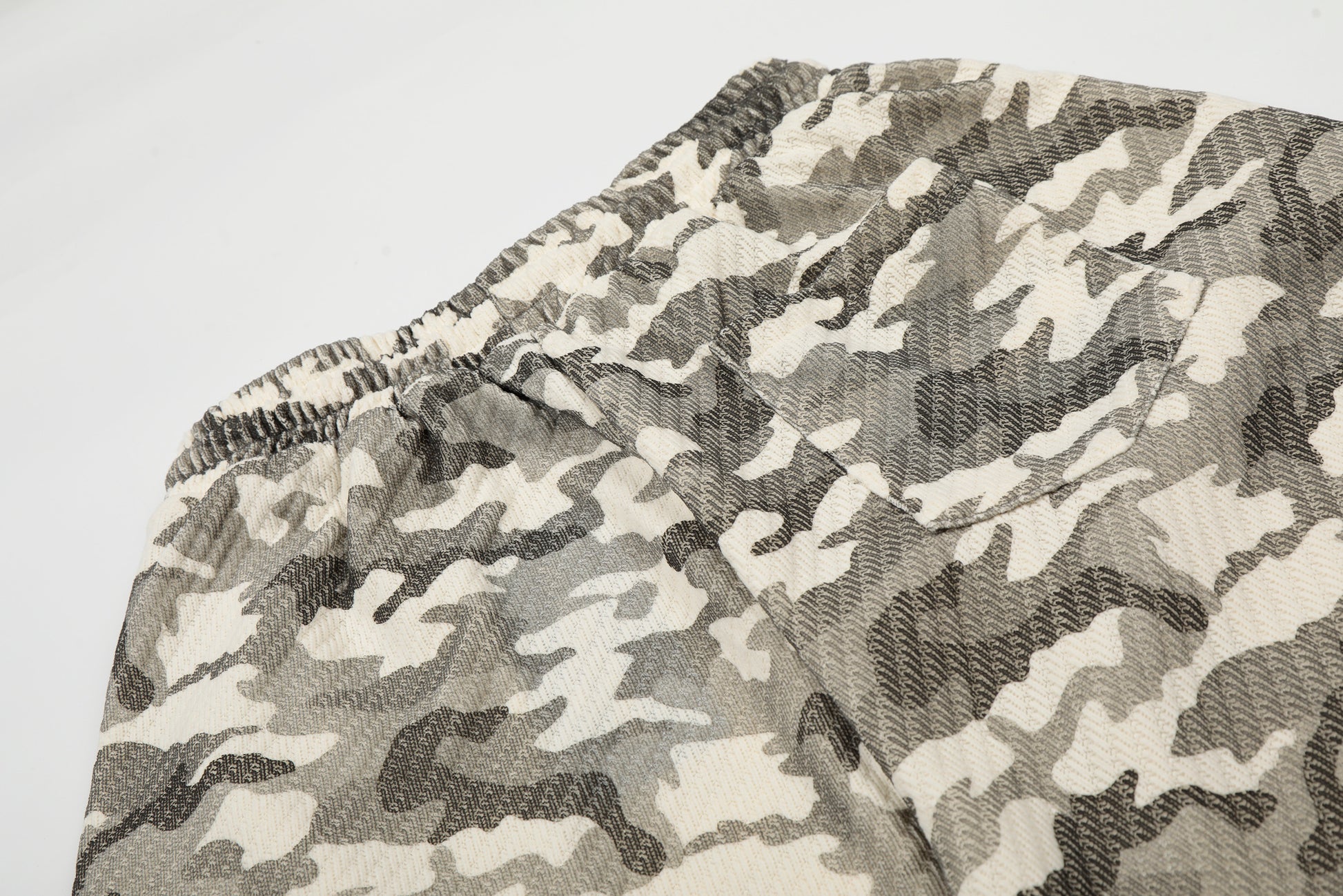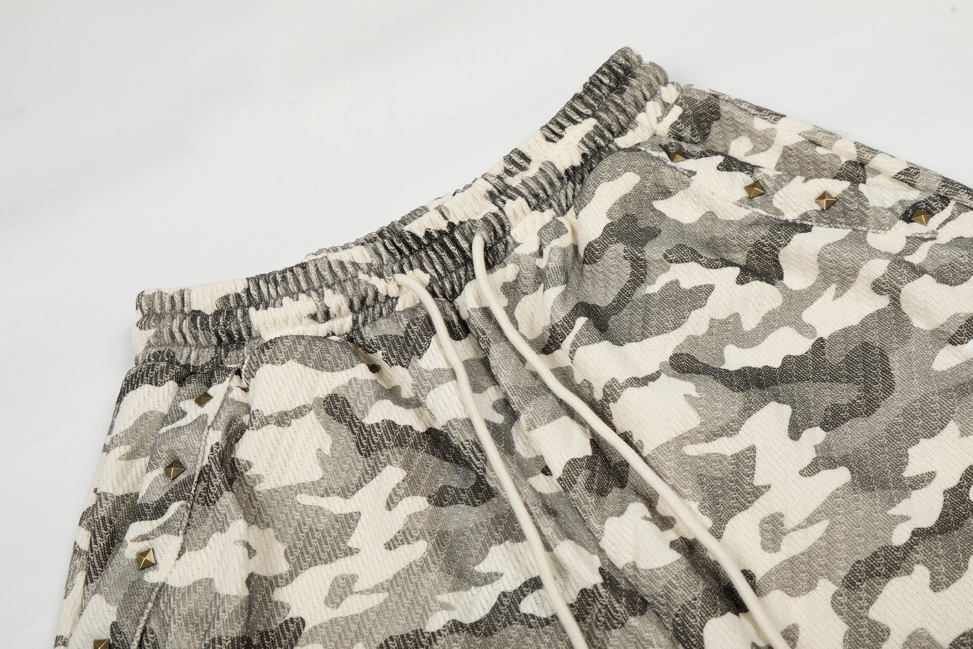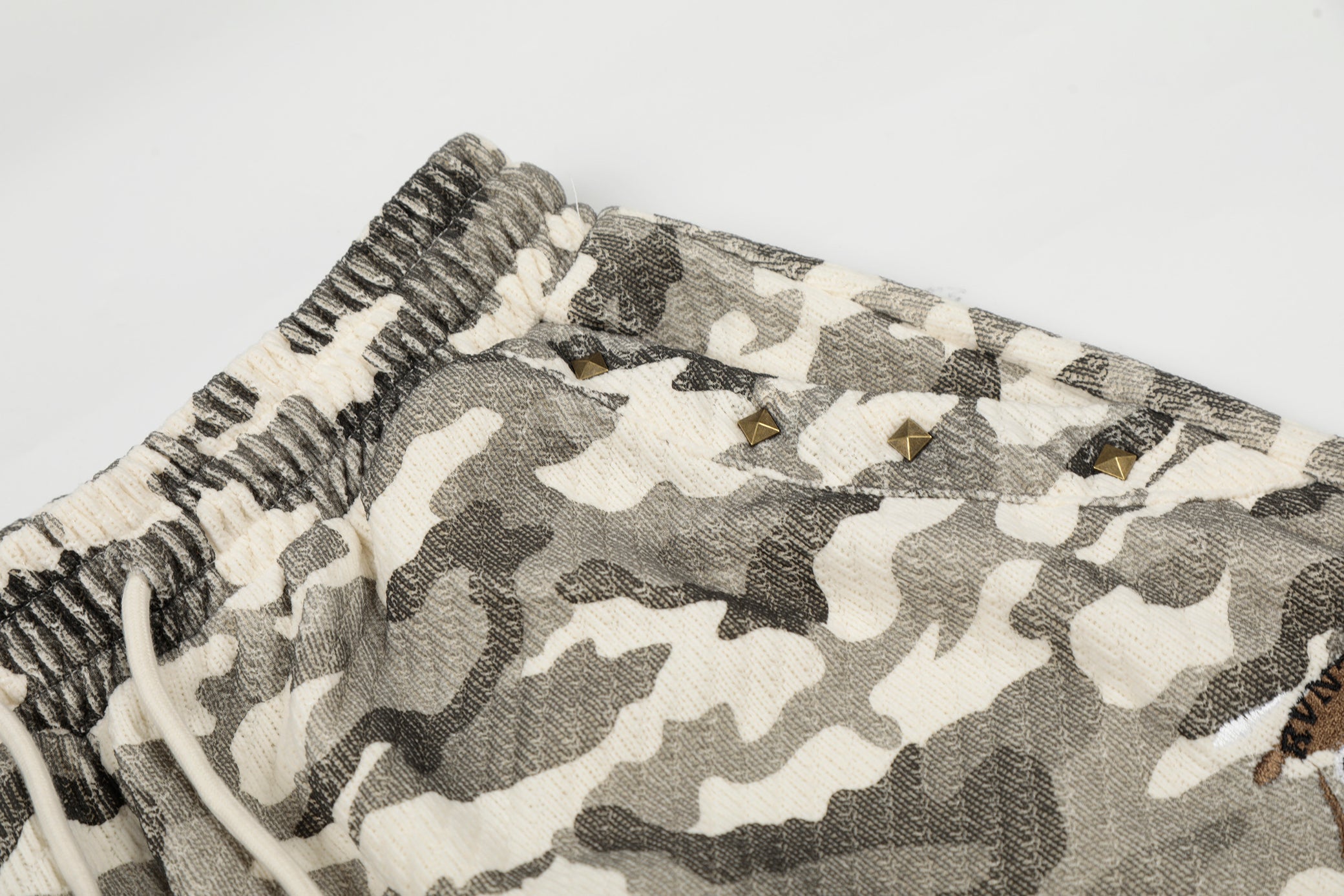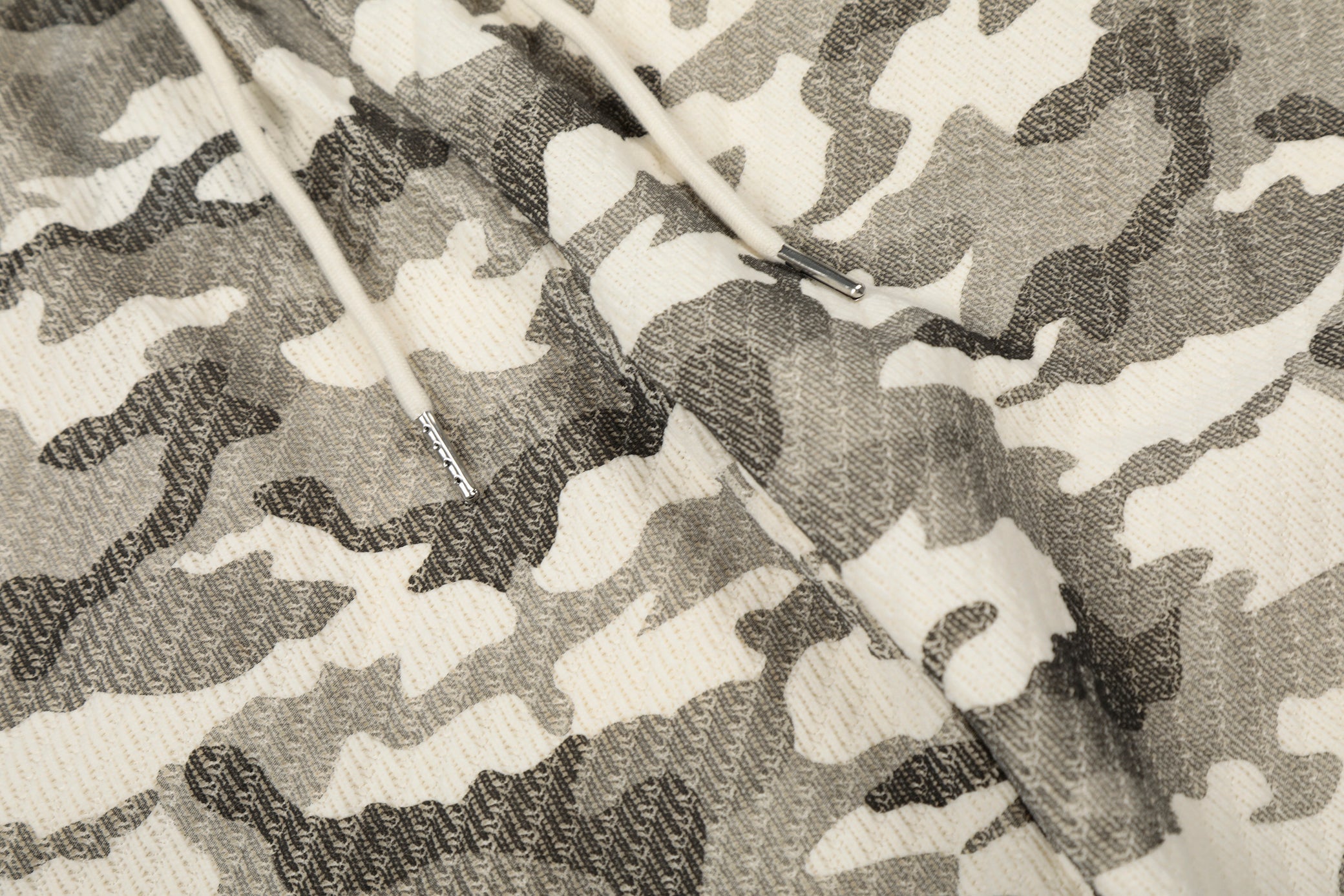 Clothing details: Vintage camo print finish, elastic waistband with adjustable drawstring, wide-leg cut with stacked drape, soft yet structured athletic fabric, breathable and comfortable for all-day wear, small embroidered number detail, relaxed streetwear fit with strong silhouette presence.