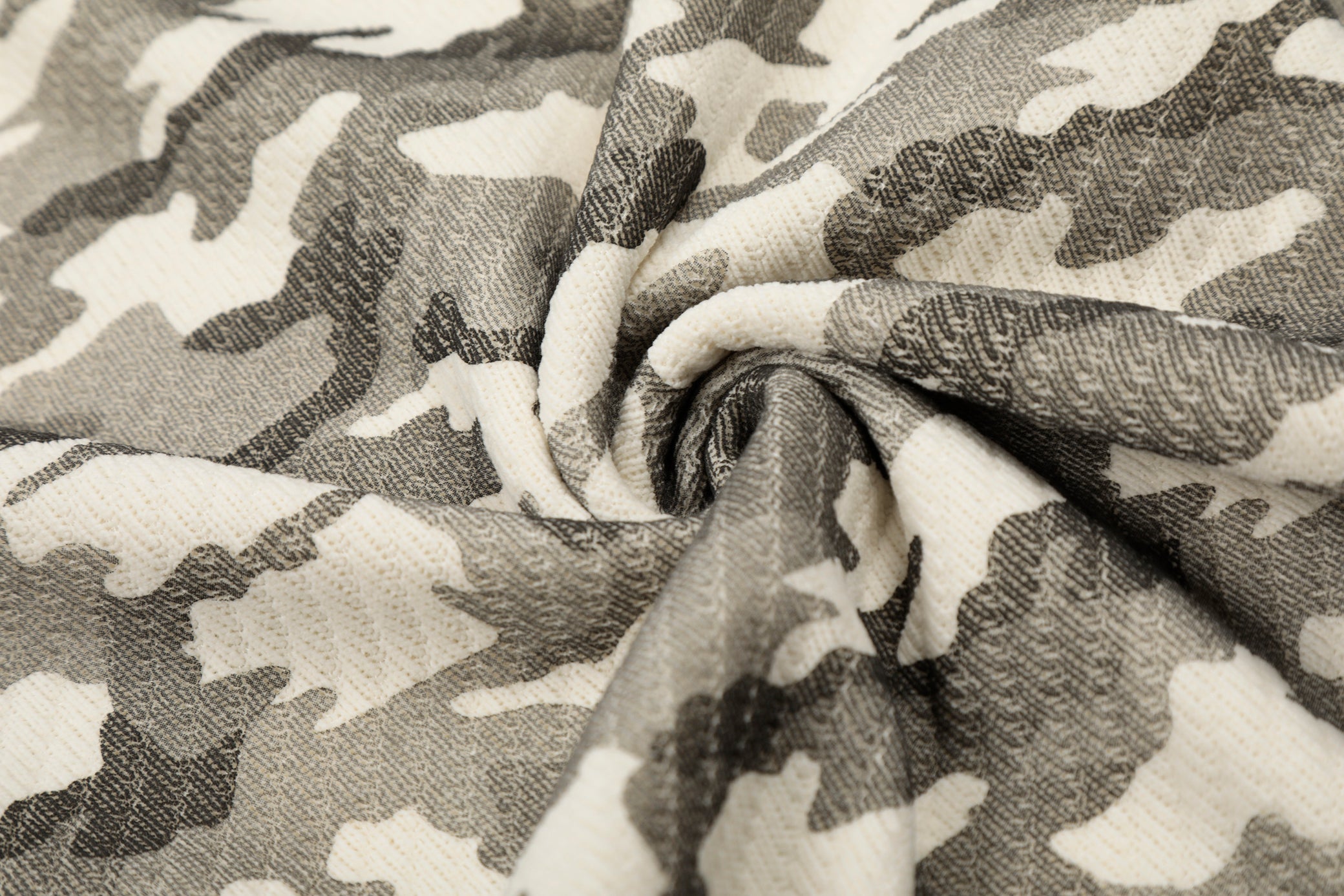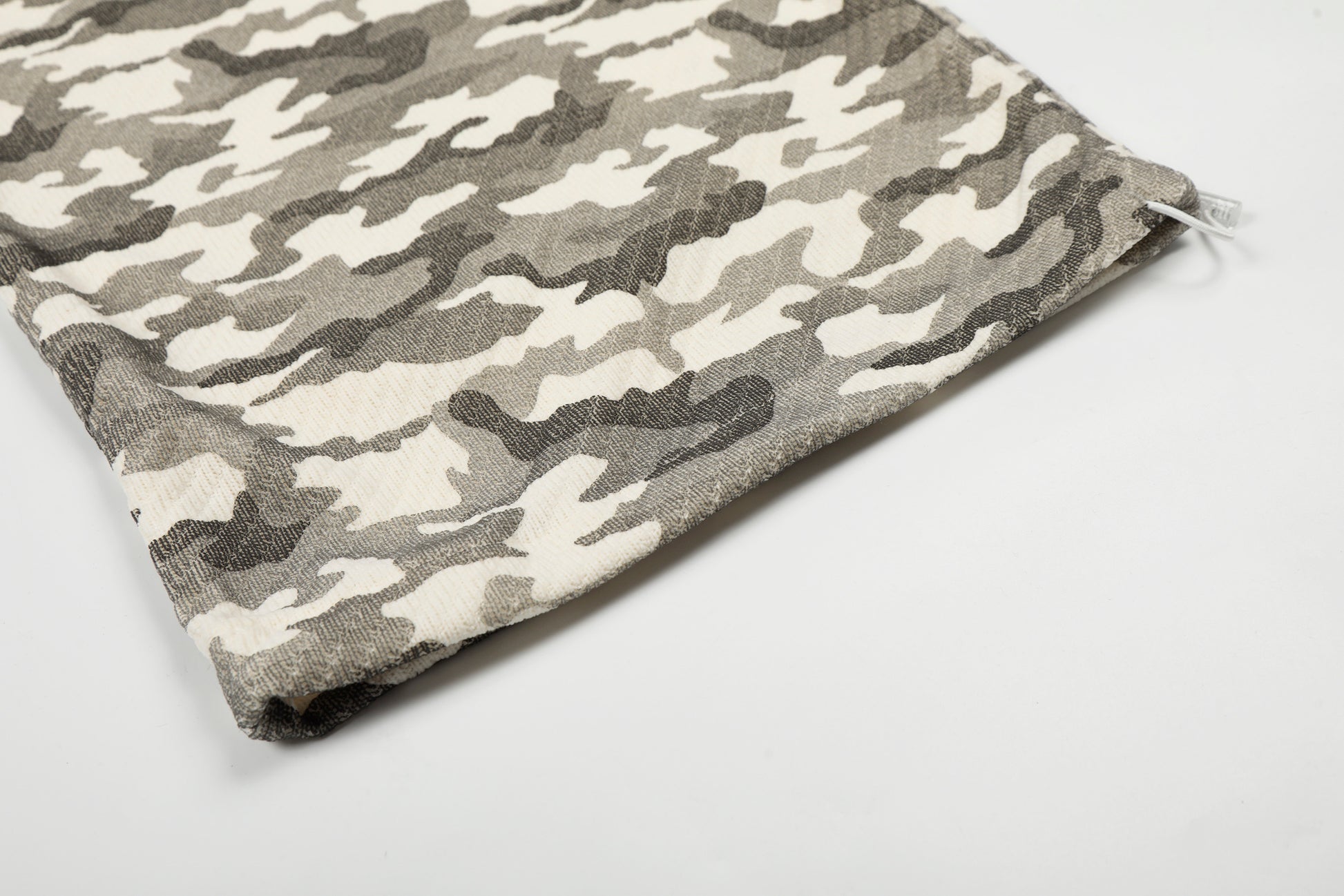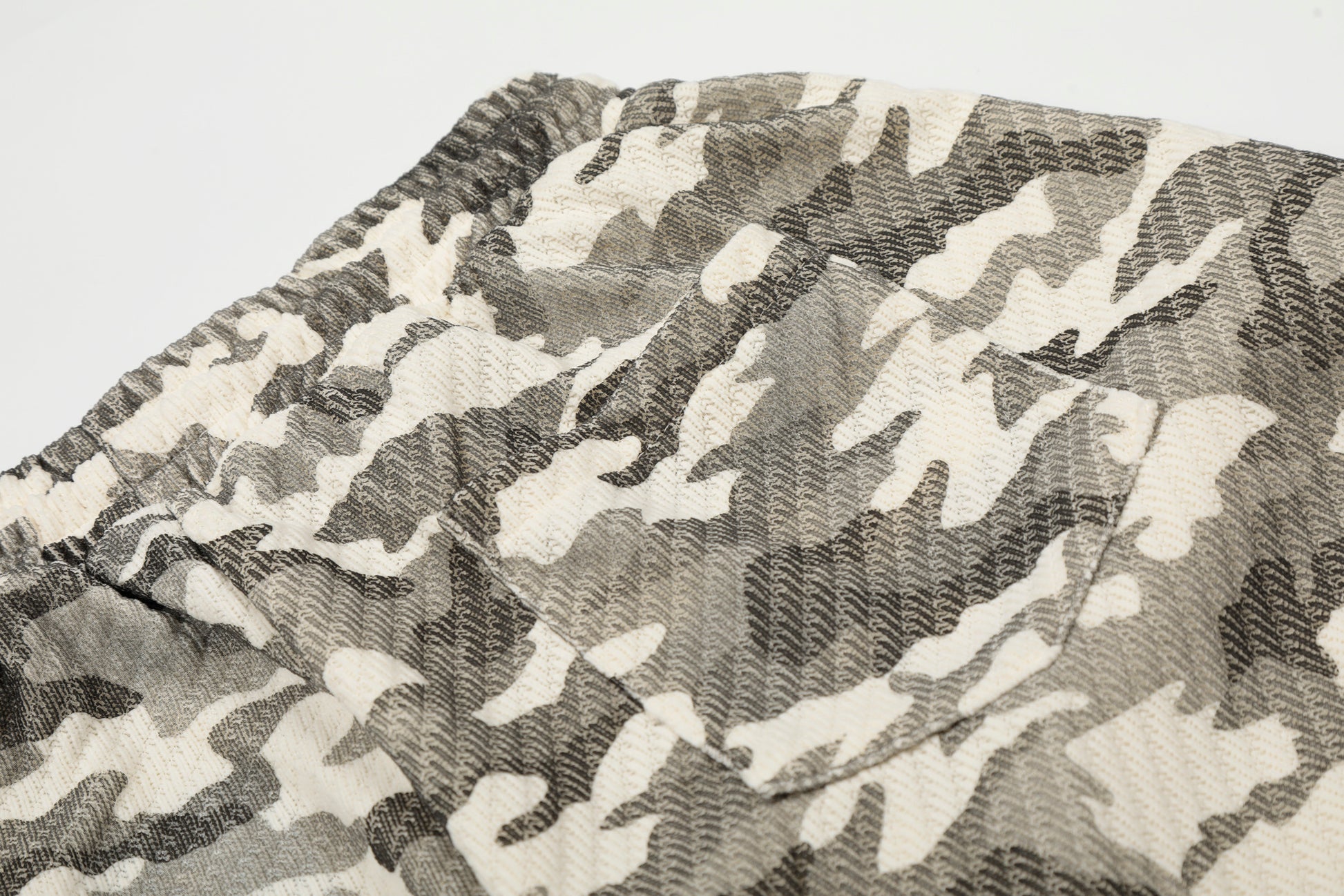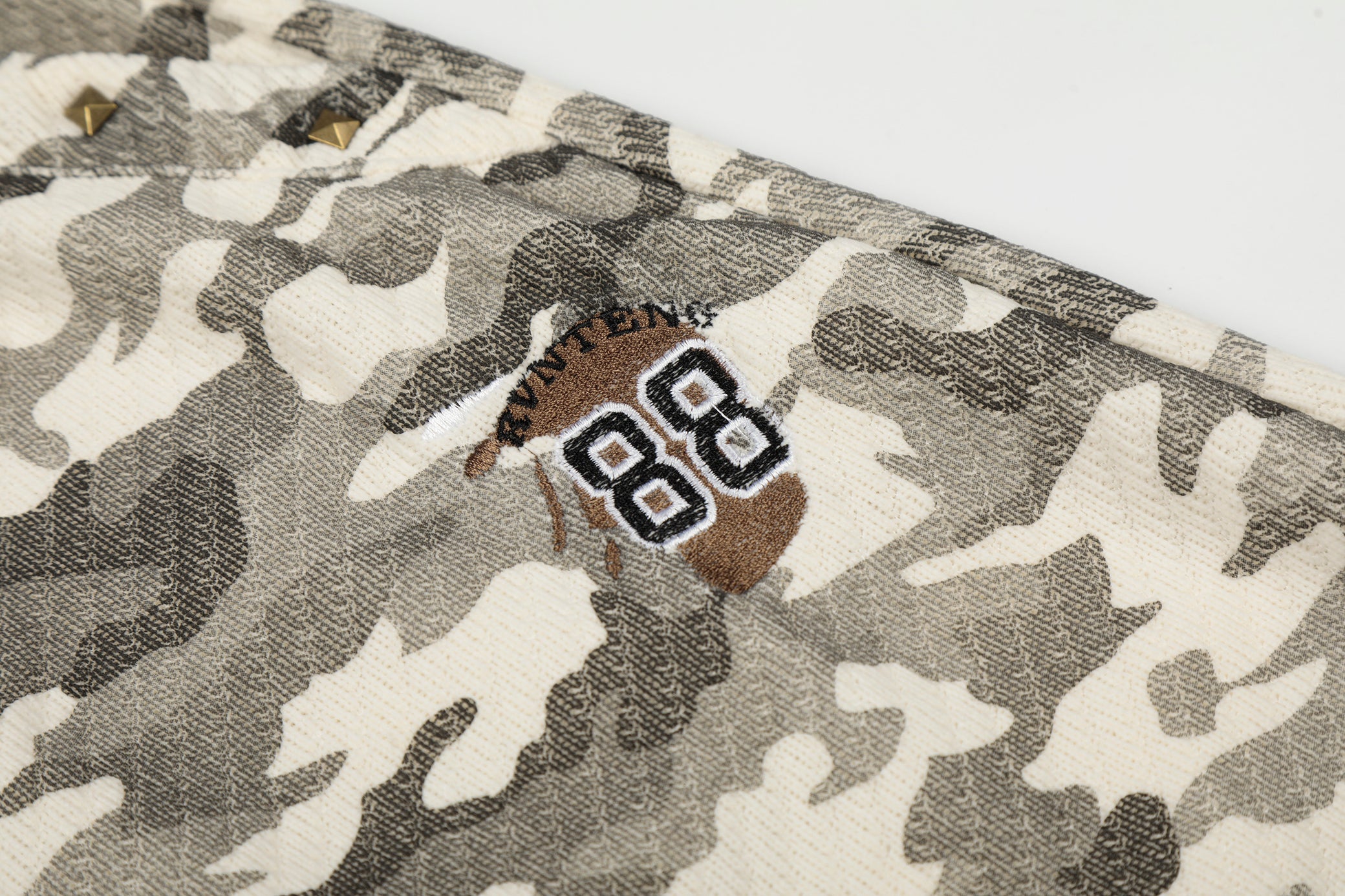 Clothing details: Vintage camo print finish, elastic waistband with adjustable drawstring, wide-leg cut with stacked drape, soft yet structured athletic fabric, breathable and comfortable for all-day wear, small embroidered number detail, relaxed streetwear fit with strong silhouette presence.