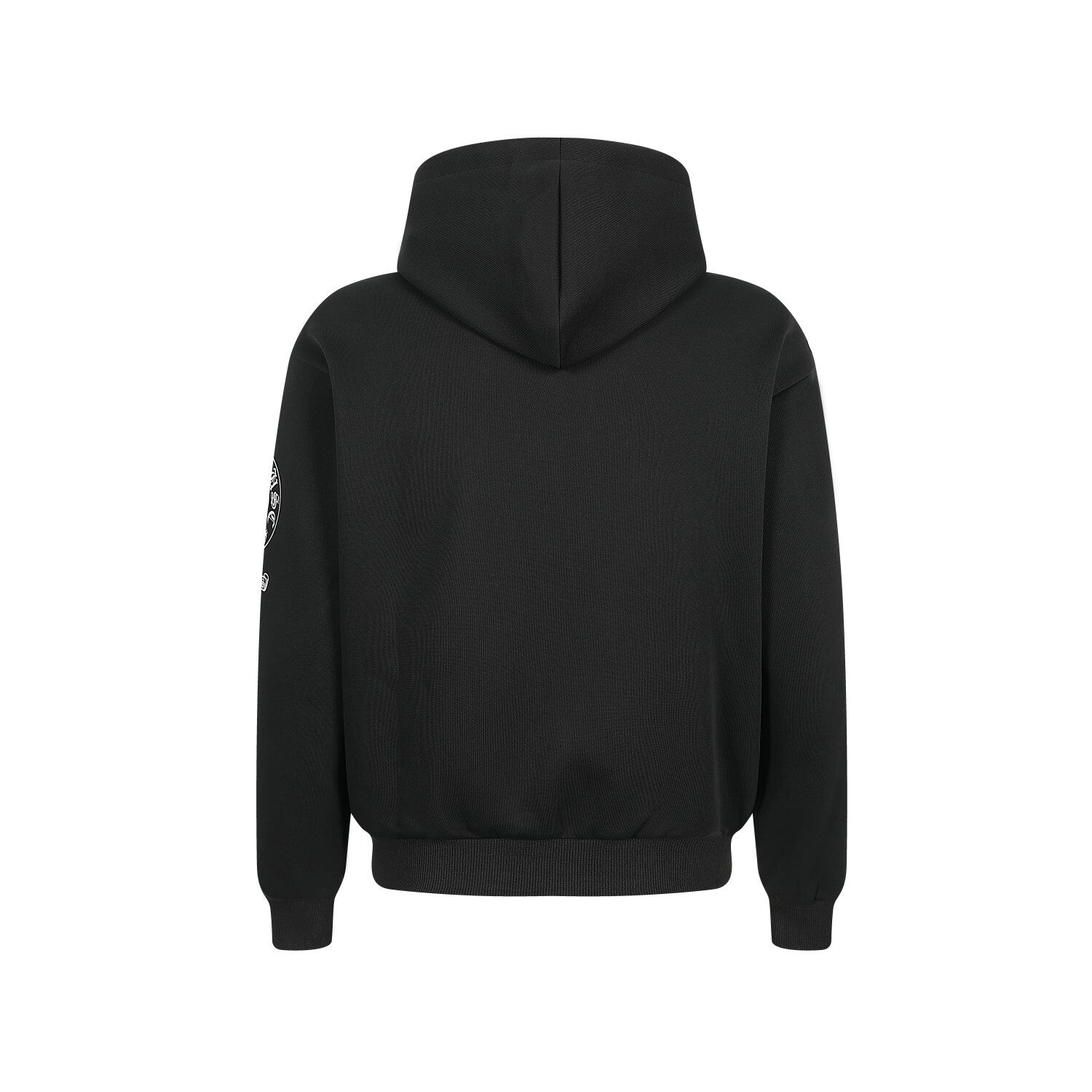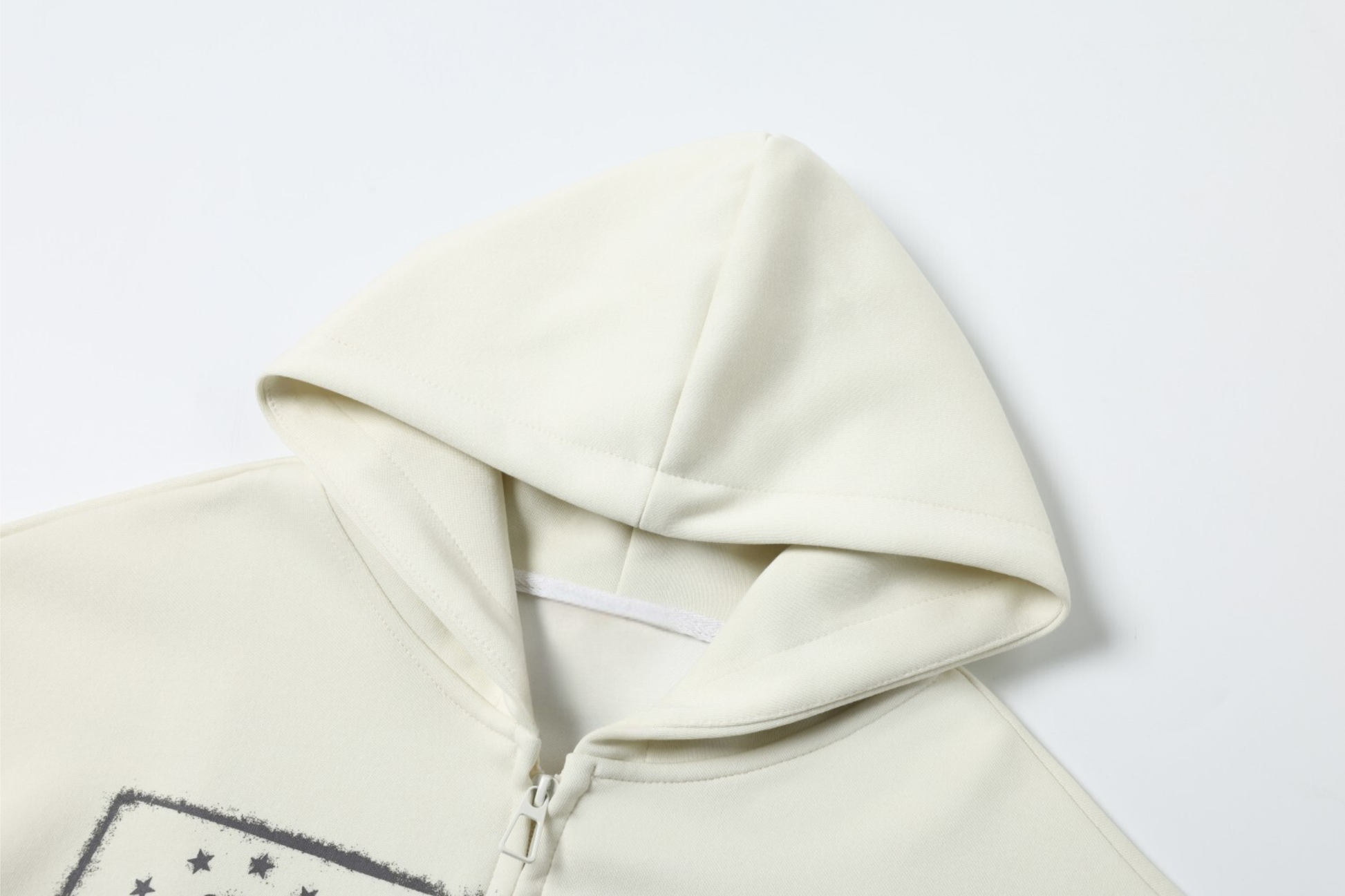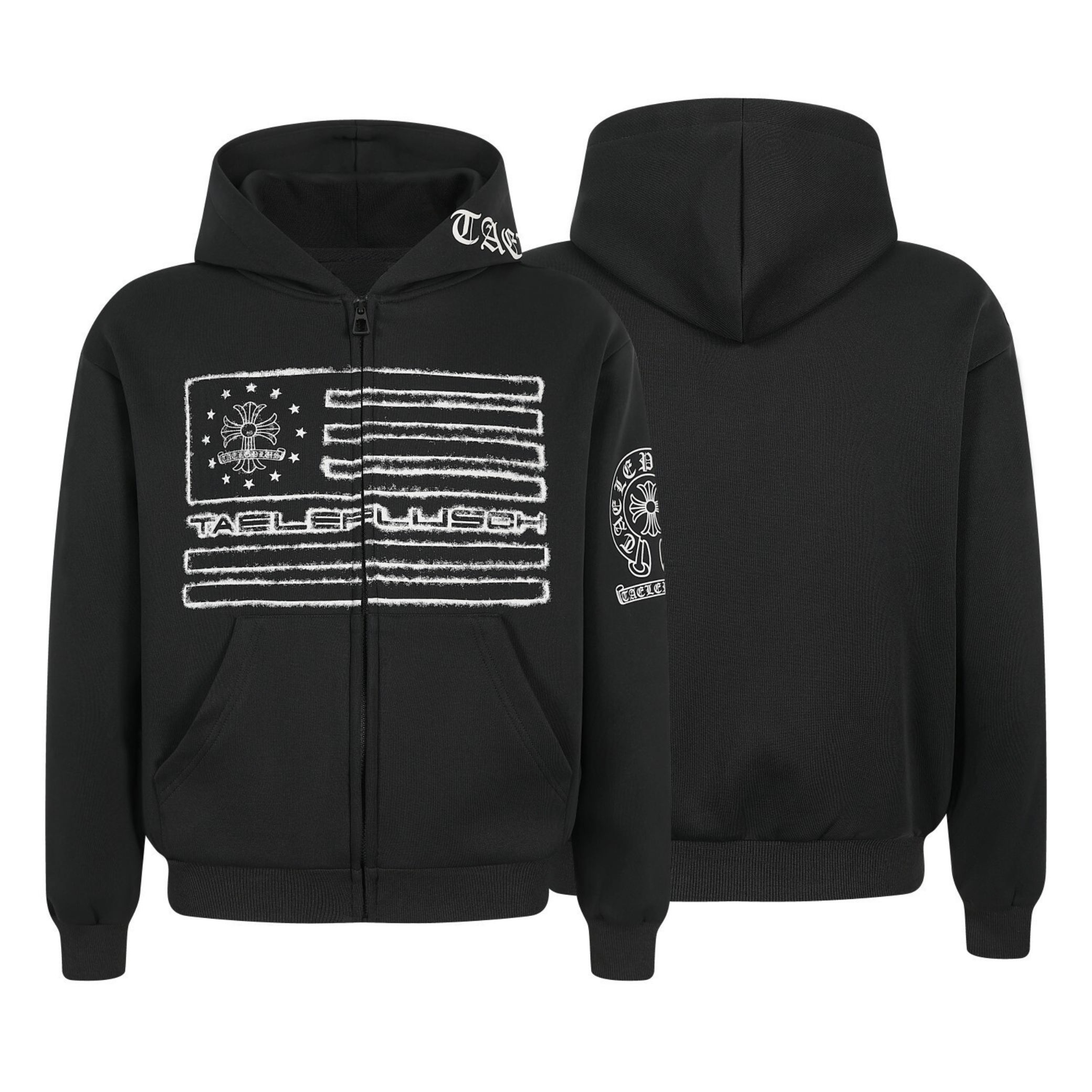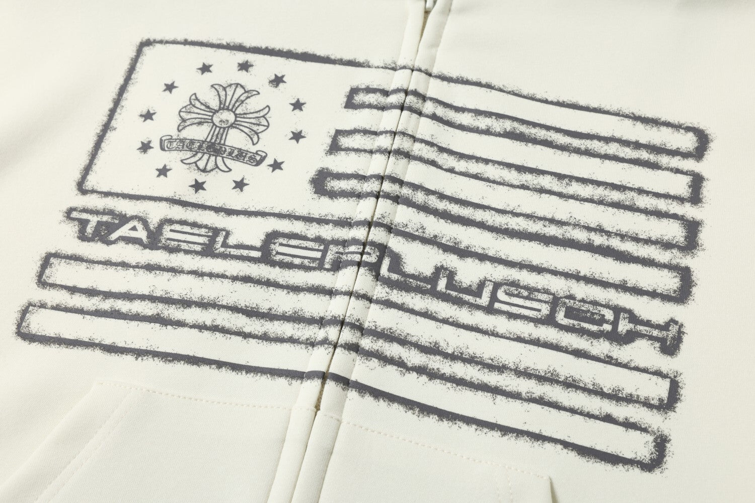 Clothing details: Full-zip hoodie construction, distressed flag-style front graphic, hooded neckline, ribbed cuffs and hem, kangaroo pockets, relaxed fit silhouette, soft athletic fabric with breathable comfort, suitable for layering across seasons.