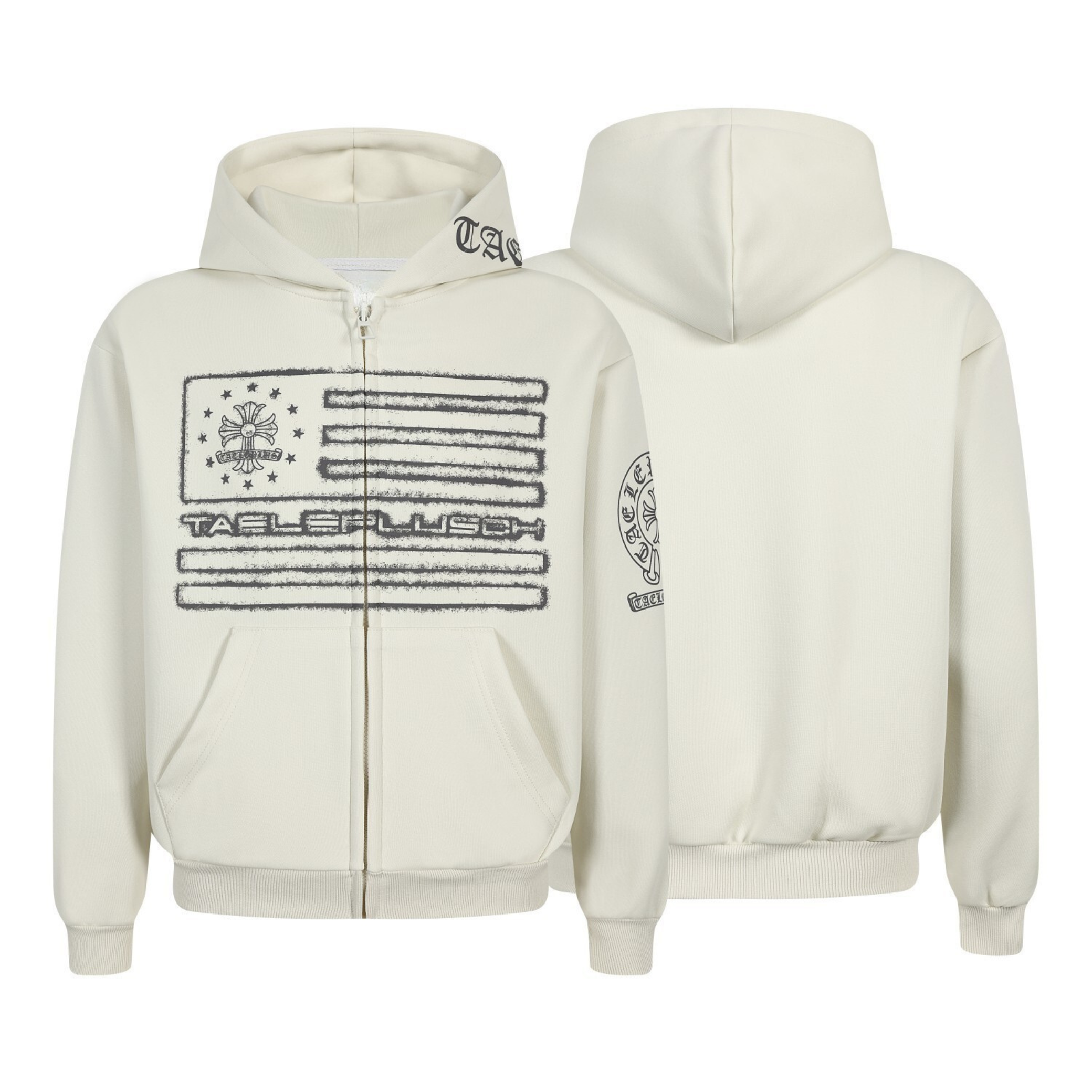 The Omirad Vintage Flag Zip Hoodie features a distressed flag-inspired front graphic that blends classic American iconography with modern streetwear attitude. Designed with a full-zip hooded silhouette, this piece balances bold visual impact with everyday comfort. Finished with subtle sleeve and hood detailing, it delivers a worn-in, workwear-inspired aesthetic built for daily rotation.