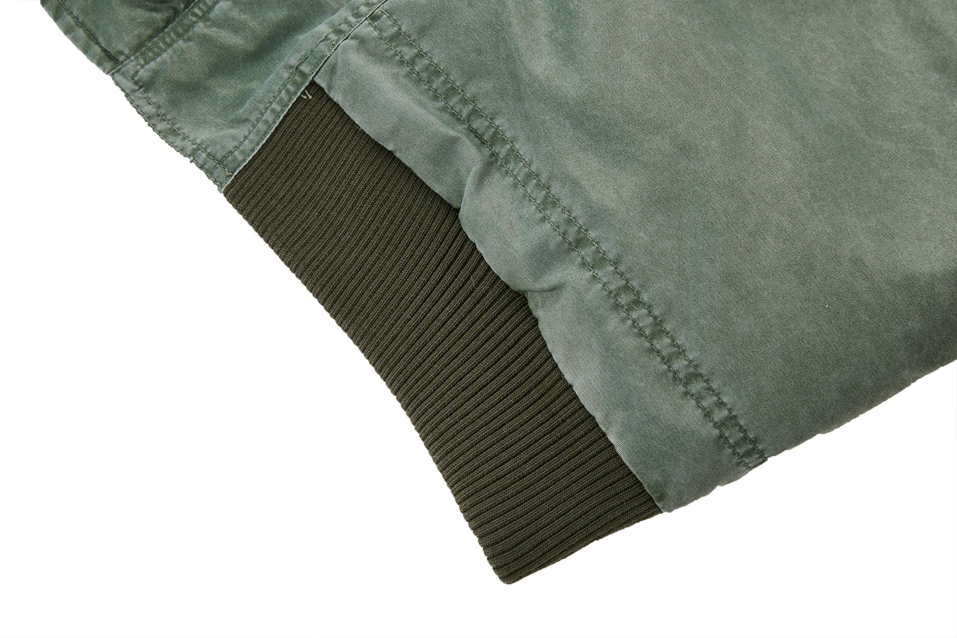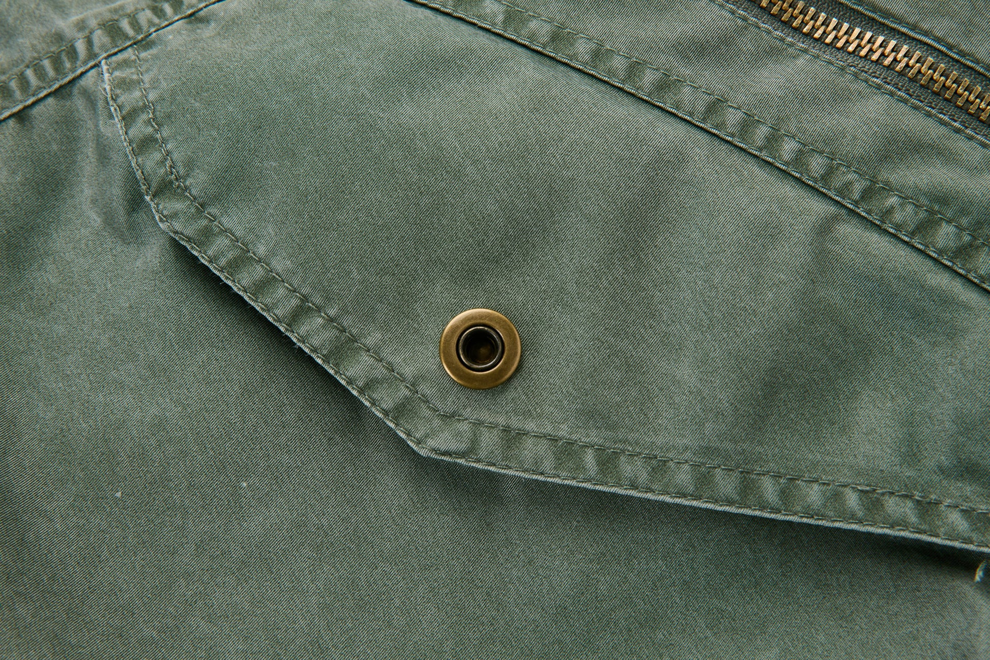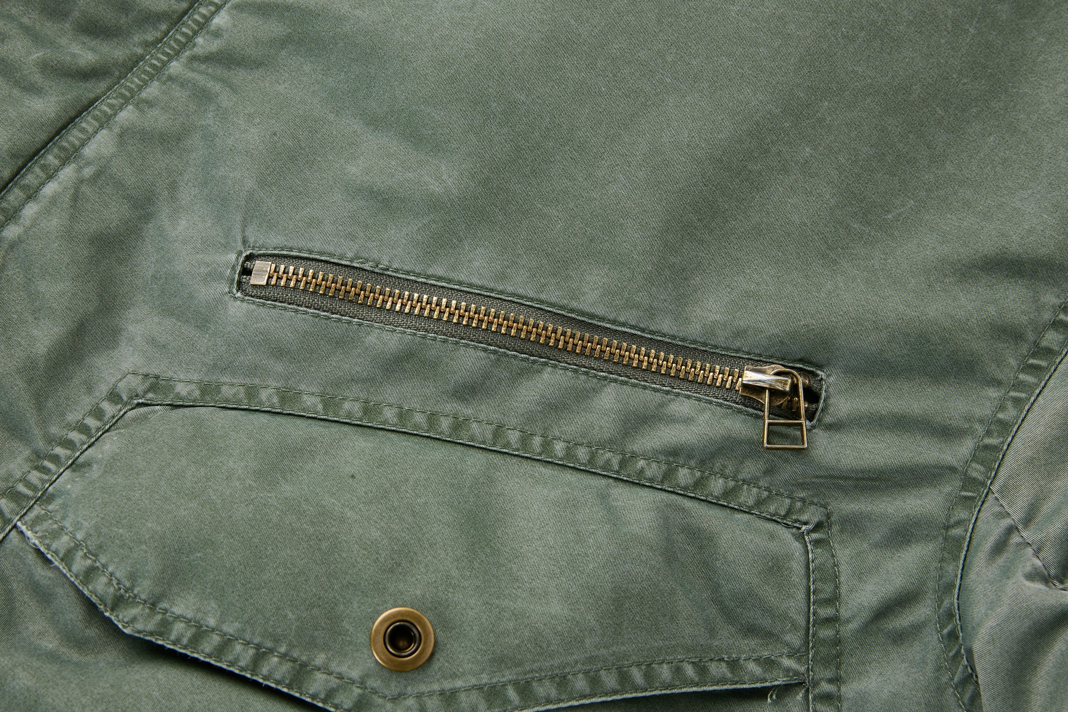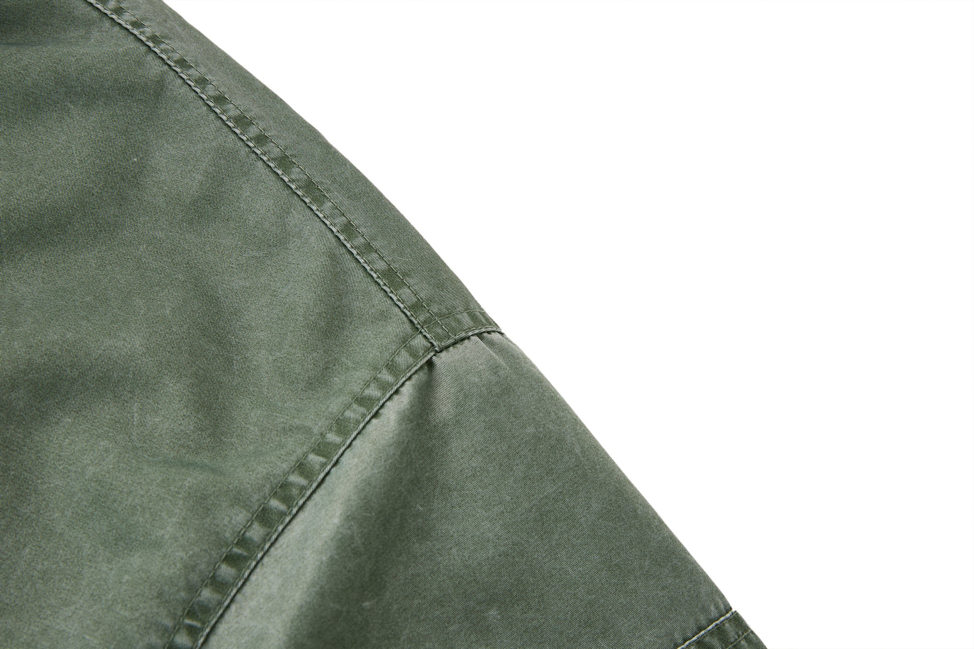 Clothing details: Vintage washed cotton fabric, stand-collar design with snap closure, front zip fastening, zippered chest pocket, utility sleeve pocket, ribbed cuffs and hem, cropped relaxed fit, reinforced stitching for durability.