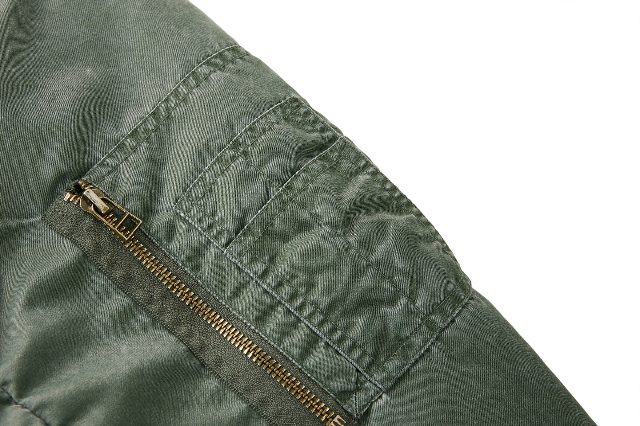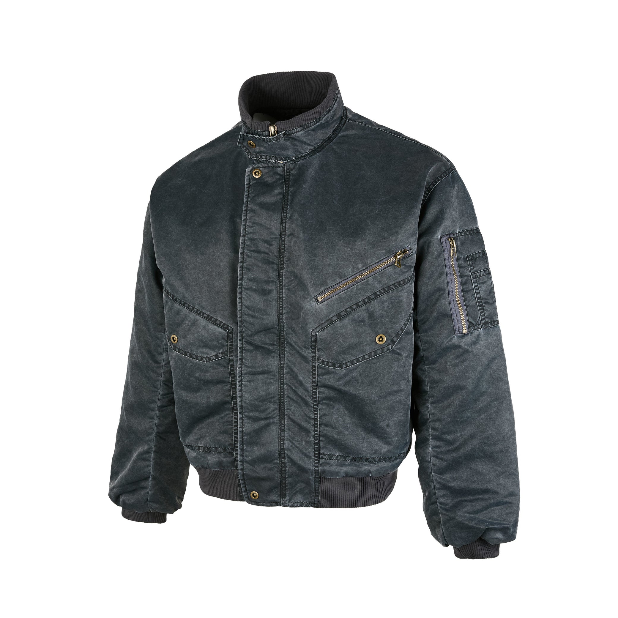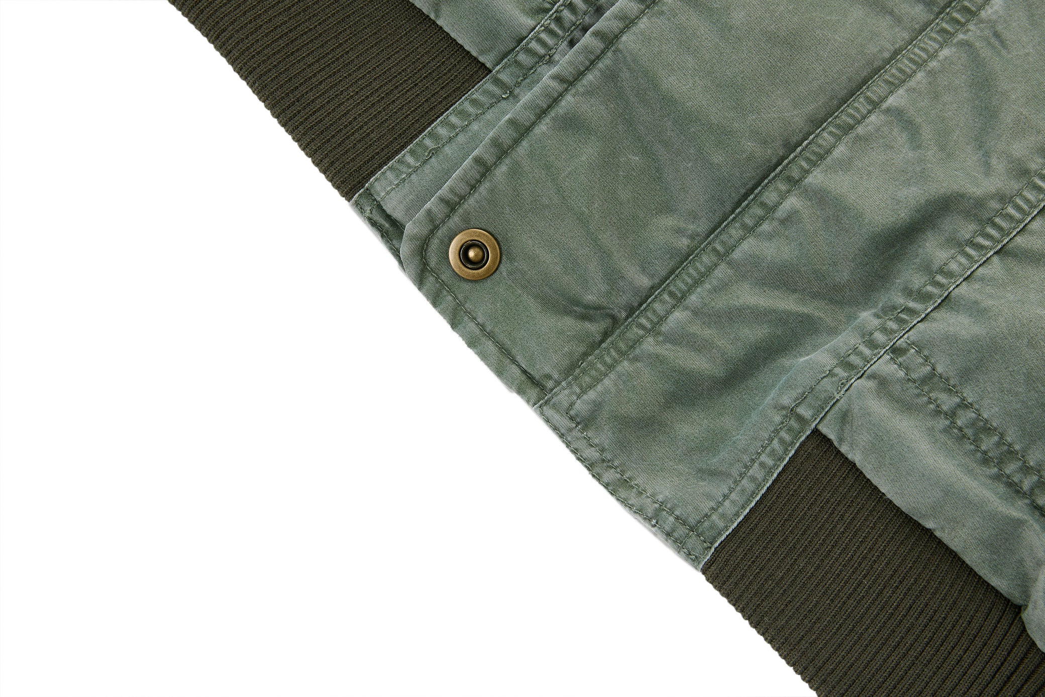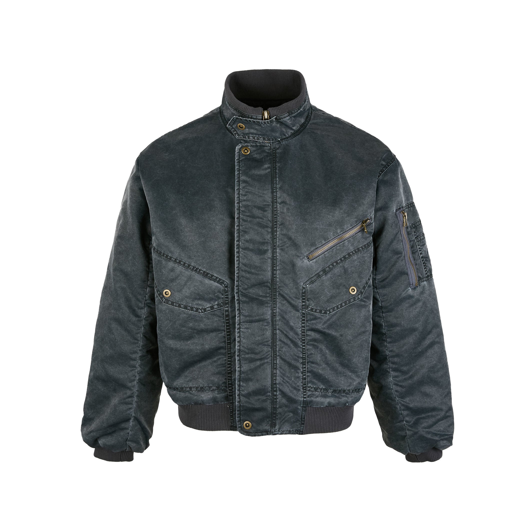 Clothing details: Vintage washed cotton fabric, stand-collar design with snap closure, front zip fastening, zippered chest pocket, utility sleeve pocket, ribbed cuffs and hem, cropped relaxed fit, reinforced stitching for durability.
