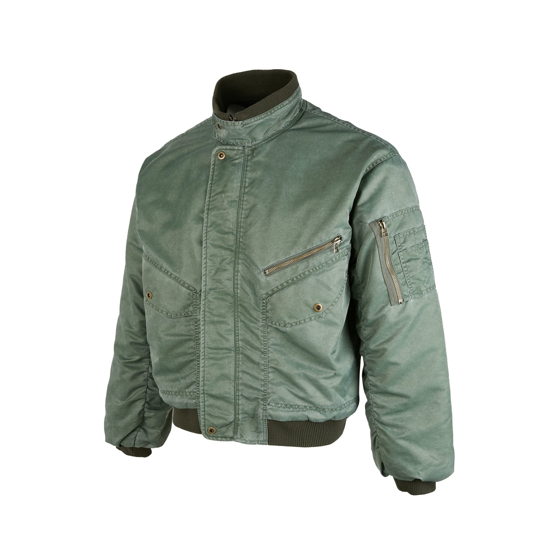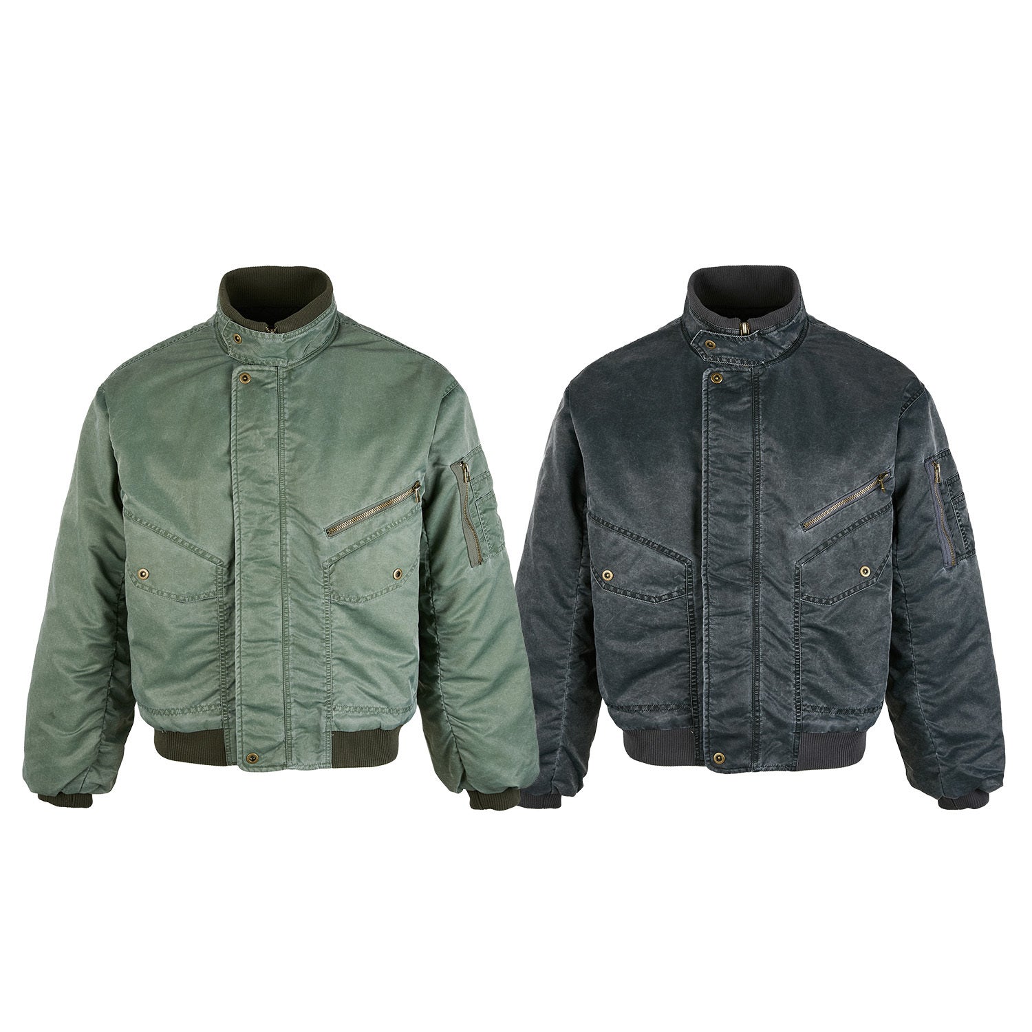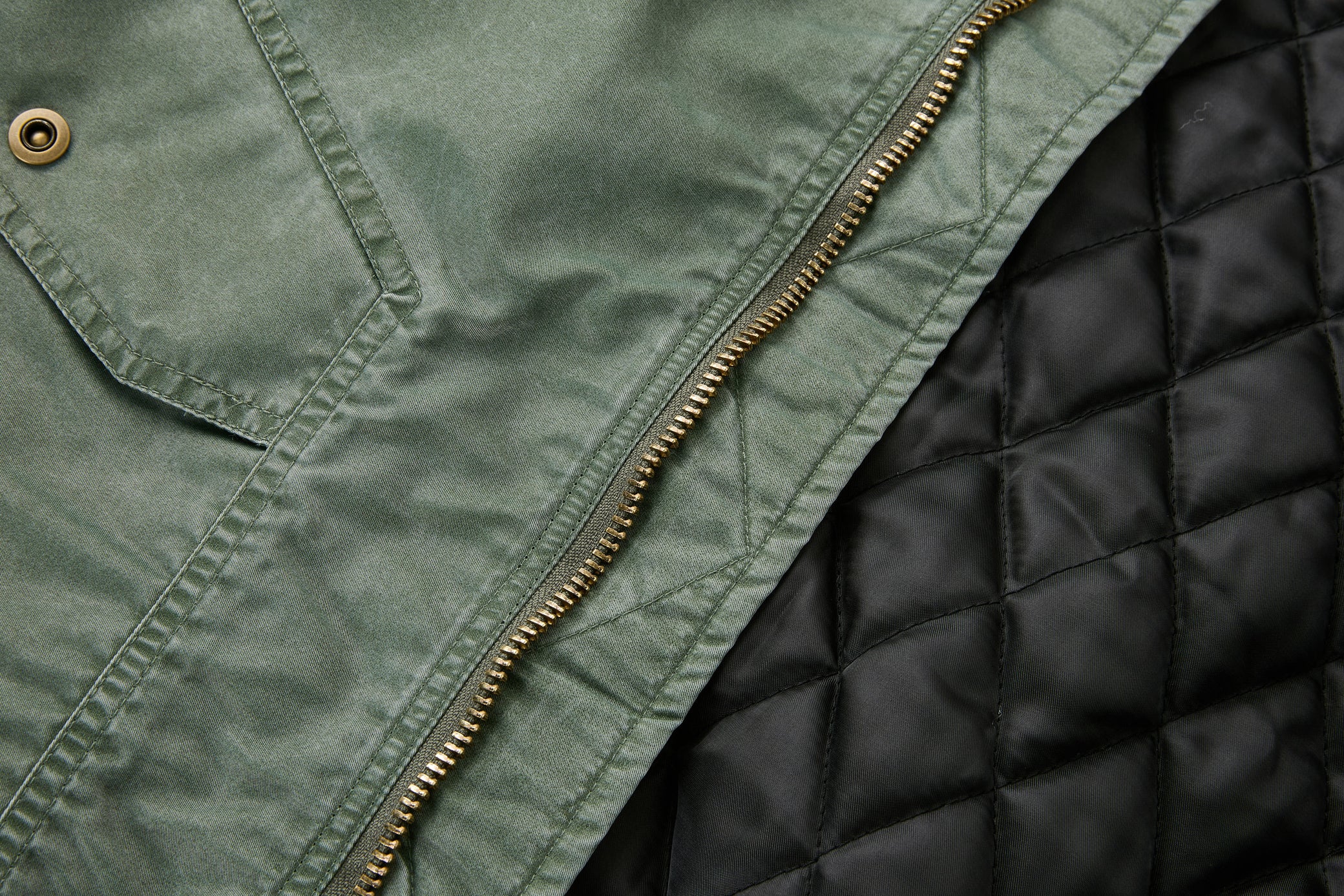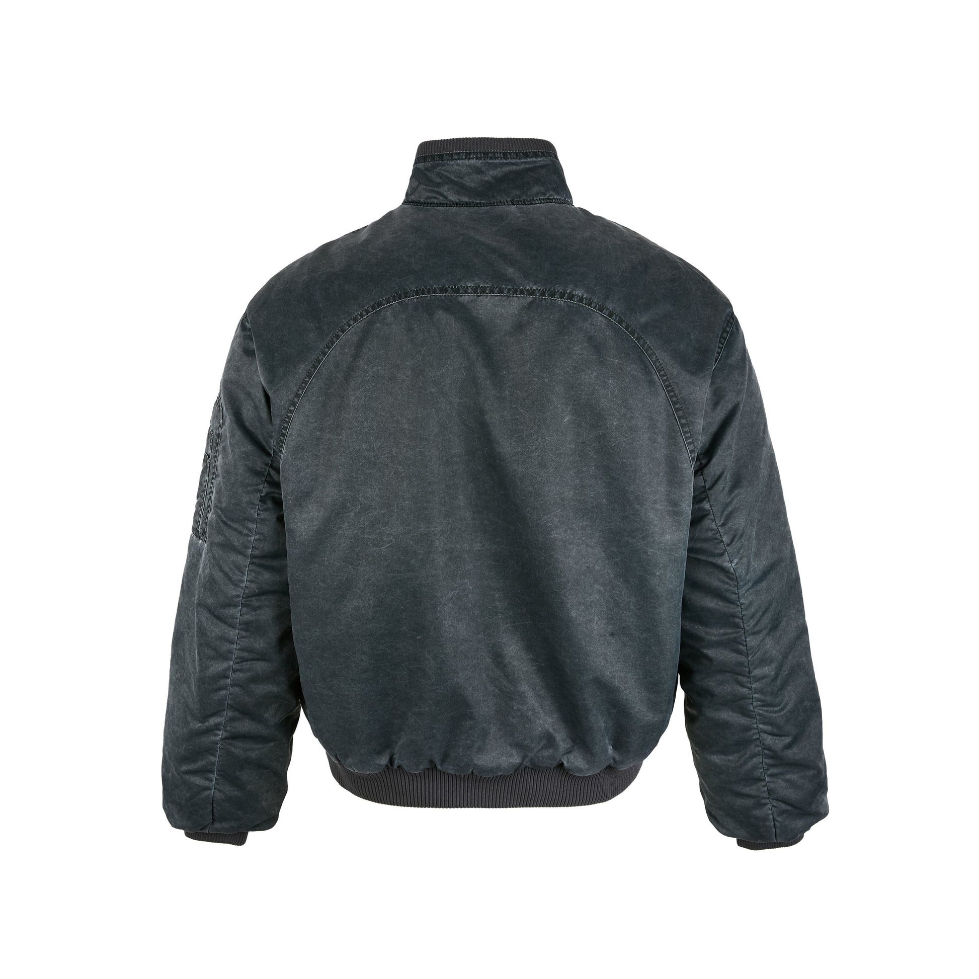 Clothing details: Vintage washed cotton fabric, stand-collar design with snap closure, front zip fastening, zippered chest pocket, utility sleeve pocket, ribbed cuffs and hem, cropped relaxed fit, reinforced stitching for durability.