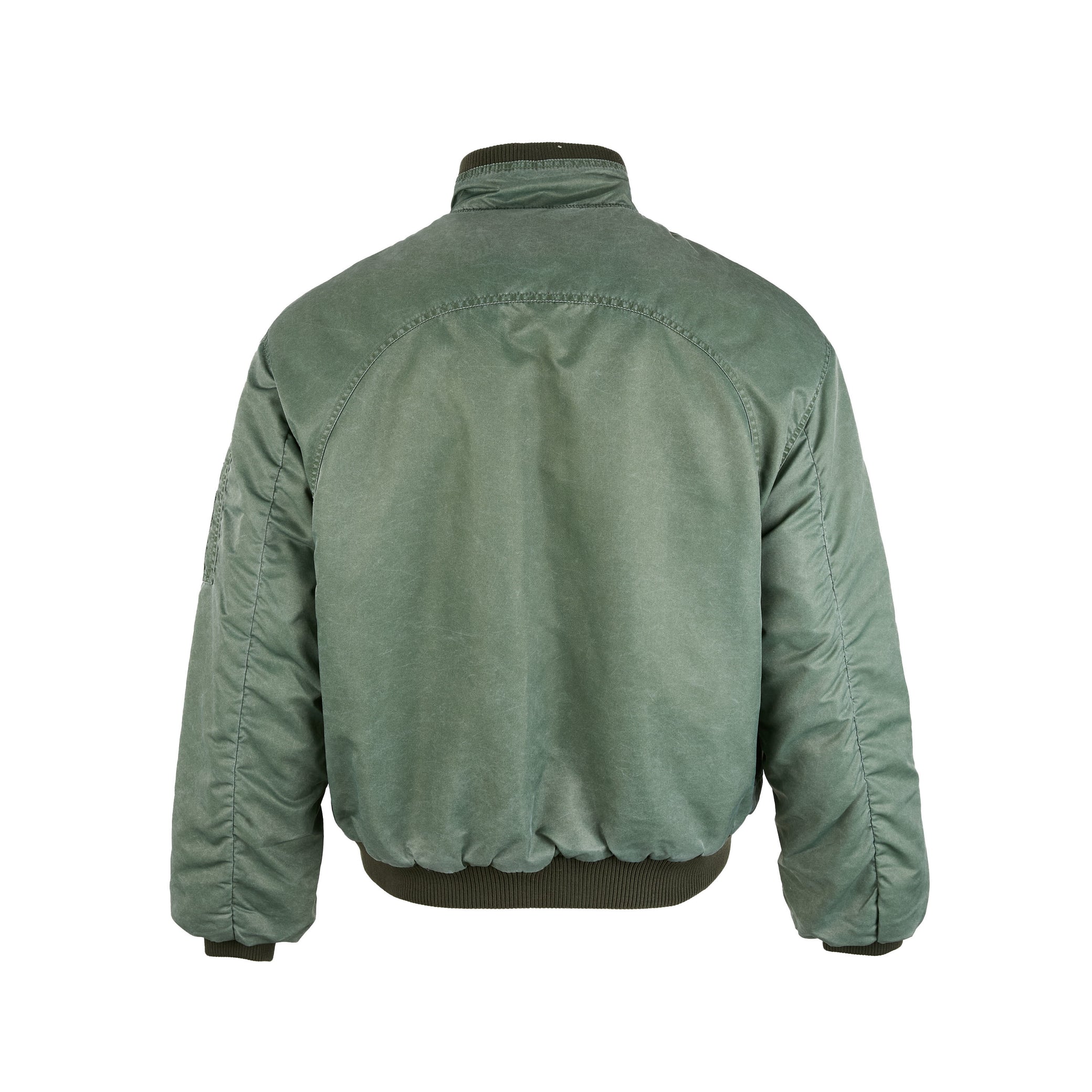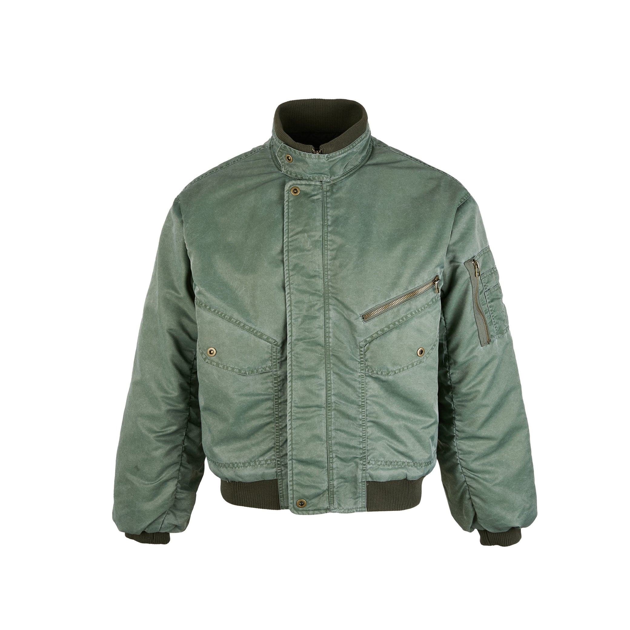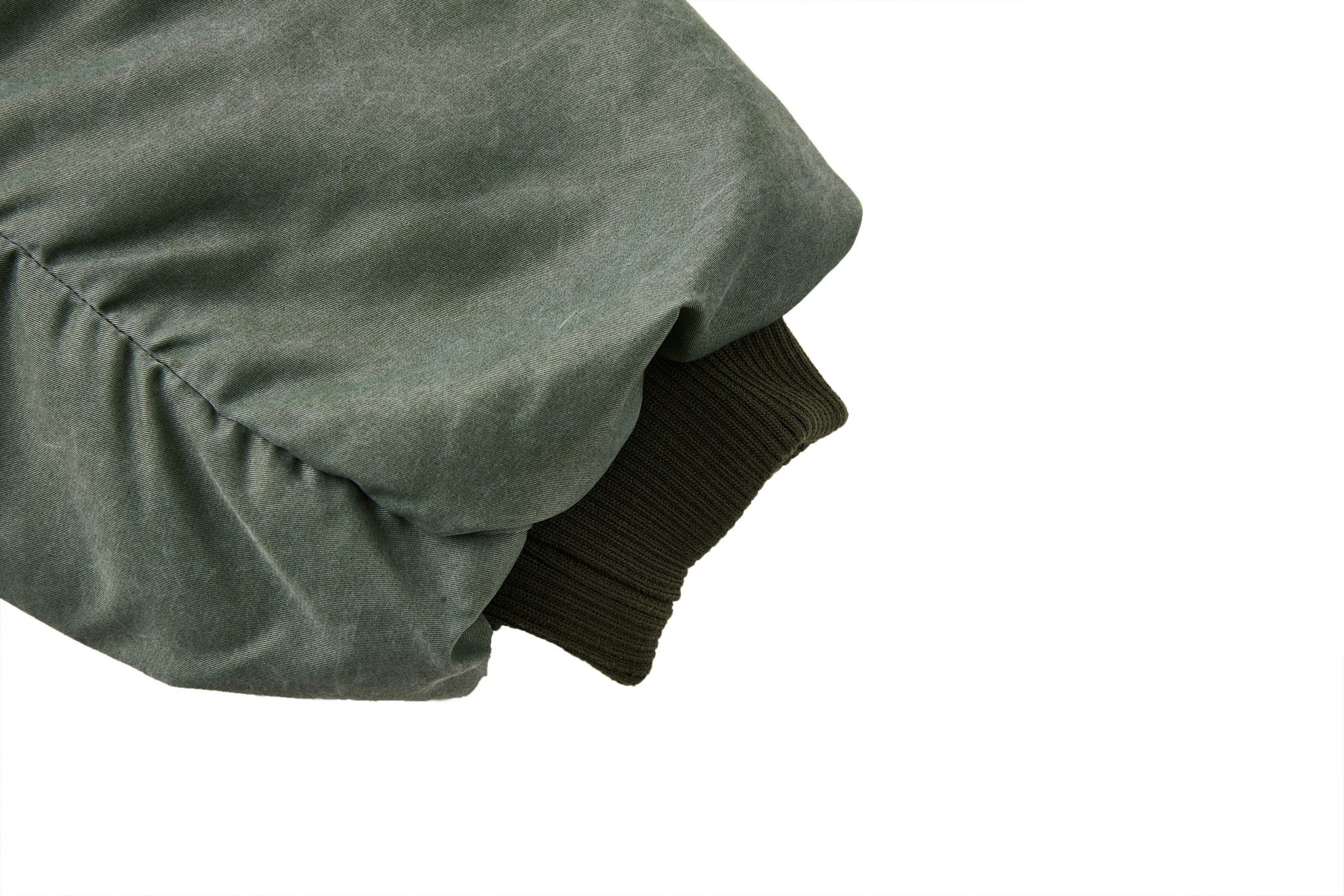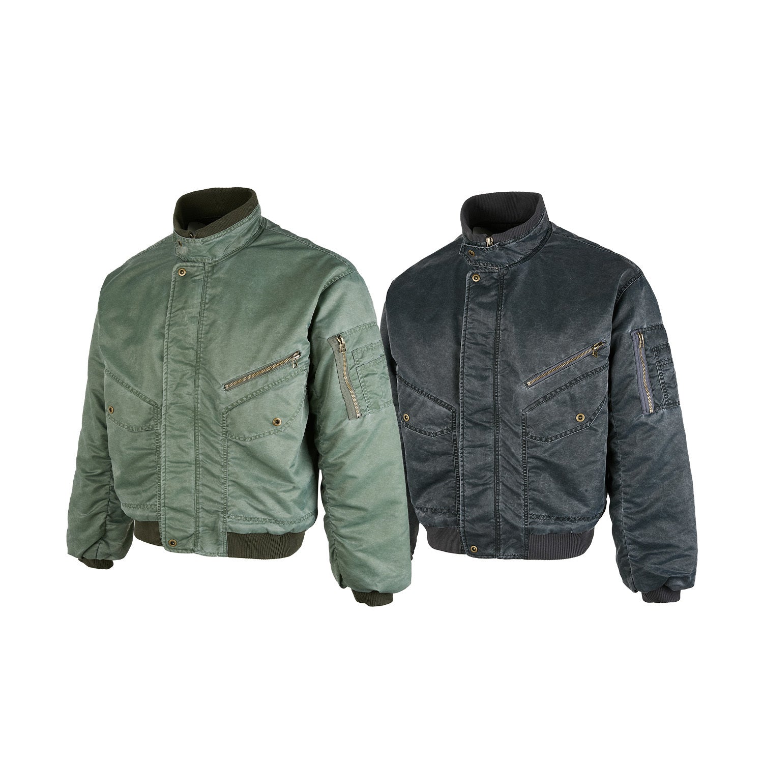 Clothing details: Vintage washed cotton fabric, stand-collar design with snap closure, front zip fastening, zippered chest pocket, utility sleeve pocket, ribbed cuffs and hem, cropped relaxed fit, reinforced stitching for durability.