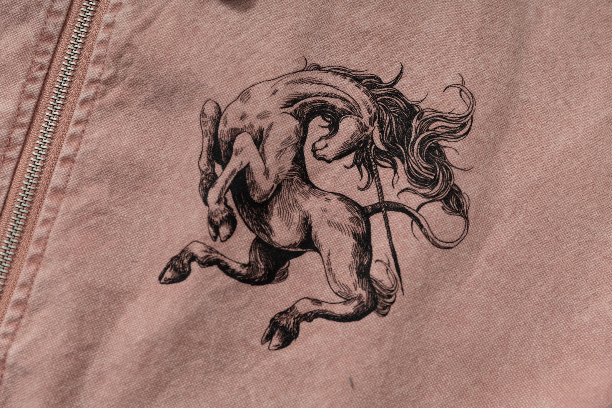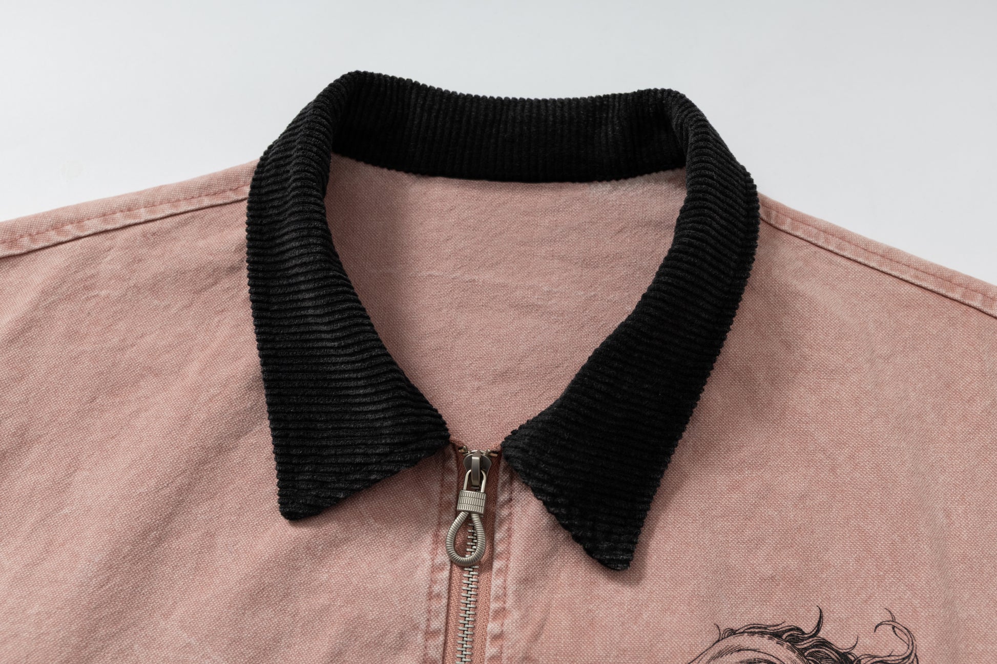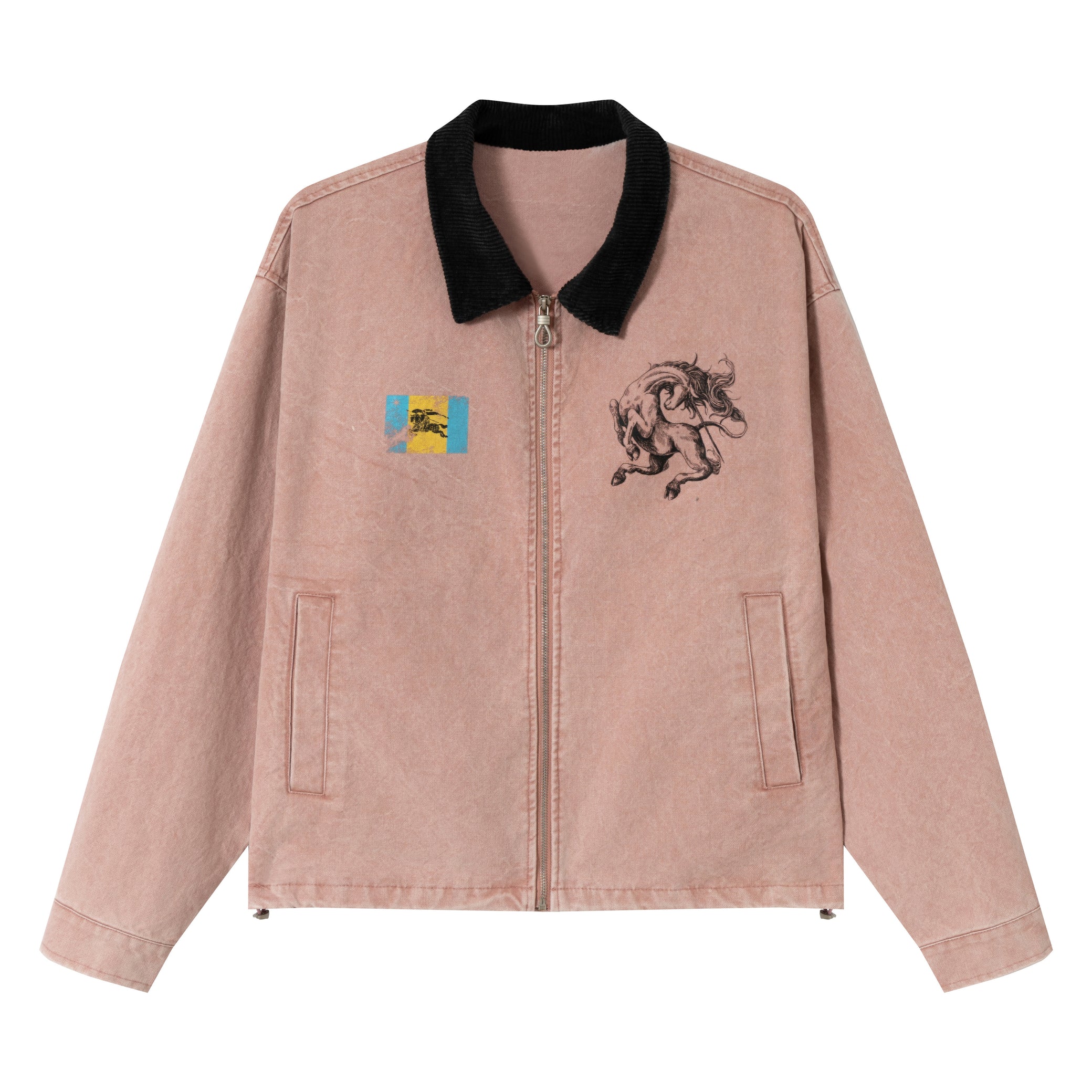 Clothing details: Washed finish, contrast corduroy collar, graphic print, zip-up closure, side pockets