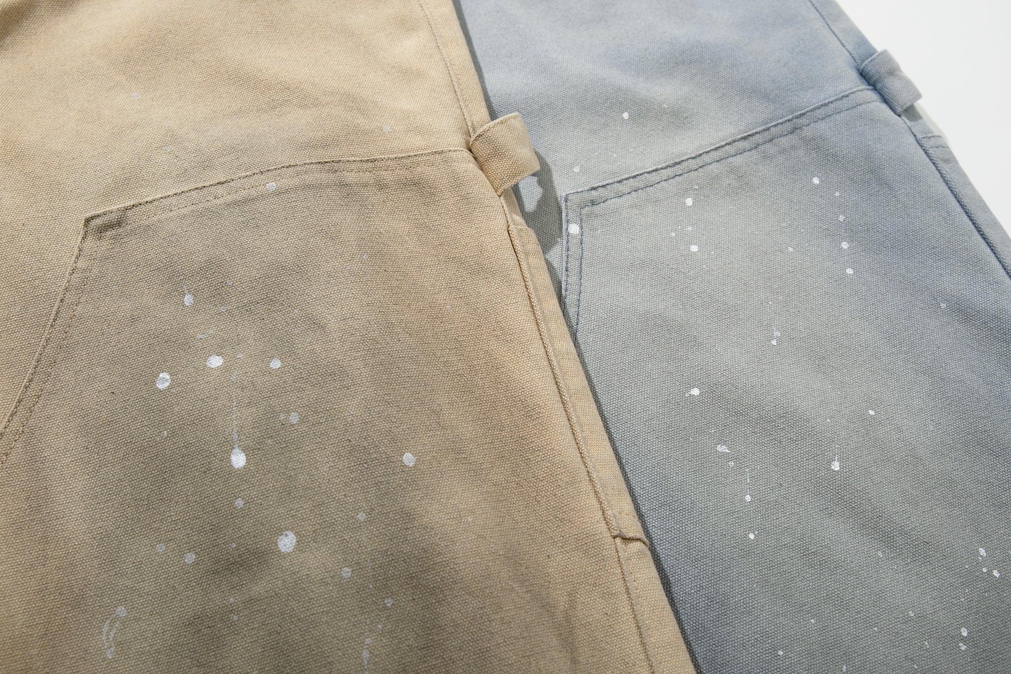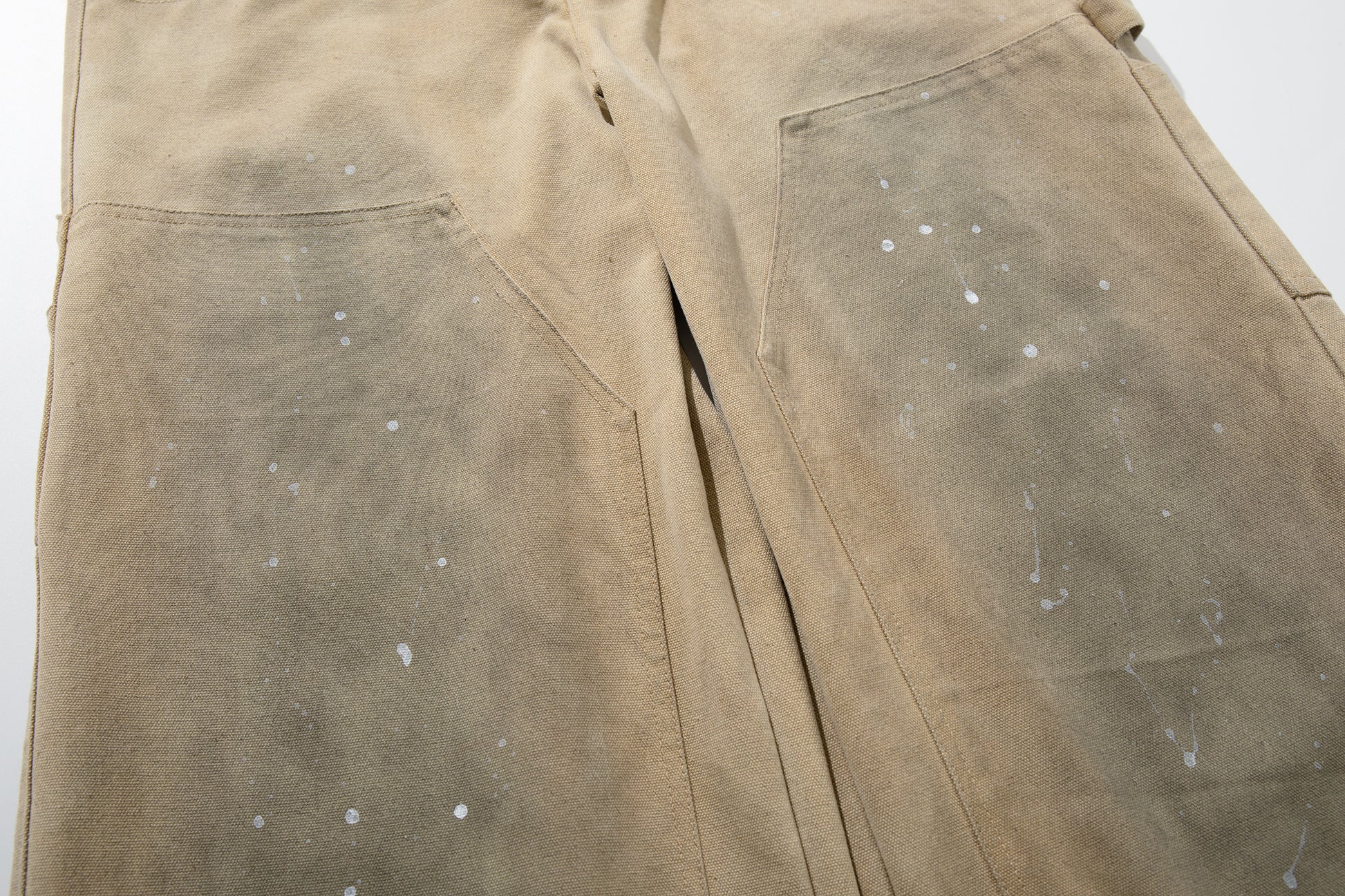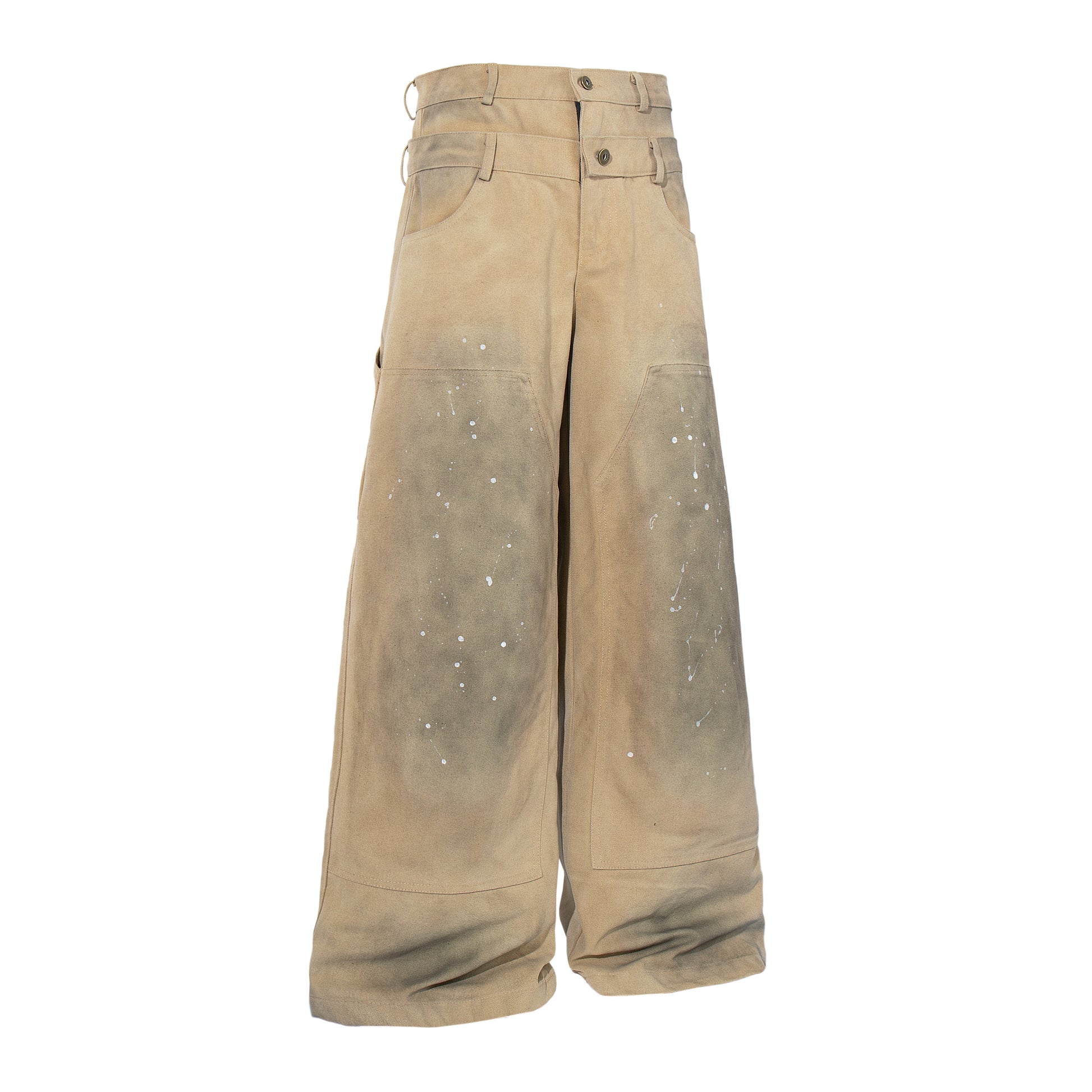 Clothing details: Wide-leg fit, vintage washed finish, paint-splatter detailing, reinforced panels, high-rise waist, heavyweight cotton construction