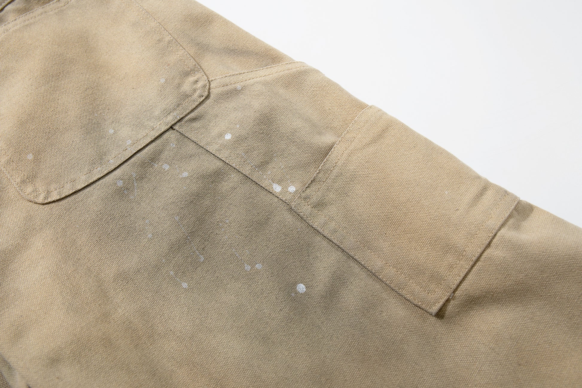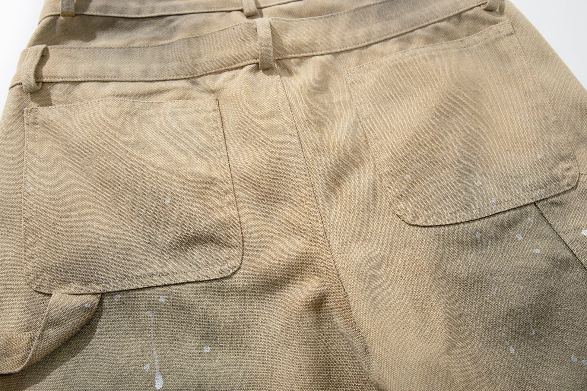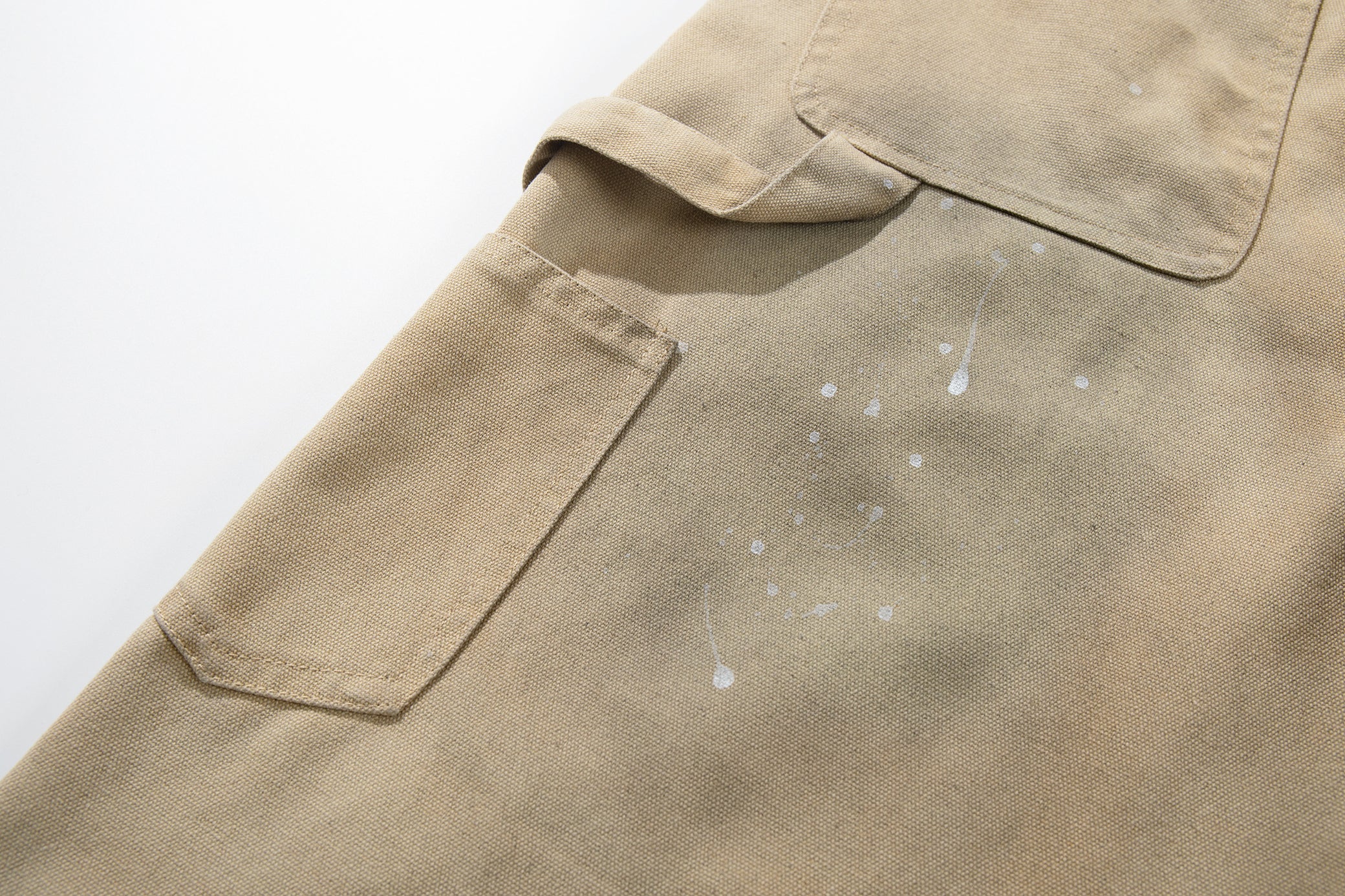 Clothing details: Wide-leg fit, vintage washed finish, paint-splatter detailing, reinforced panels, high-rise waist, heavyweight cotton construction