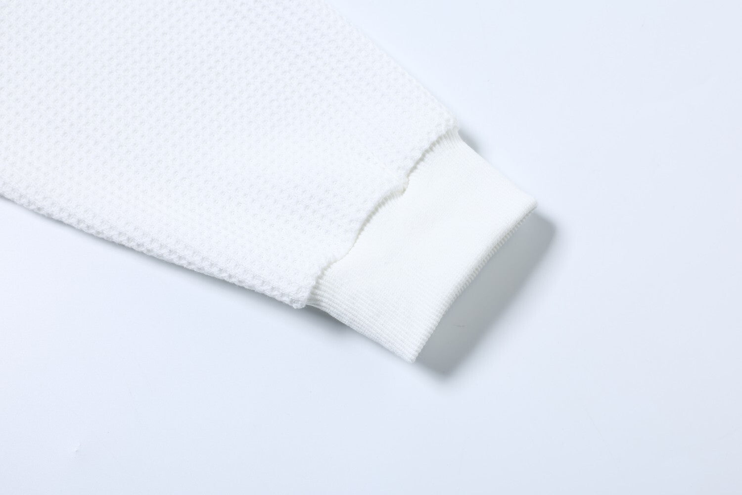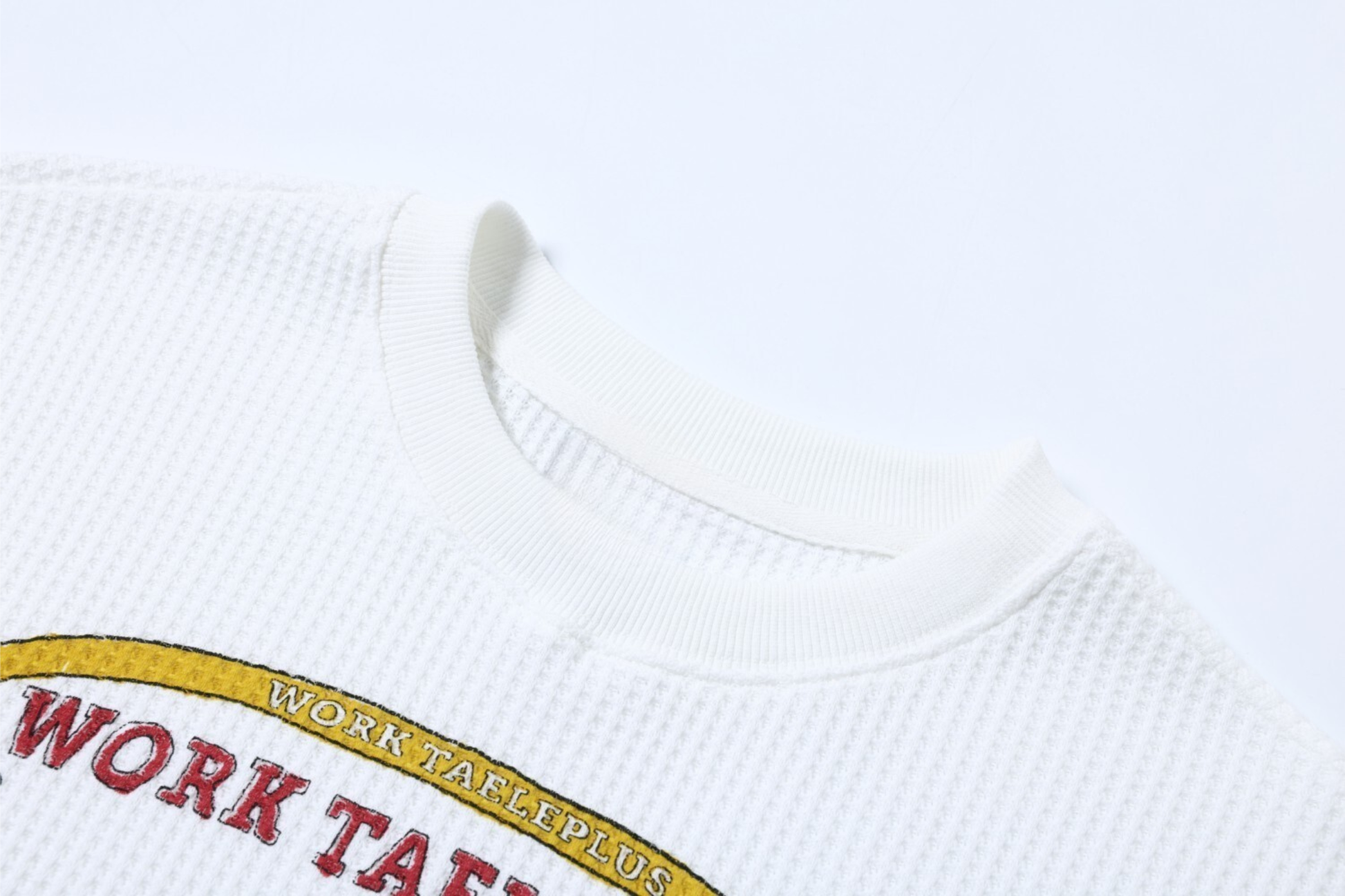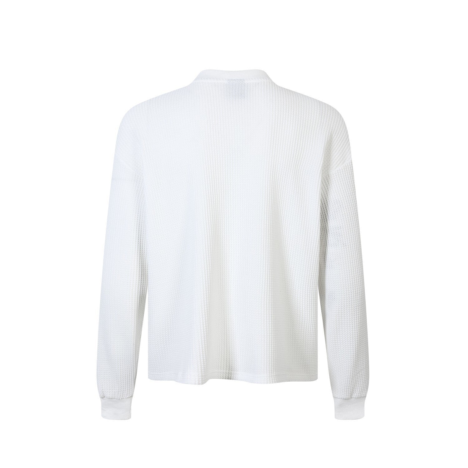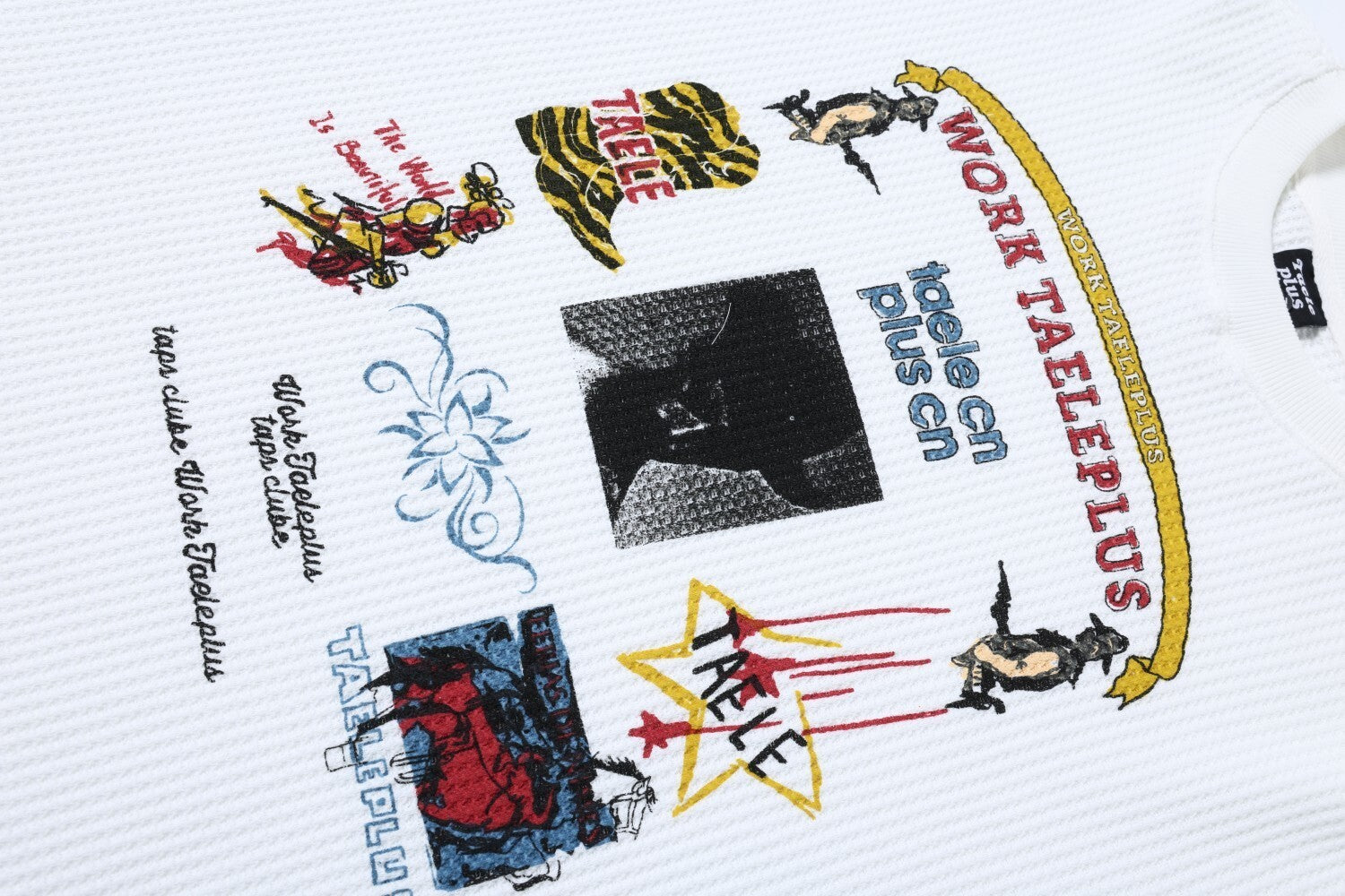 Clothing details: Waffle-textured knit fabric, collage-style front graphic print, clean solid back design, ribbed crew neckline and cuffs, relaxed straight fit, lightweight breathable feel, suitable for year-round wear.