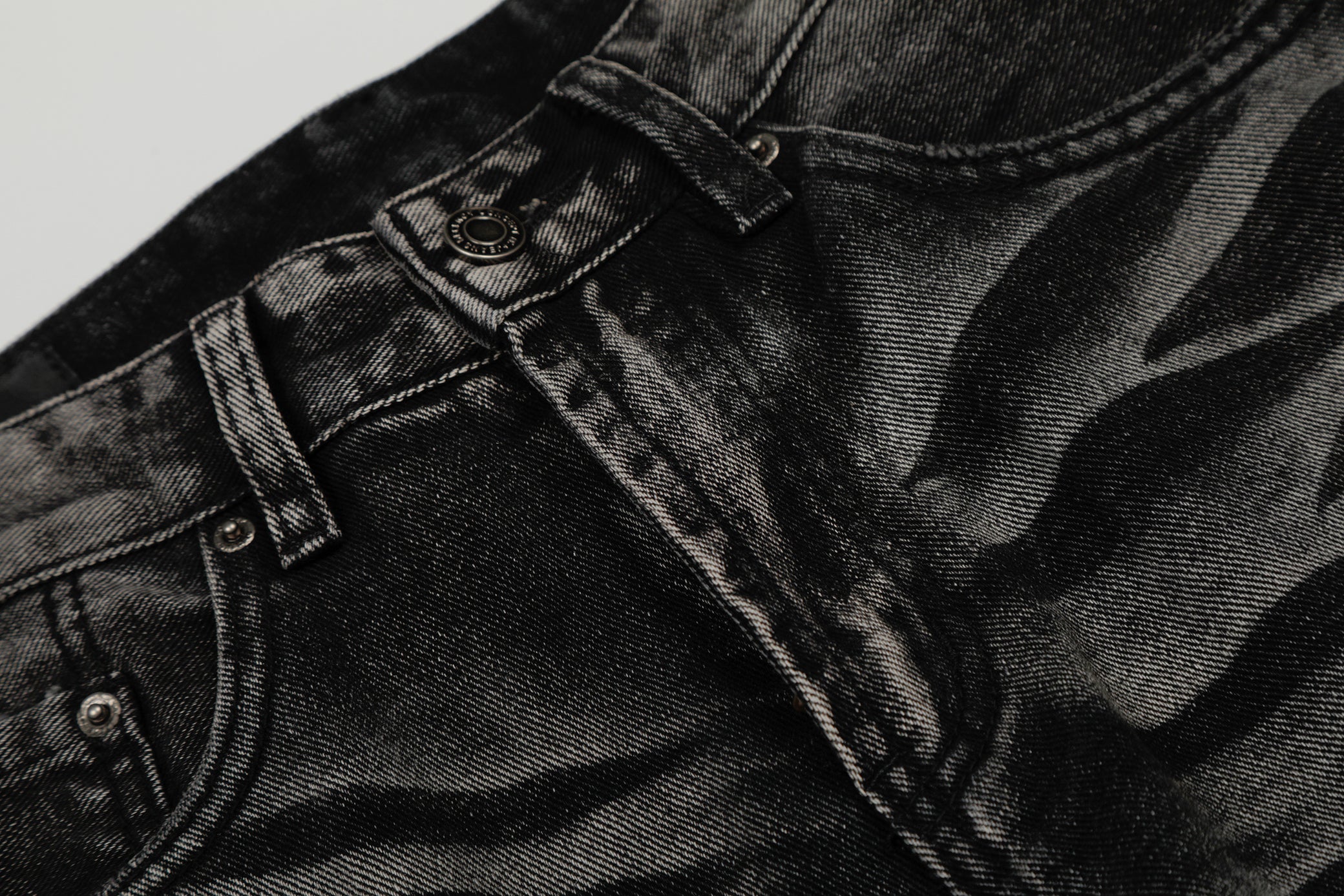 Clothing details: Wide-leg fit, cotton-rich athletic blend fabric, washed and faded finish, natural crease and abrasion effects, classic five-pocket construction, sturdy waistband with button closure, flexible yet structured feel for everyday street wear.