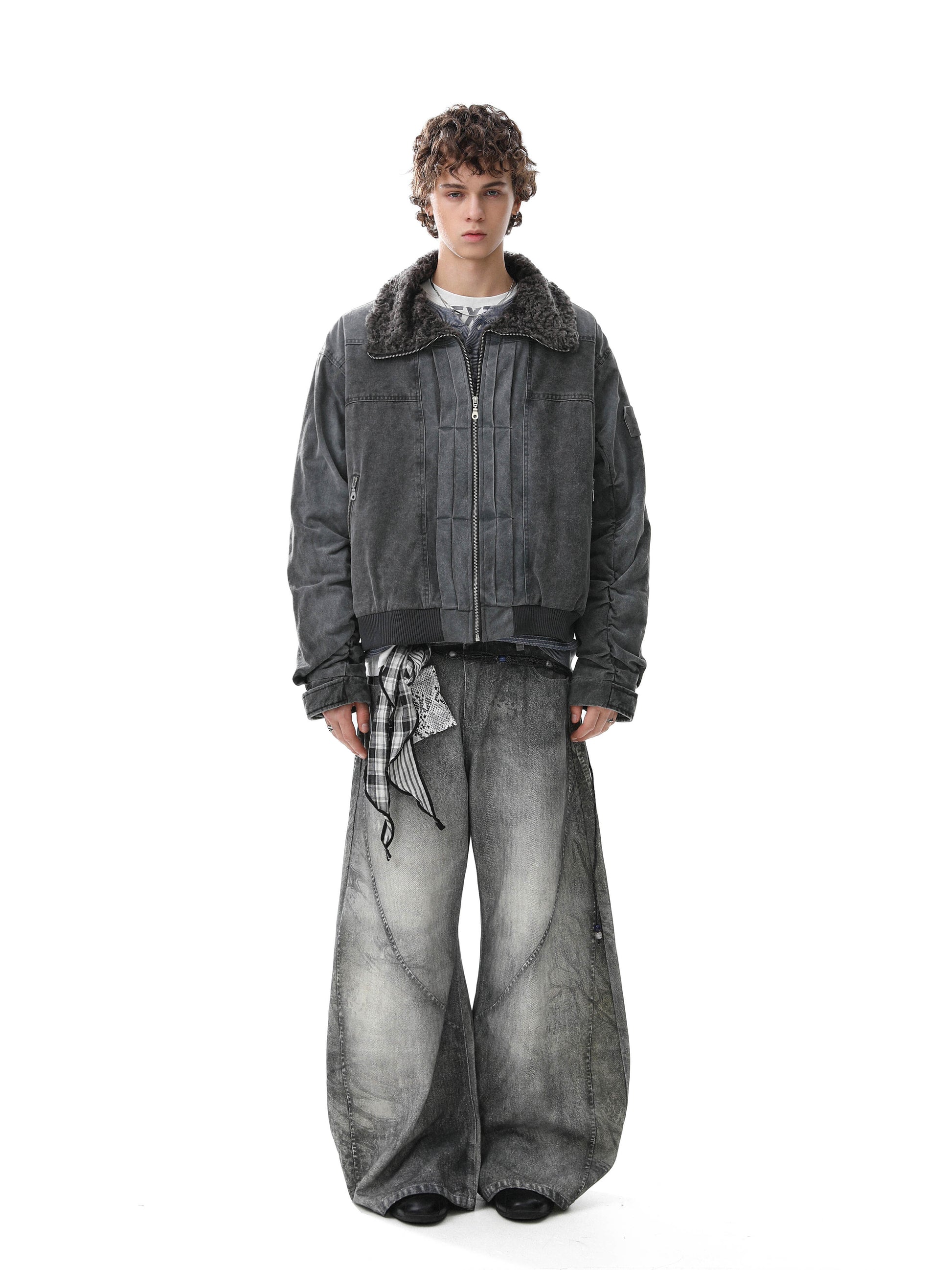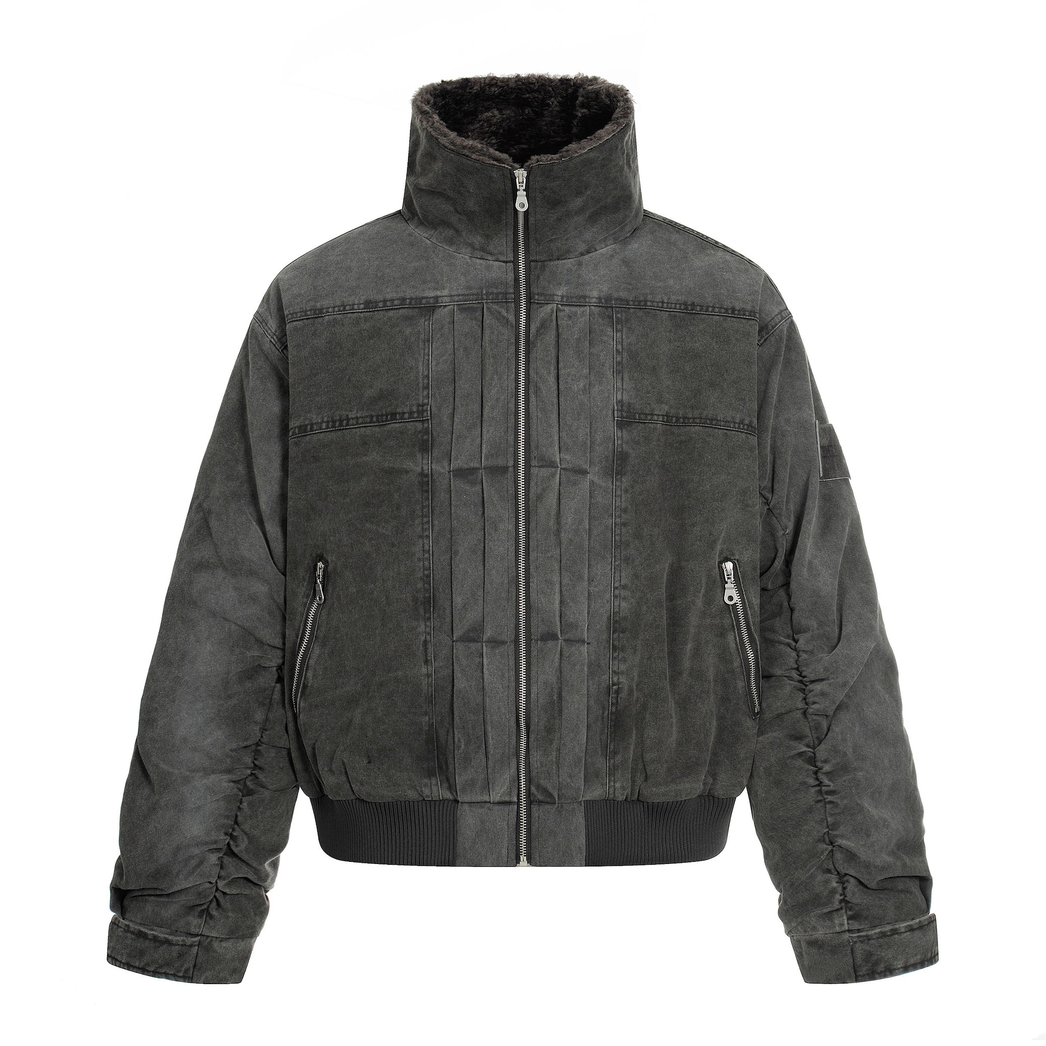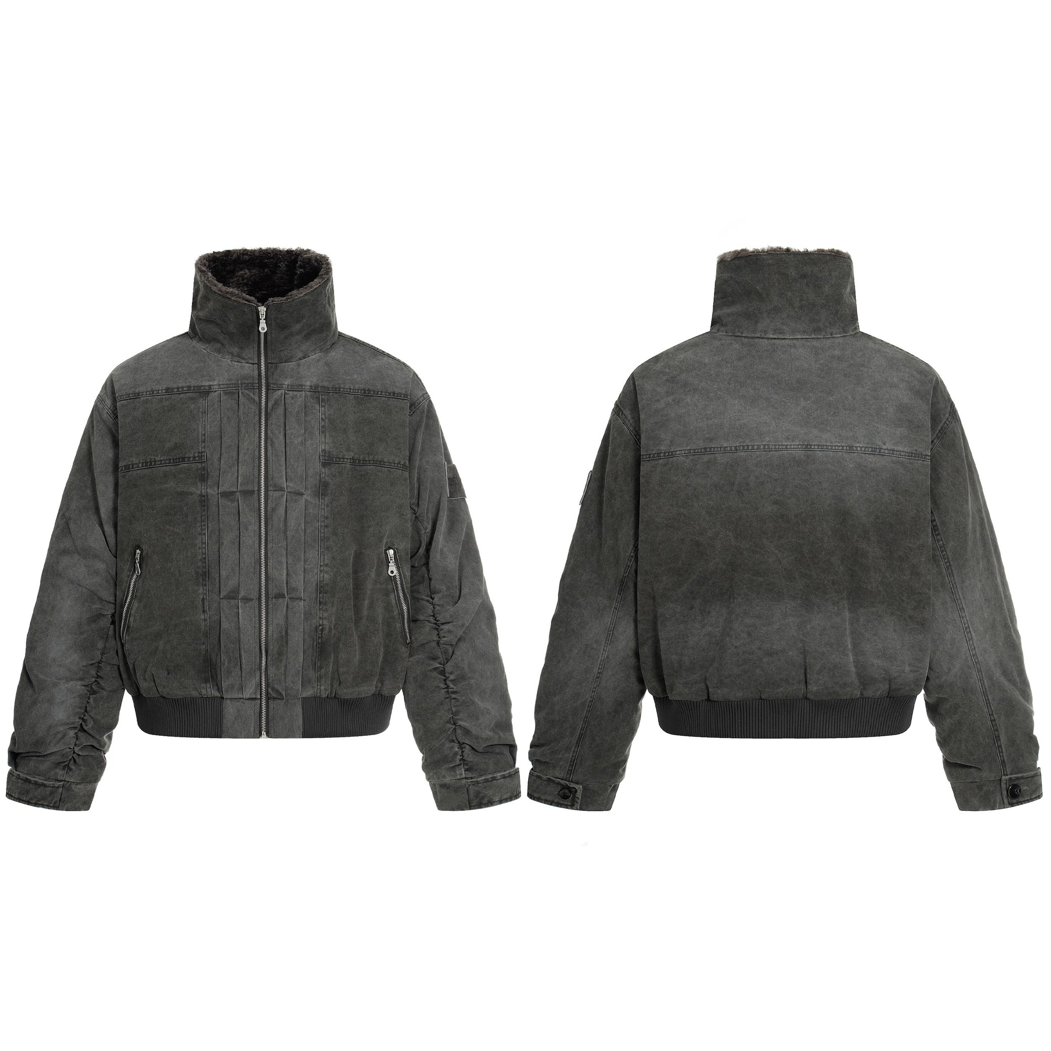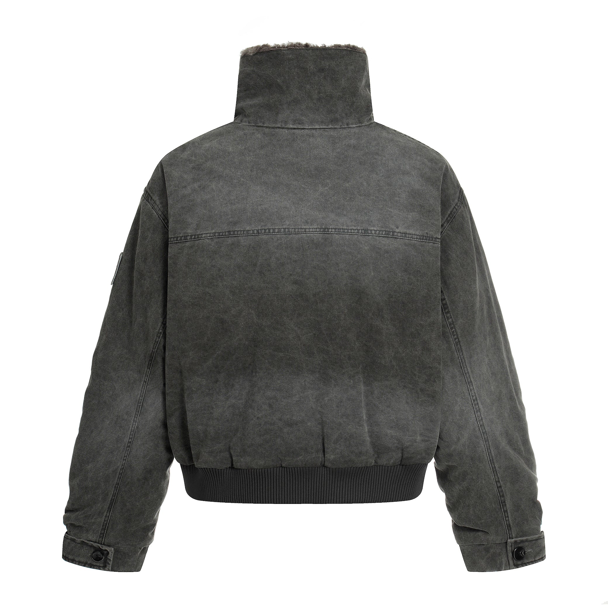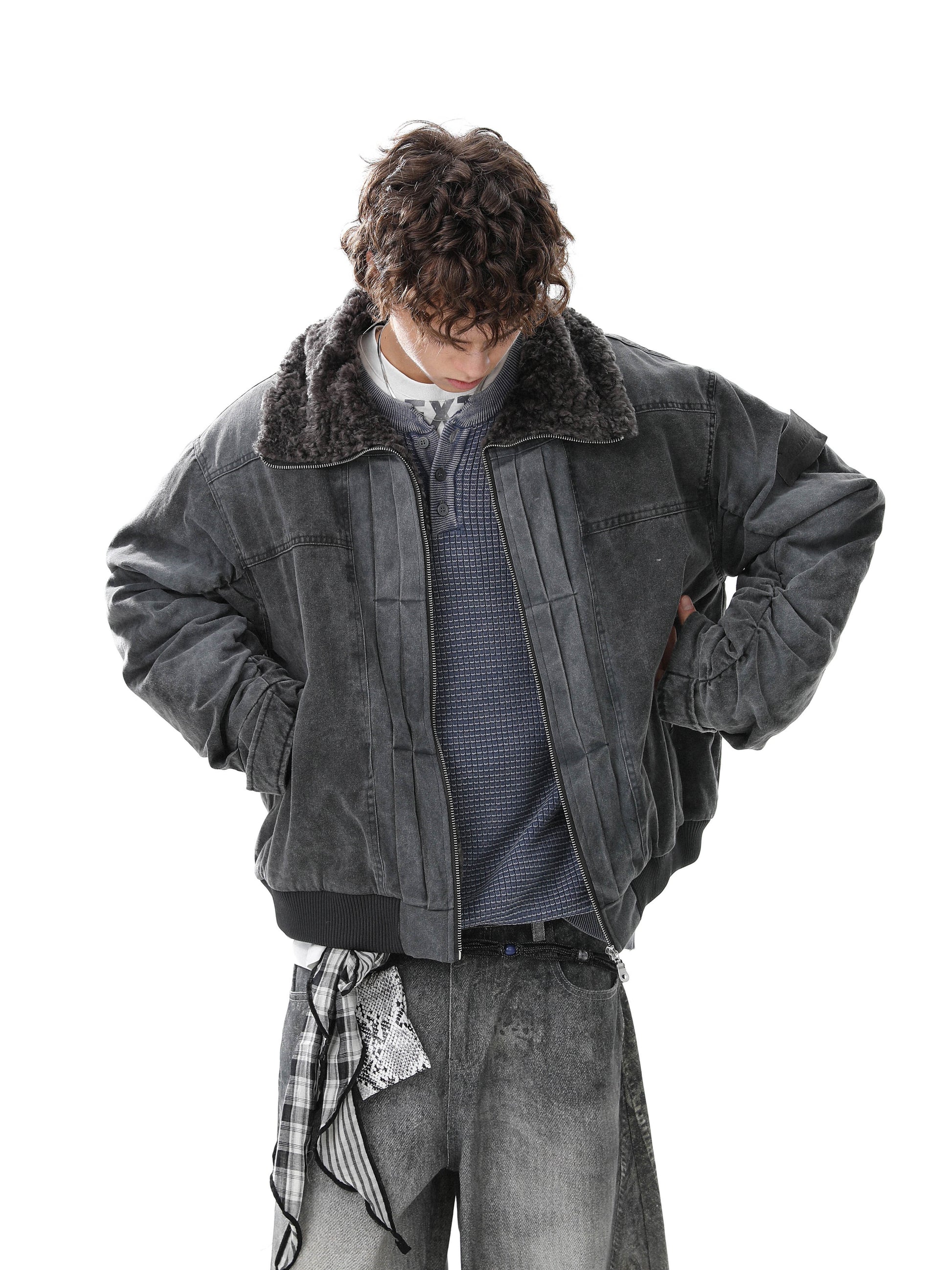 Clothing details: Full-zip front closure, high stand collar with plush inner lining, garment-washed vintage finish, ribbed hem, multiple zip utility pockets, relaxed bomber fit, heavyweight cotton construction for fall and winter layering.