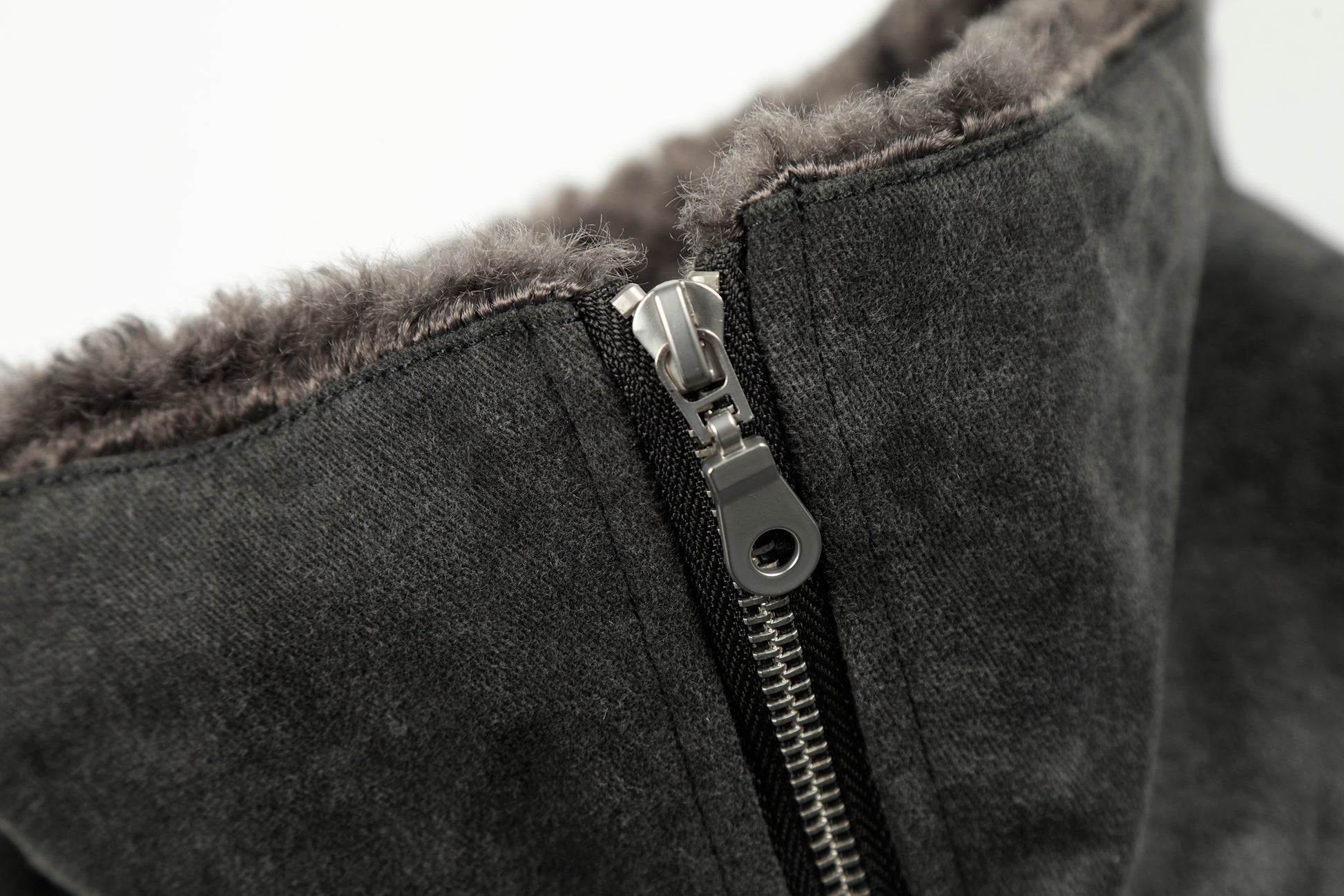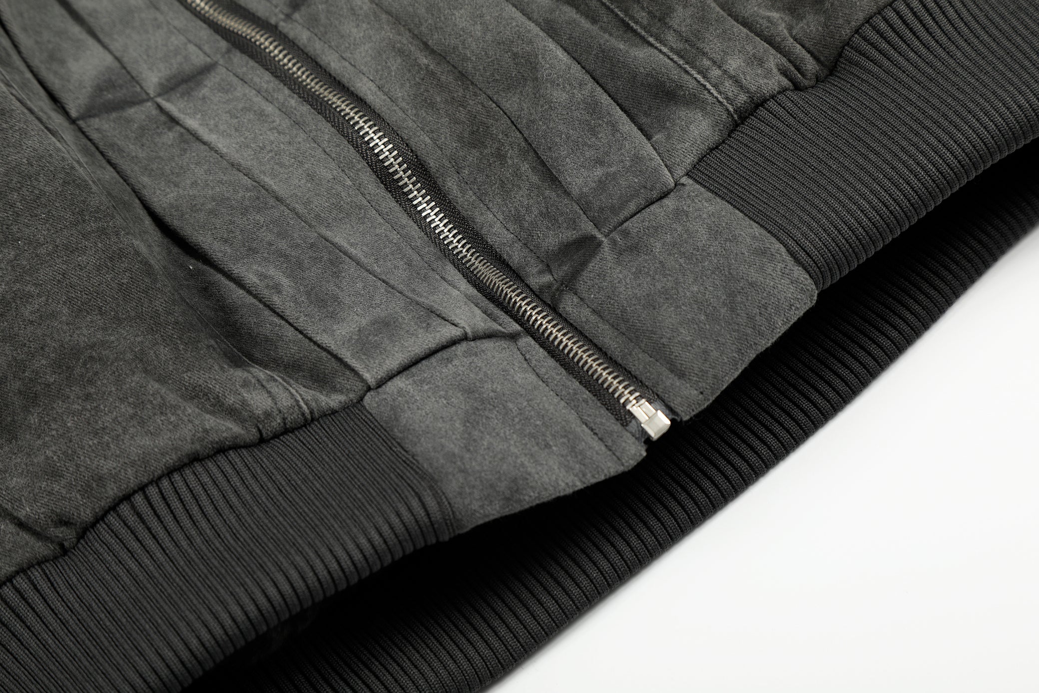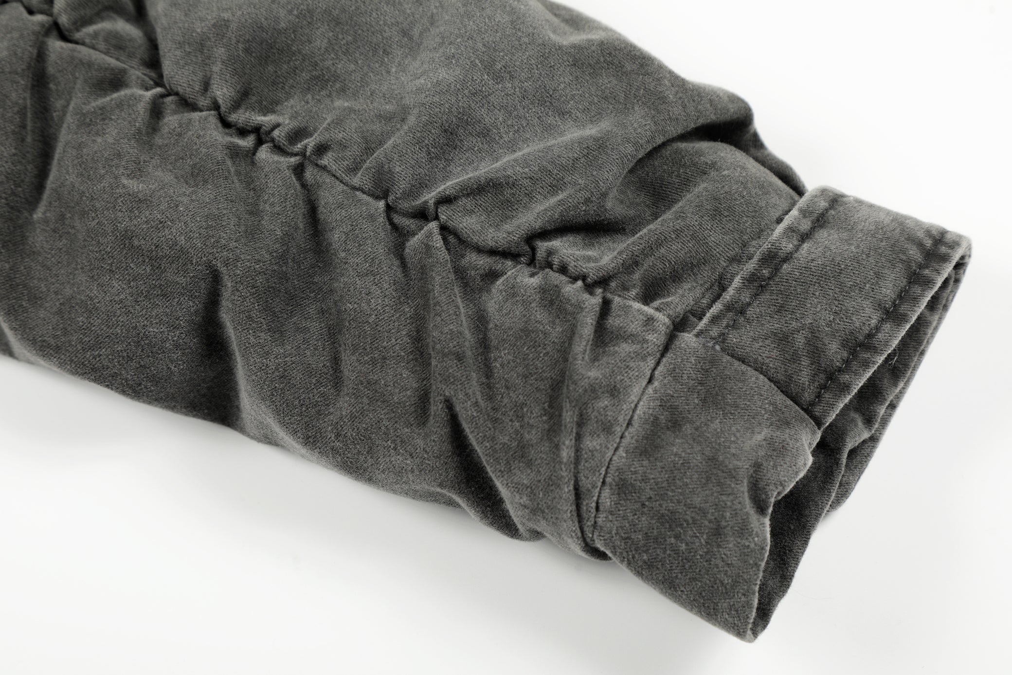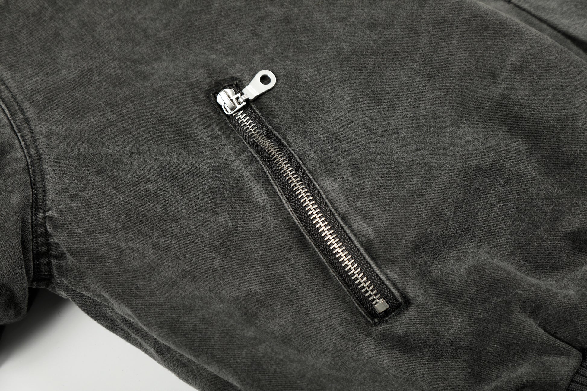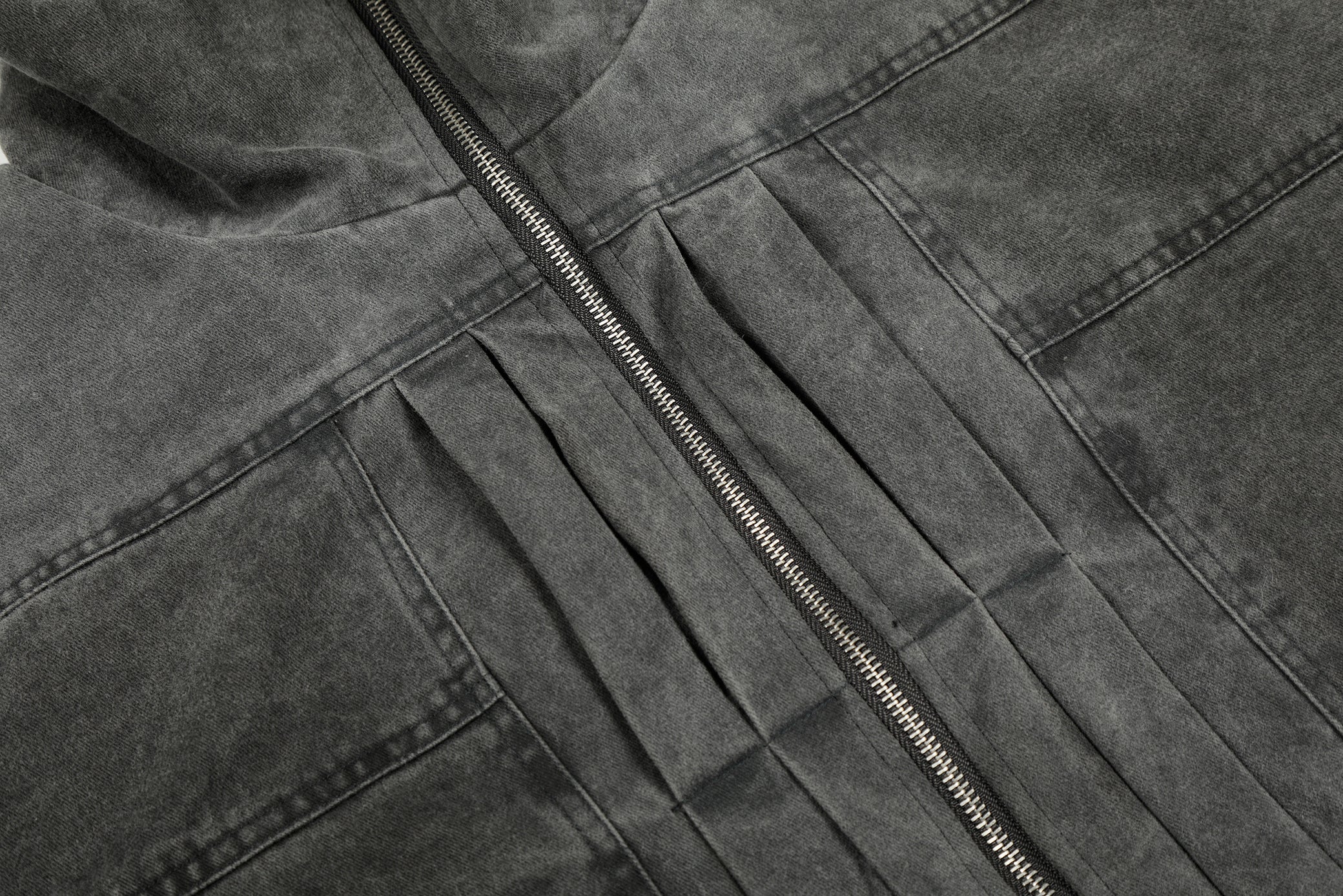 Clothing details: Full-zip front closure, high stand collar with plush inner lining, garment-washed vintage finish, ribbed hem, multiple zip utility pockets, relaxed bomber fit, heavyweight cotton construction for fall and winter layering.