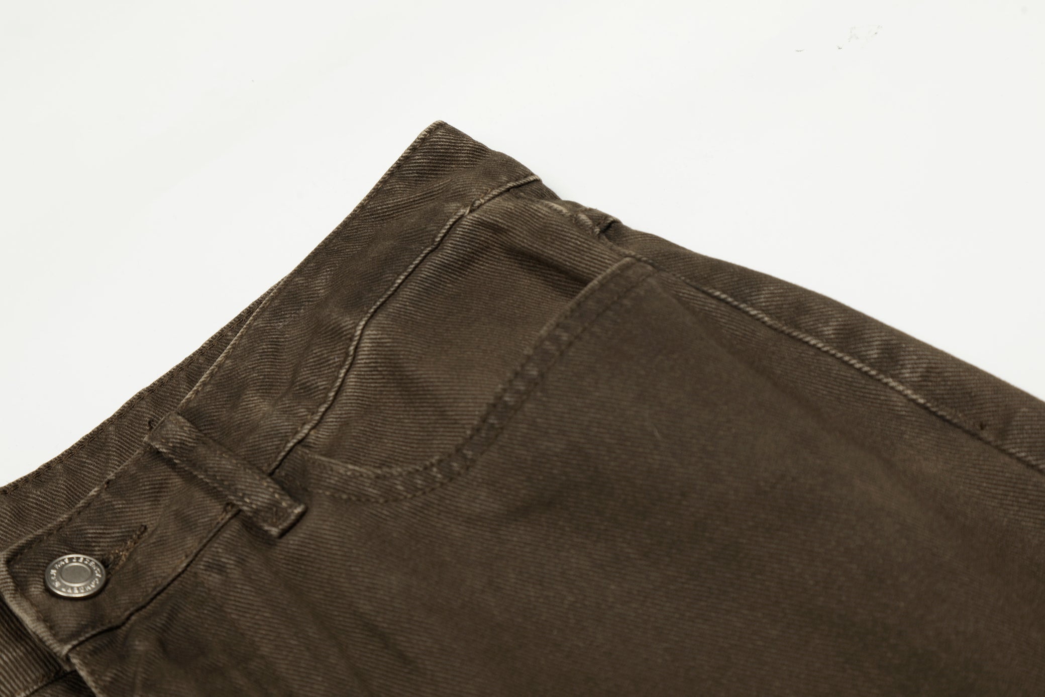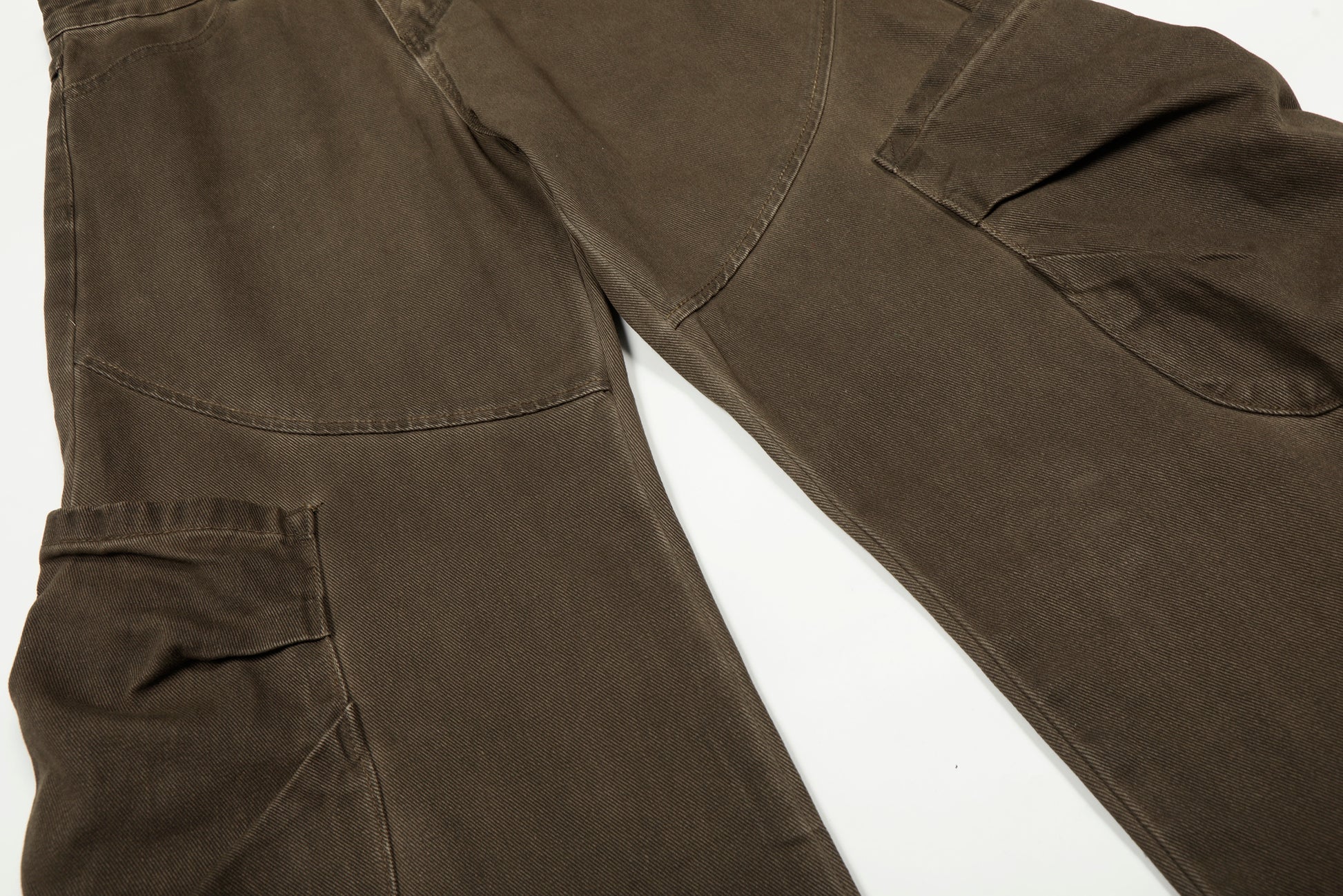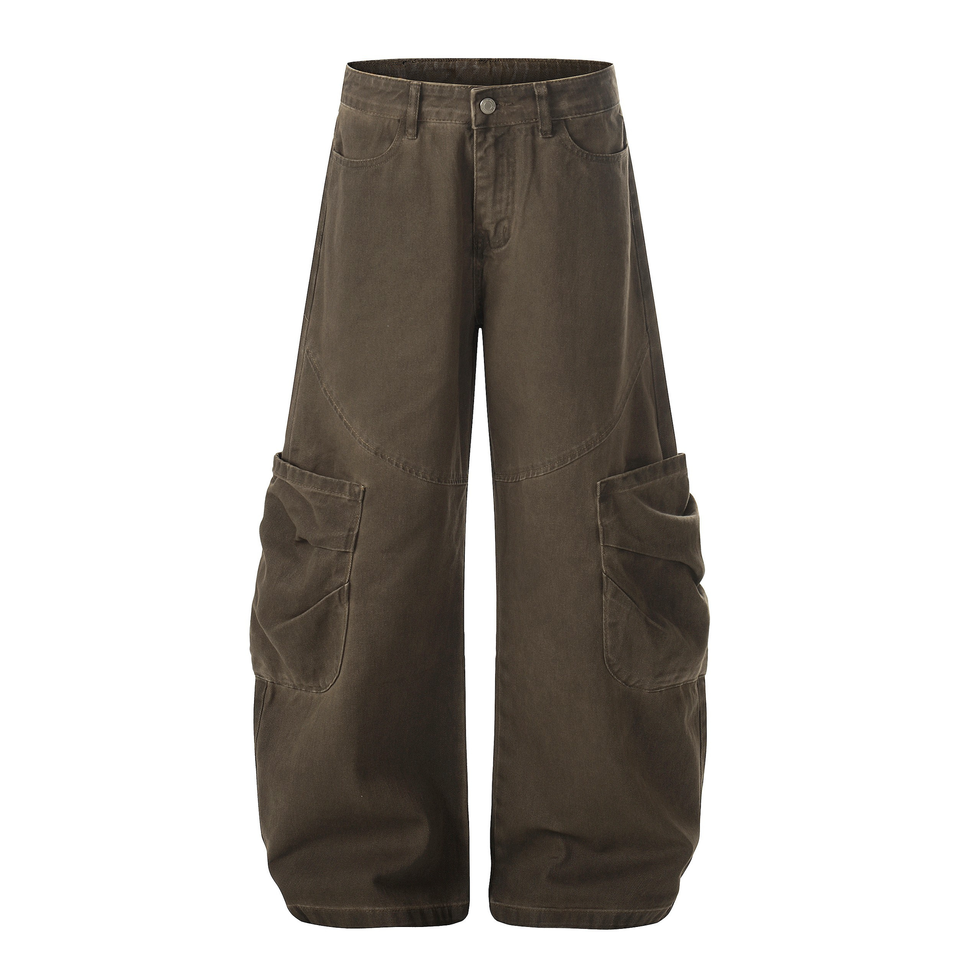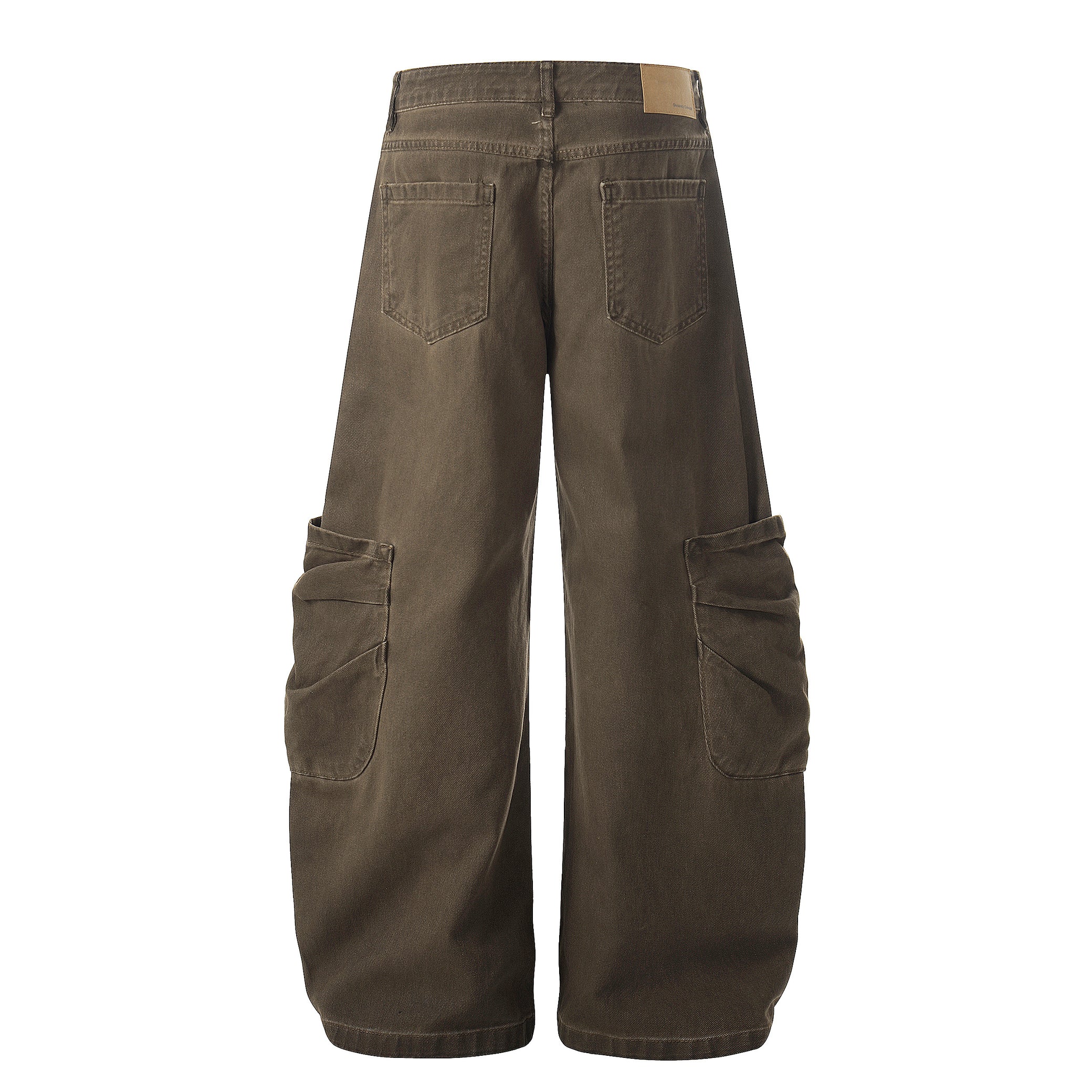 Clothing details: Wide-leg fit, washed cotton finish, articulated panel seams, oversized utility cargo pockets, classic five-pocket construction, sturdy waistband with button closure, durable fabric with a natural worn-in texture.