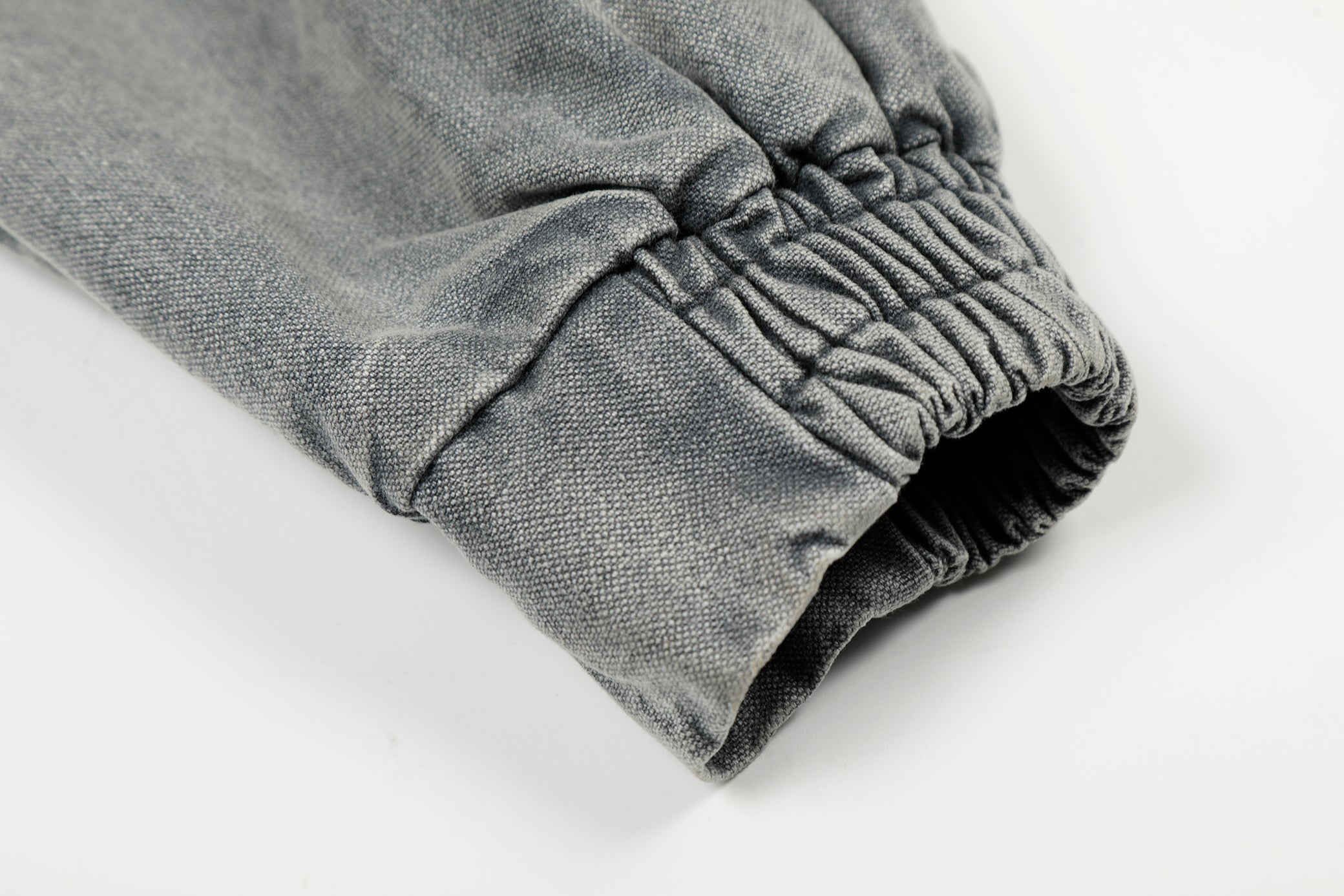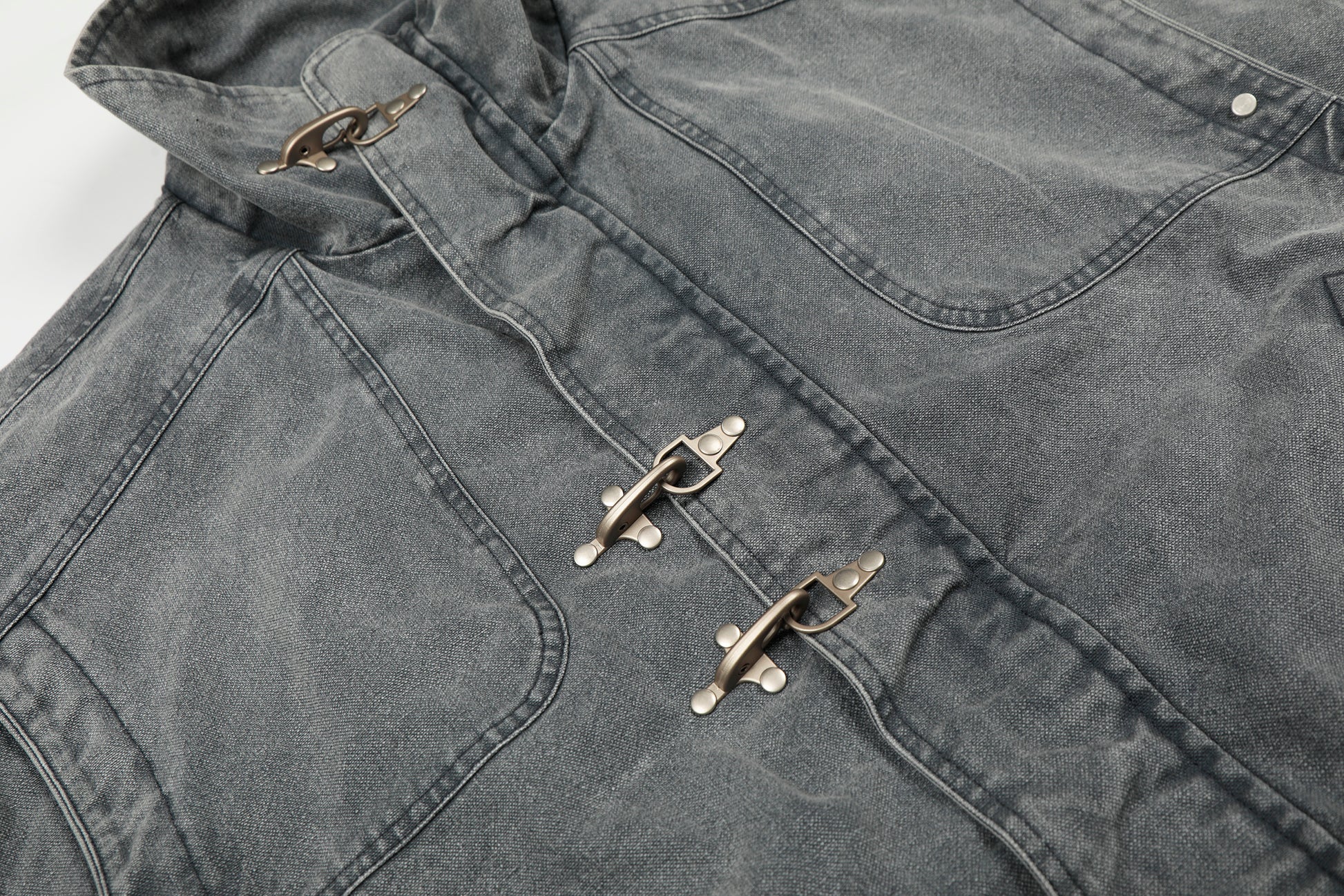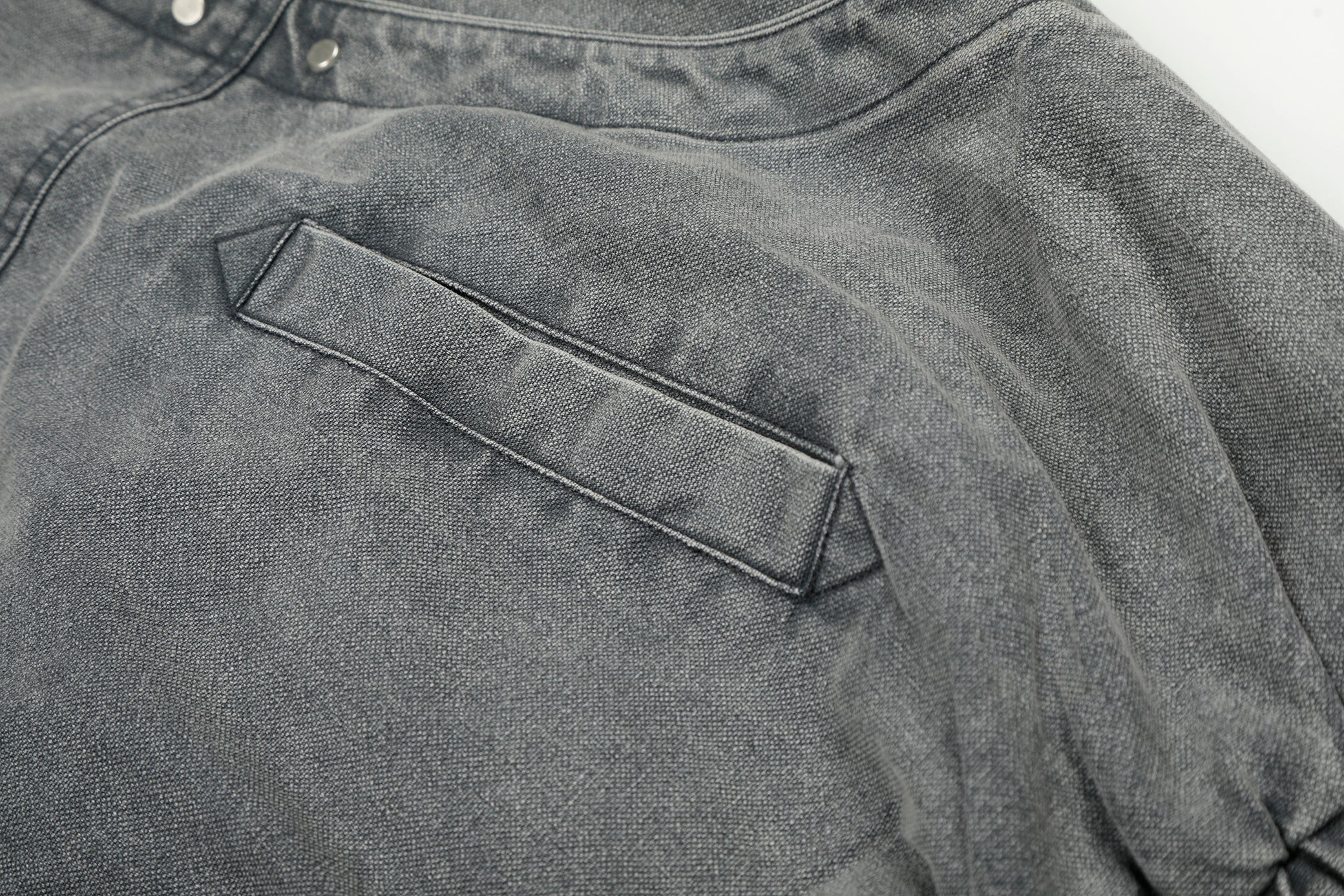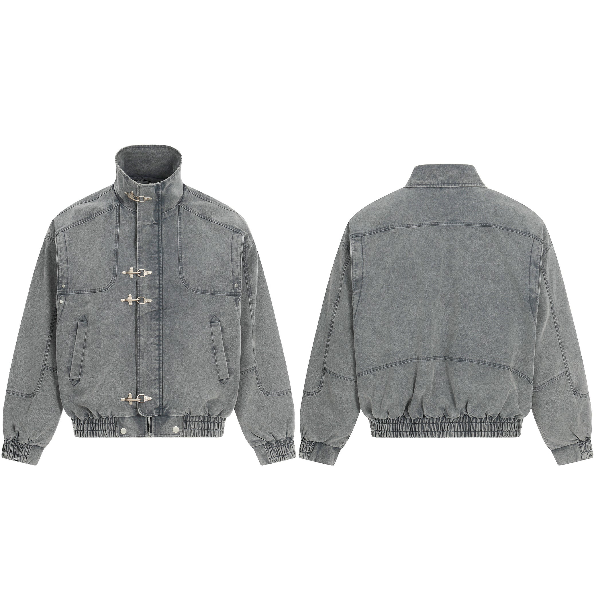 Clothing details: Washed cotton finish, stand collar with buckle closures, front utility pockets, elasticated hem, structured jacket silhouette.