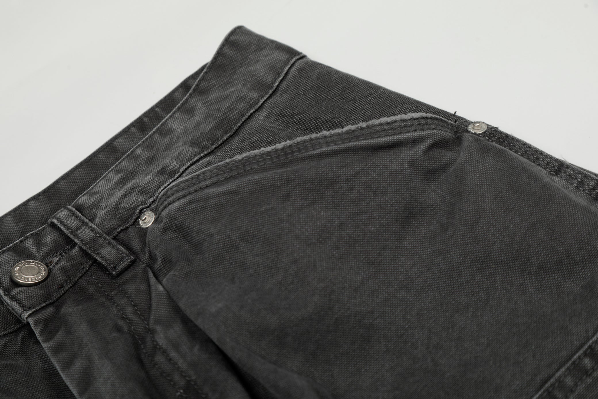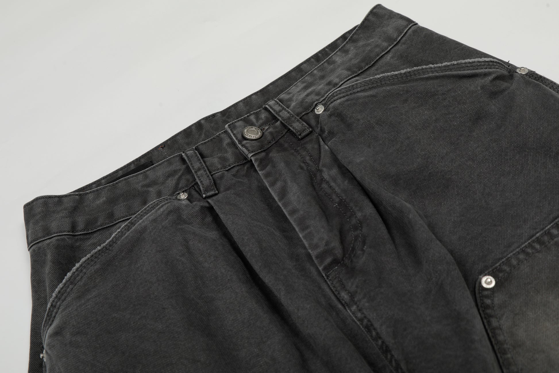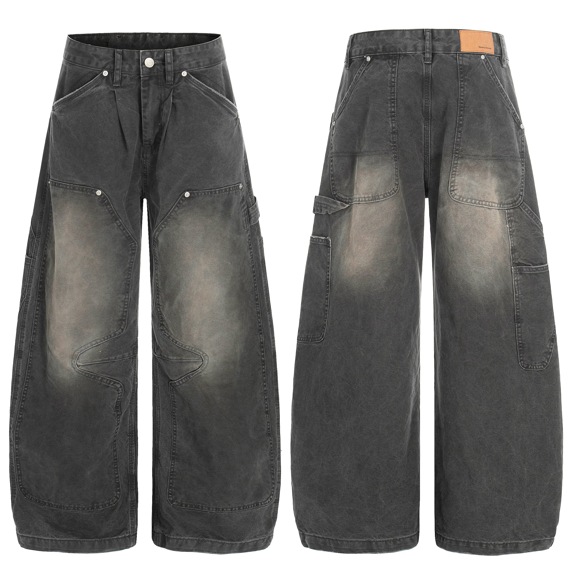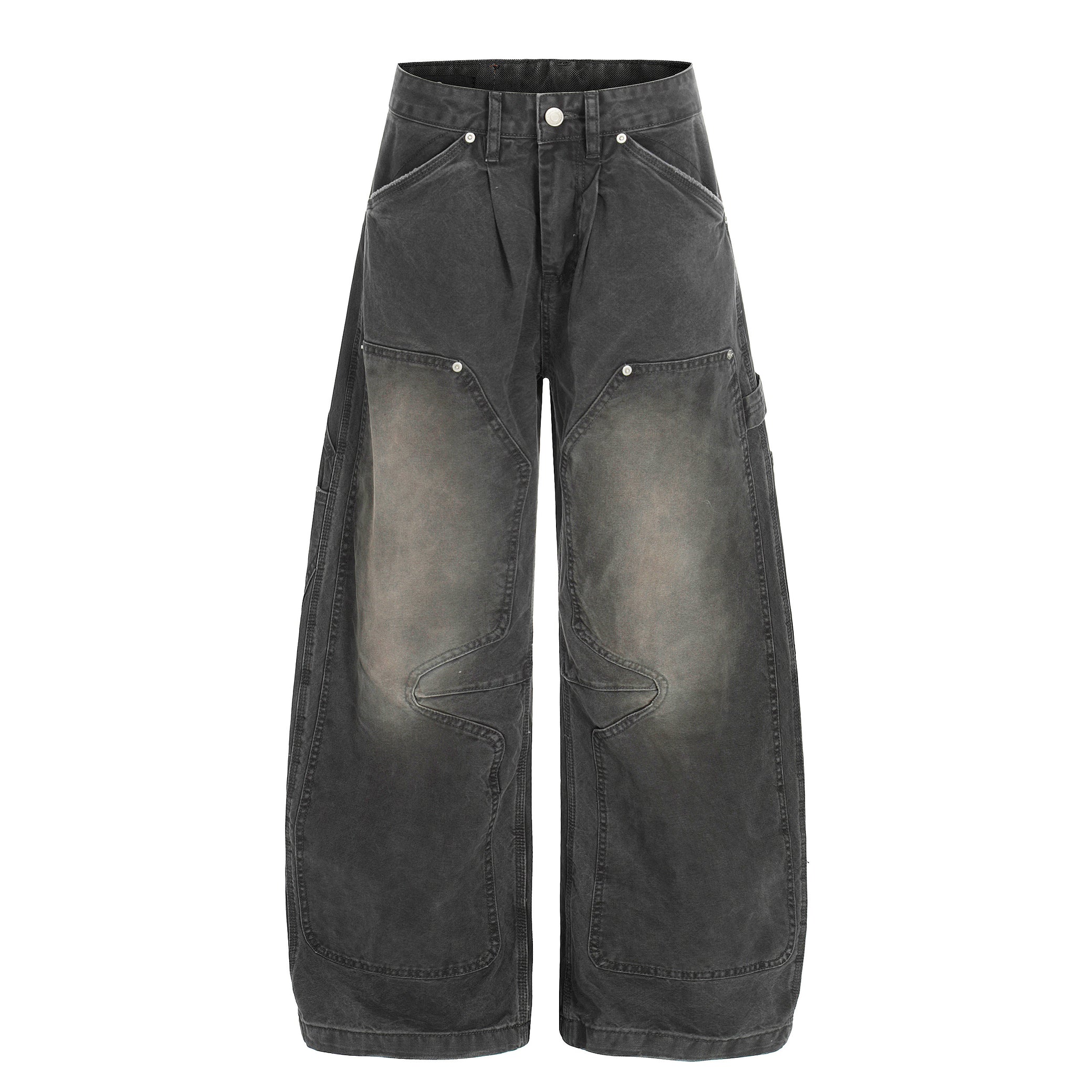 Clothing details: Heavy washed fade effect, wide-leg oversized fit, multi utility cargo pockets, sculpted panel stitching, zip fly with button closure, classic five-pocket base, reinforced seams for durability.