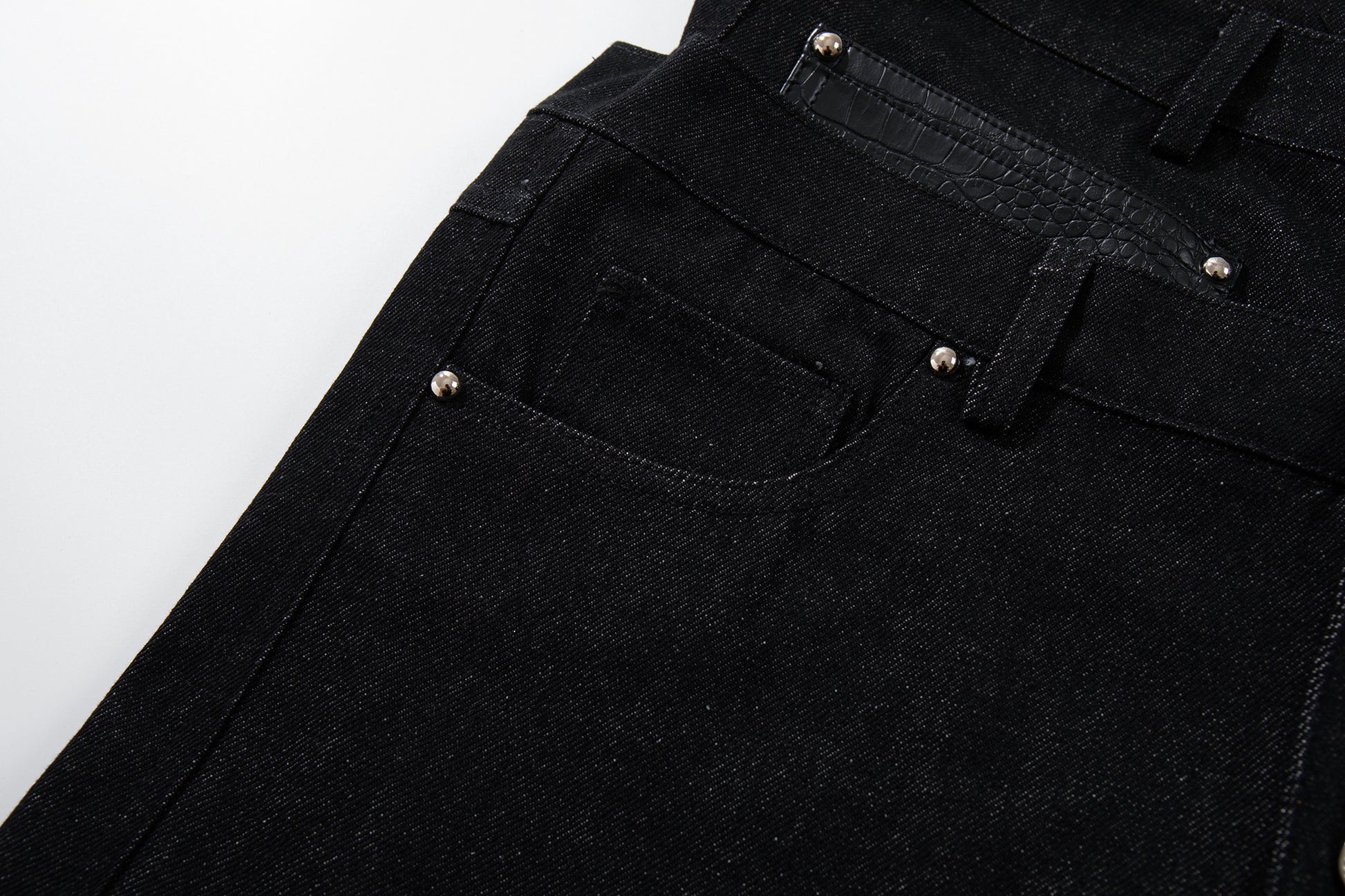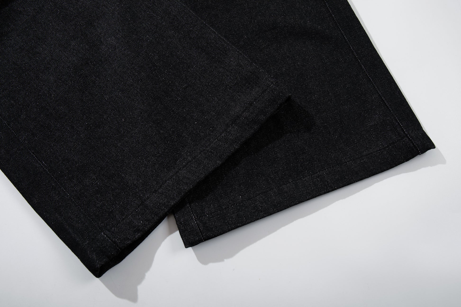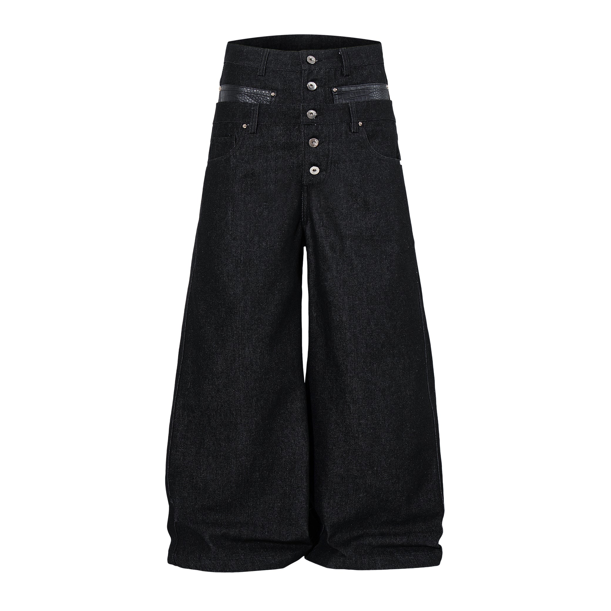 Clothing details: Wide-leg denim pants design, high-rise waist, button fly front closure, reinforced panel construction, contrast pocket detailing, relaxed fit, structured cotton denim fabric.
