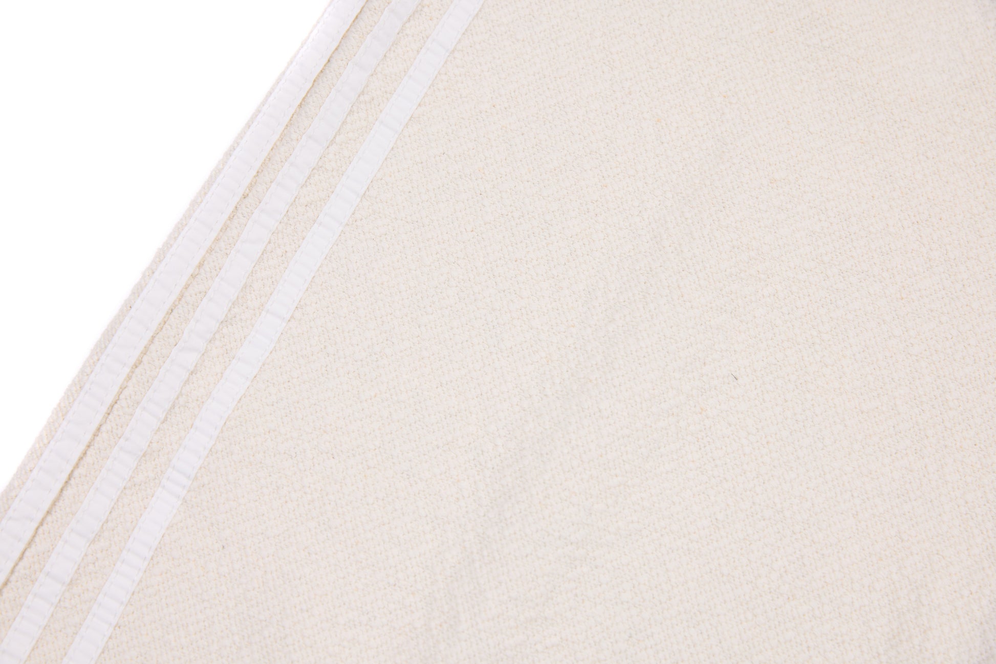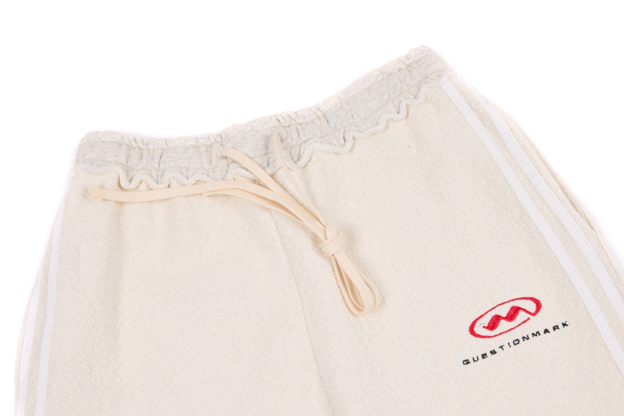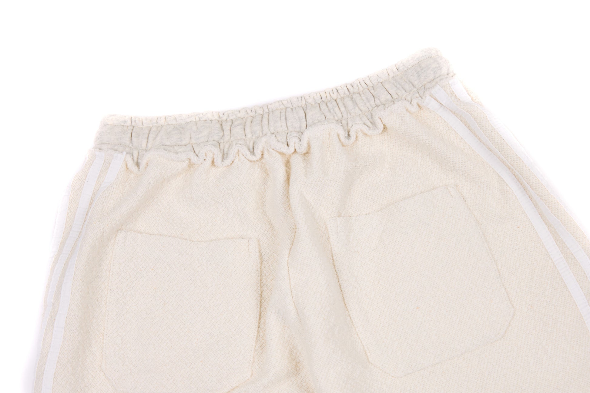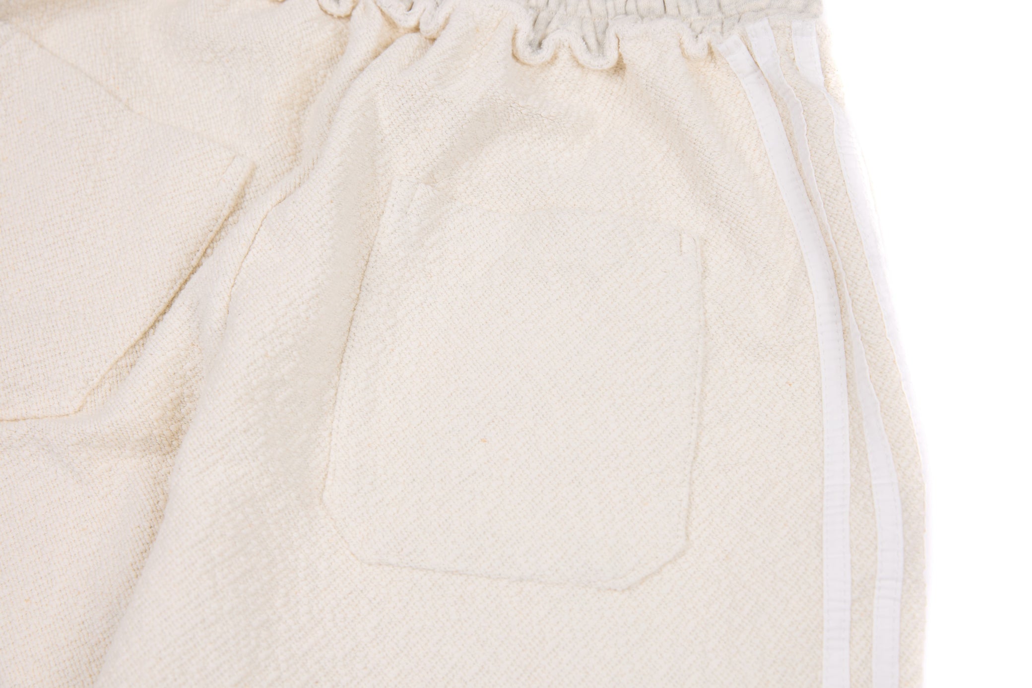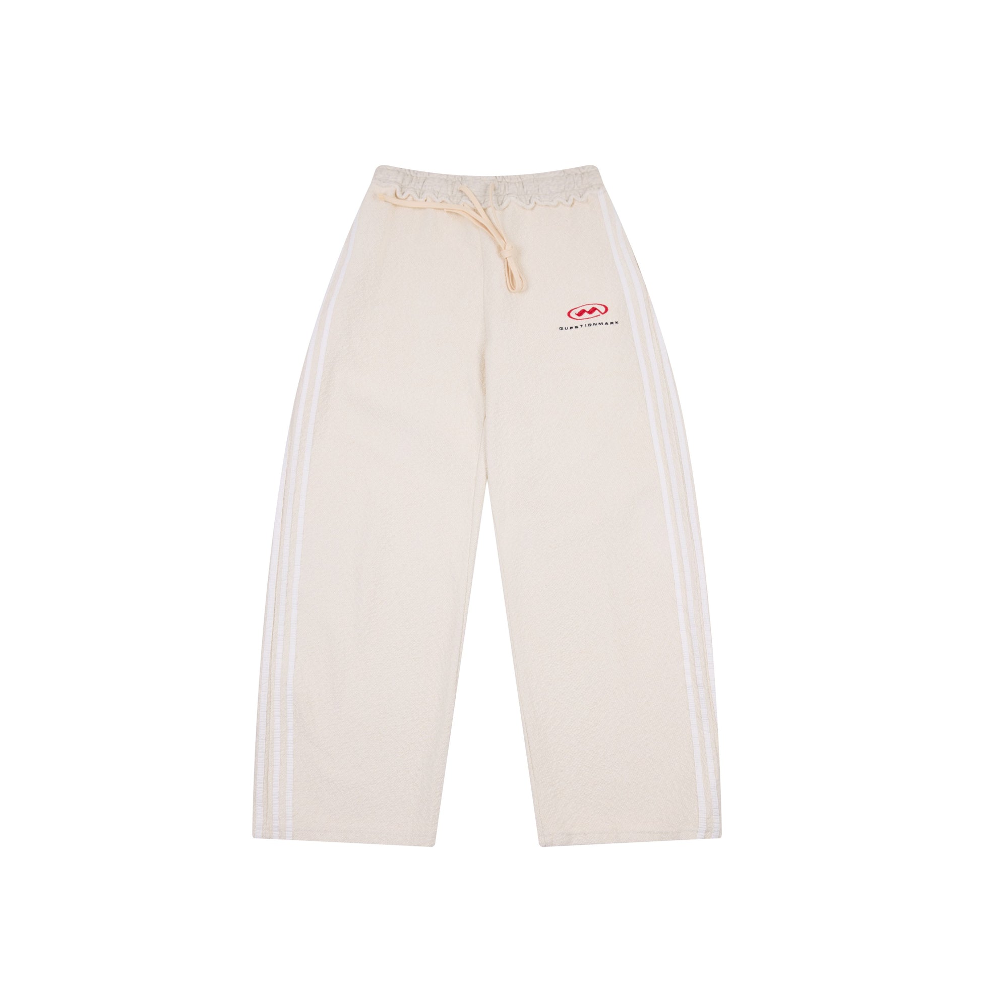 Clothing Details: Wide-leg fit, textured cotton fabric, adjustable drawstring waist, dual side stripes, front logo print