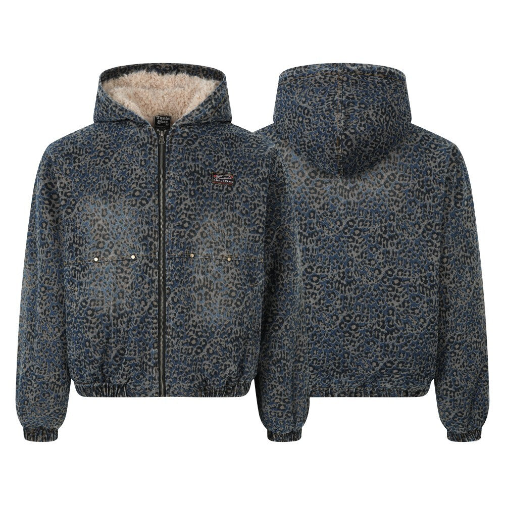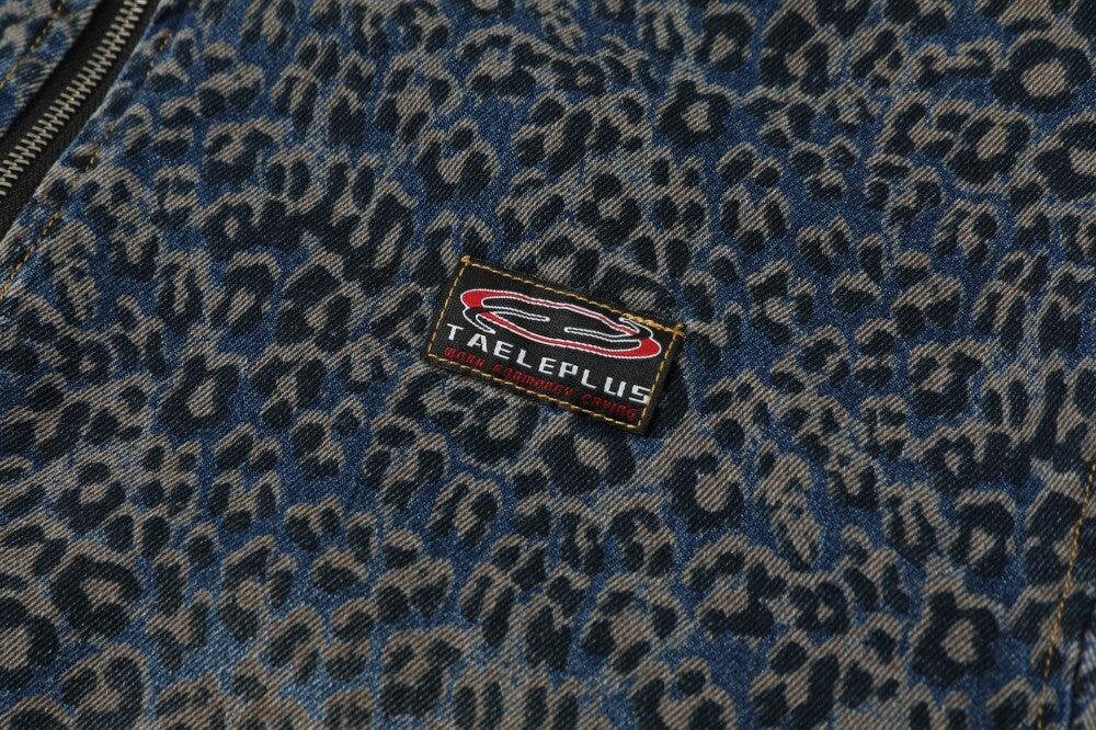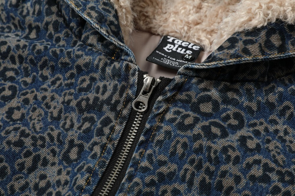 Retro American Blue-Wash Leopard Trim Aviator Quilted Jacket