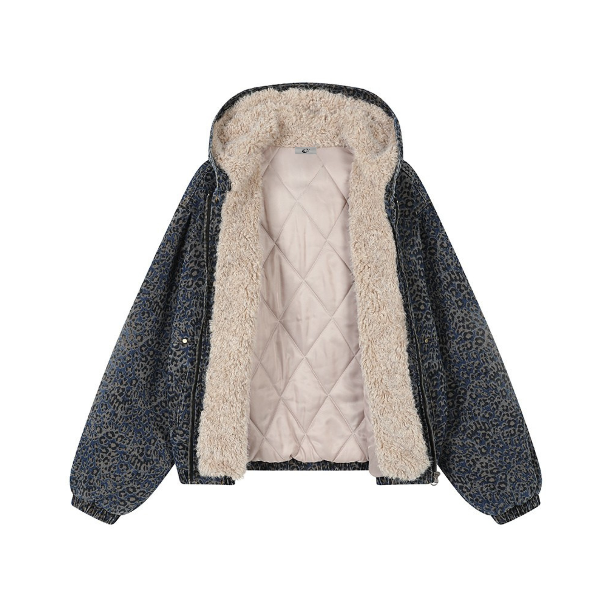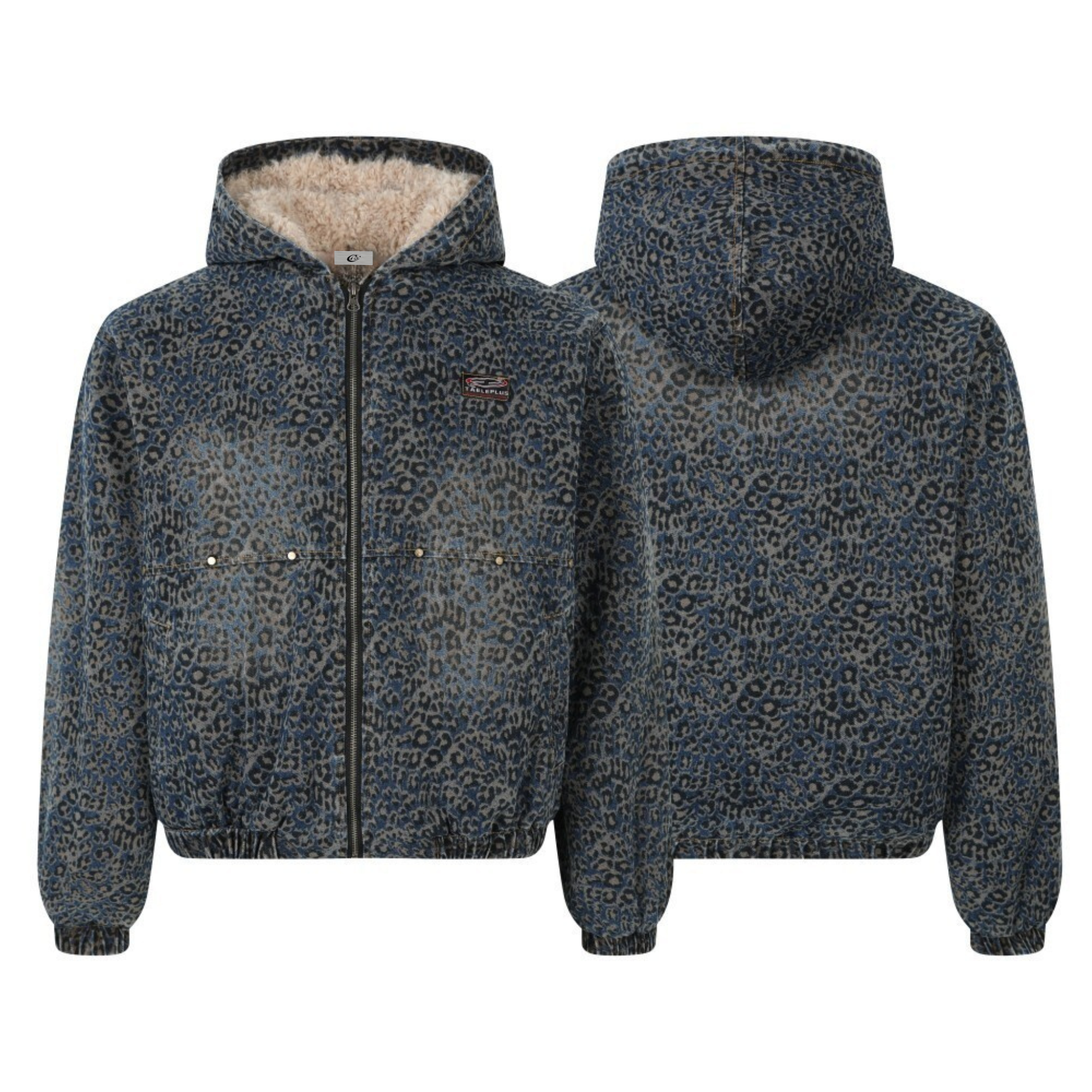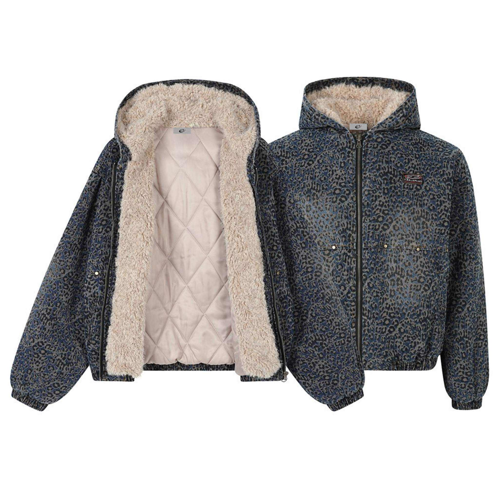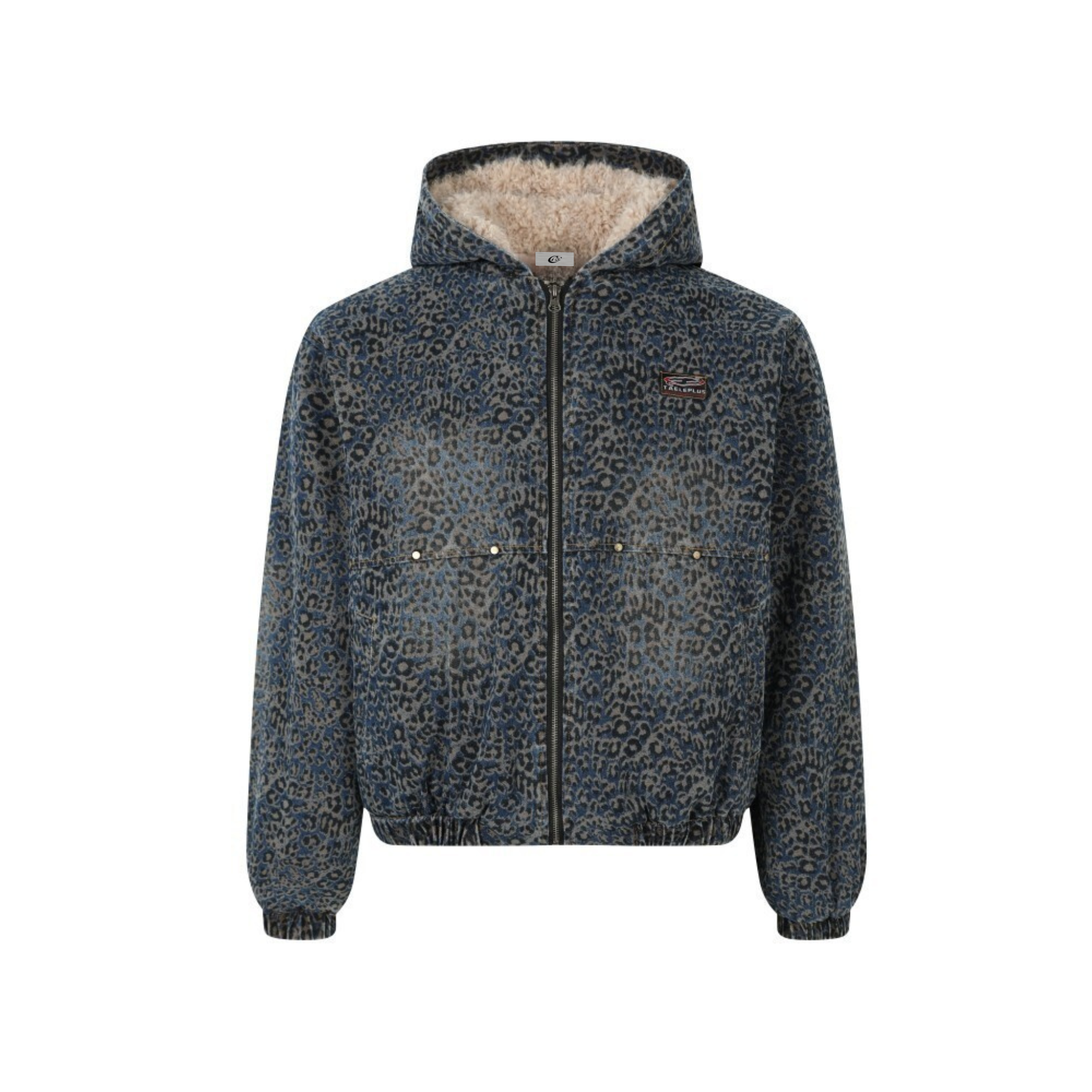 The Omirad Leopard Sherpa-Lined Denim Jacket fuses wild street energy with cozy warmth. Crafted from a sturdy cotton-blend denim base, the washed leopard pattern gives it a distressed vintage vibe, while the full sherpa fleece lining ensures insulation and comfort. Perfect for layering in colder weather, it balances bold attitude with soft texture.