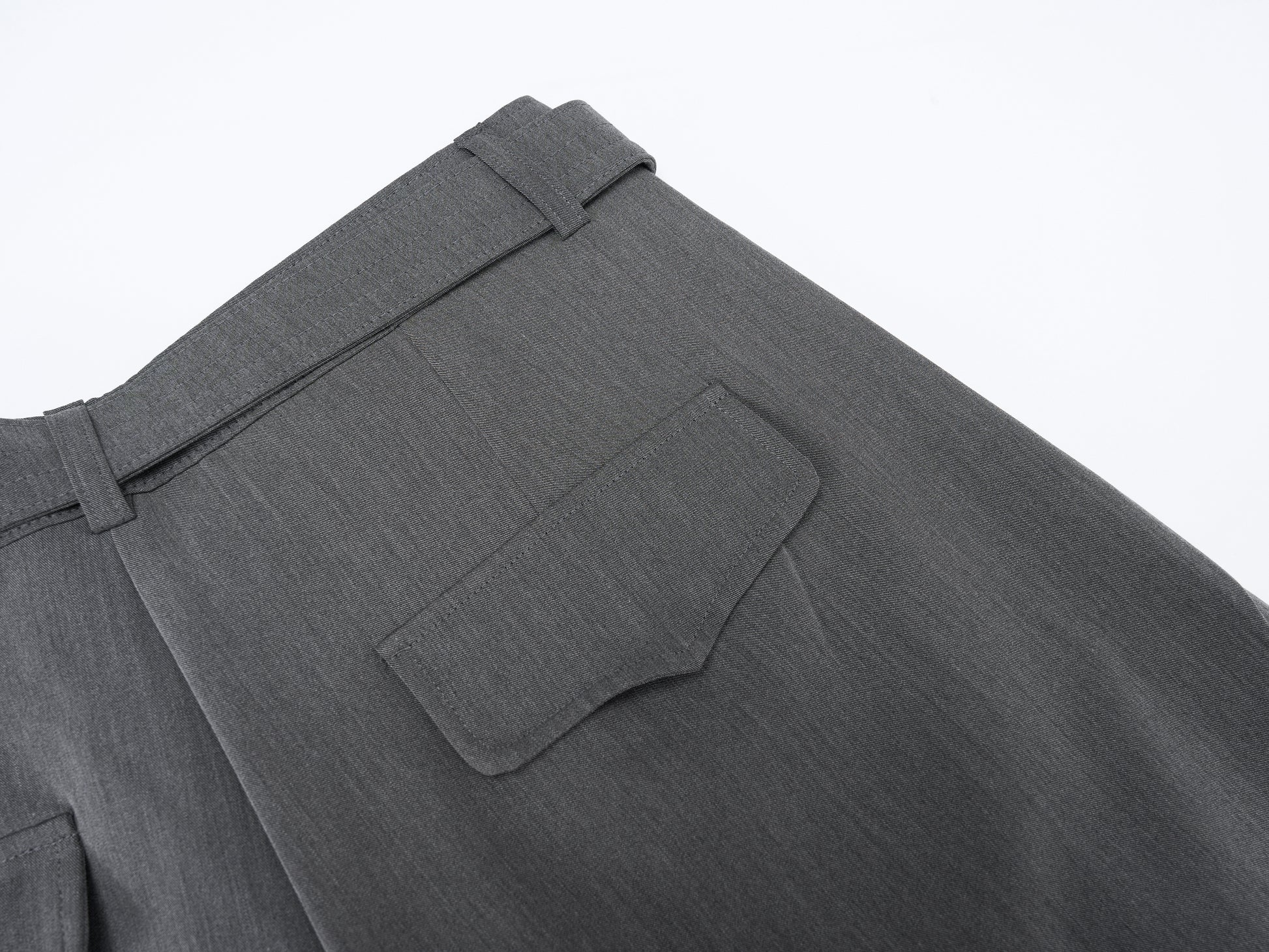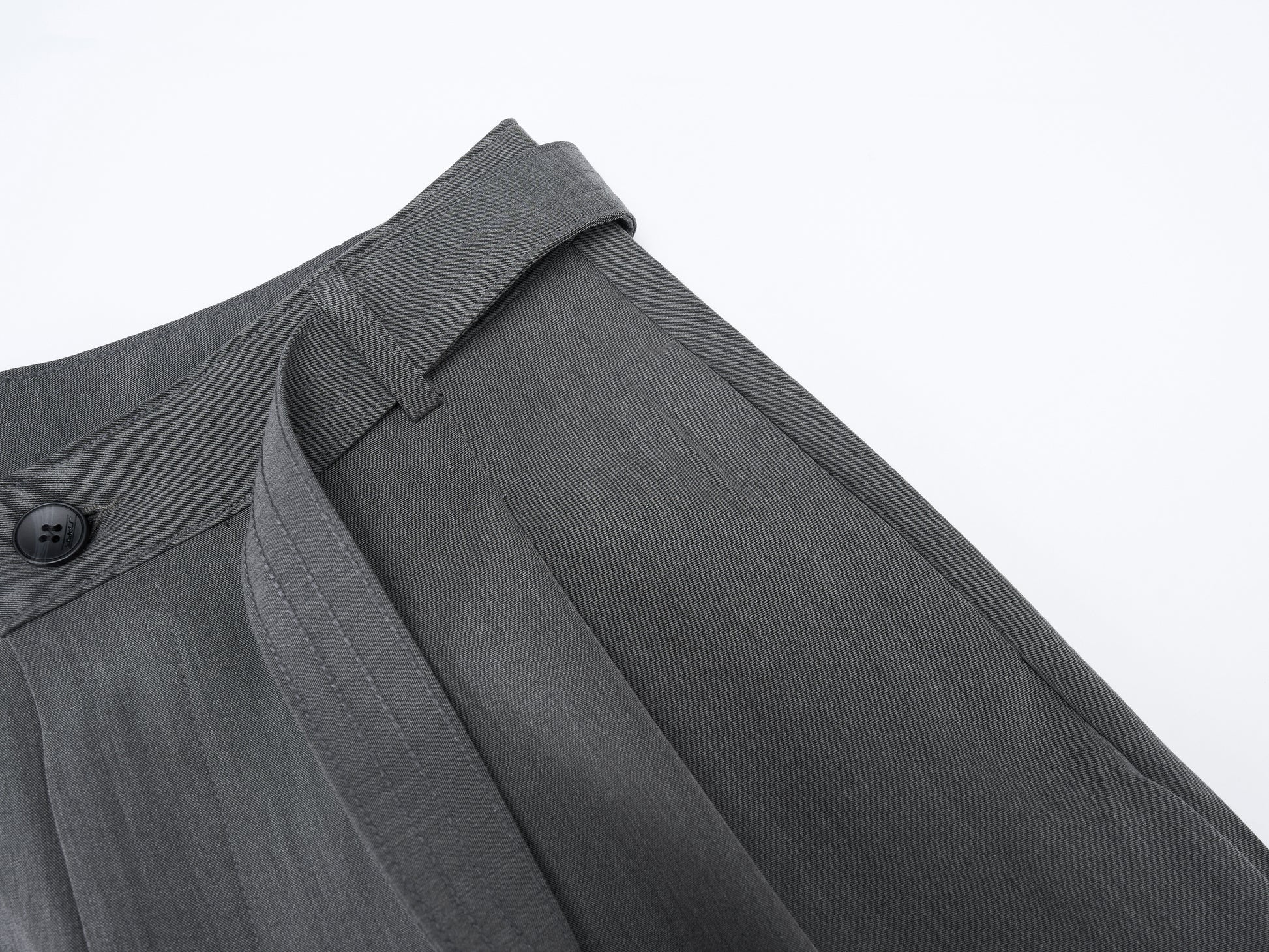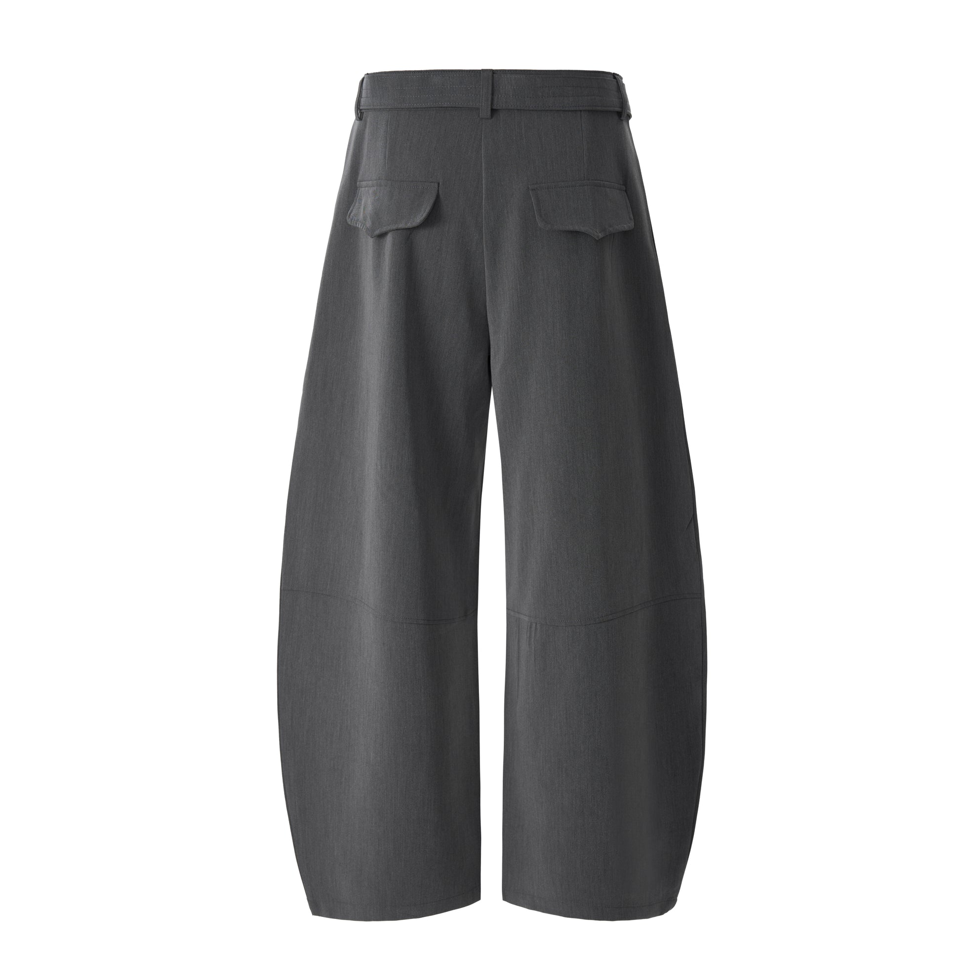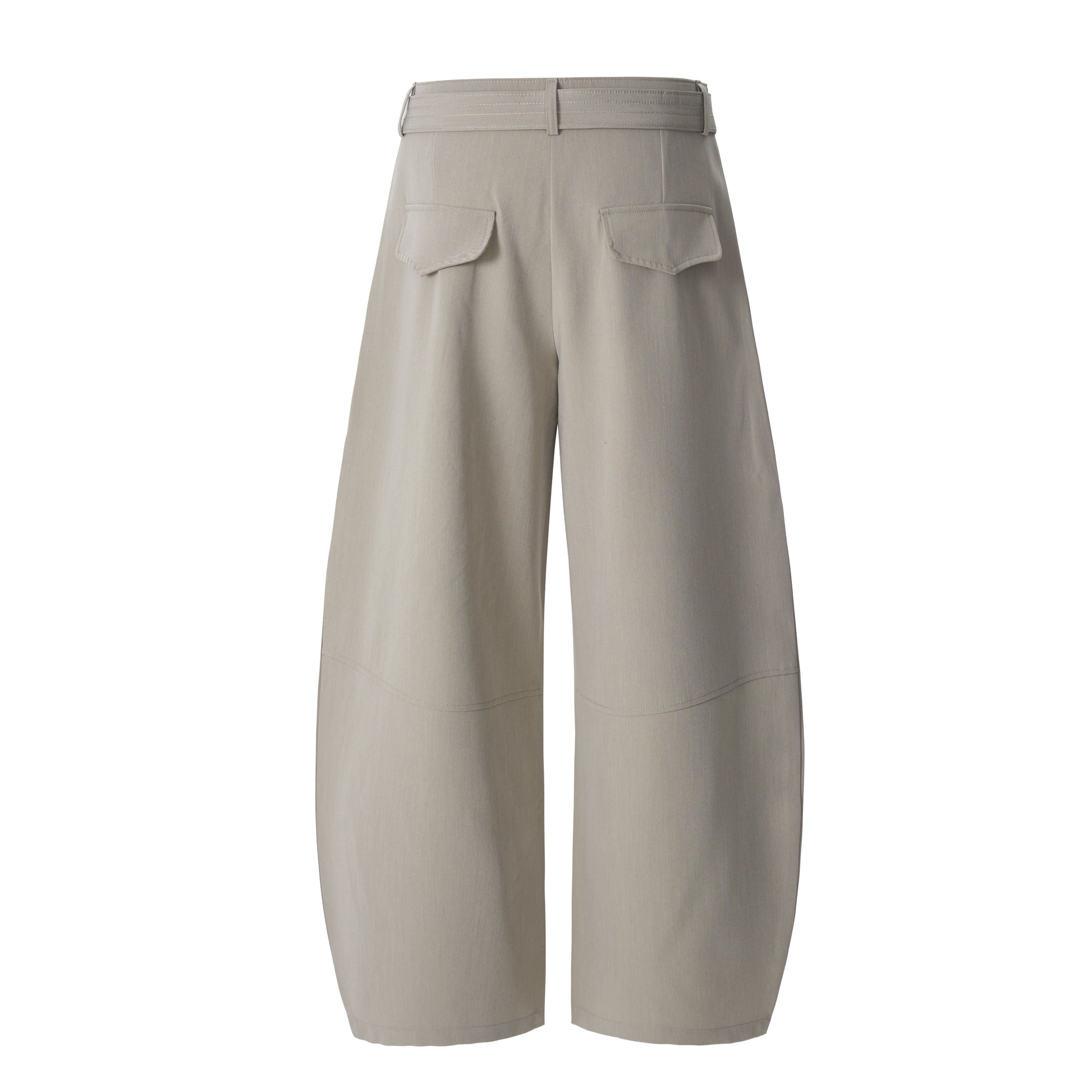 Clothing details: Barrel-leg silhouette, double front pleats, built-in fabric belts, smooth matte texture, and Omirad signature structured tailoring.