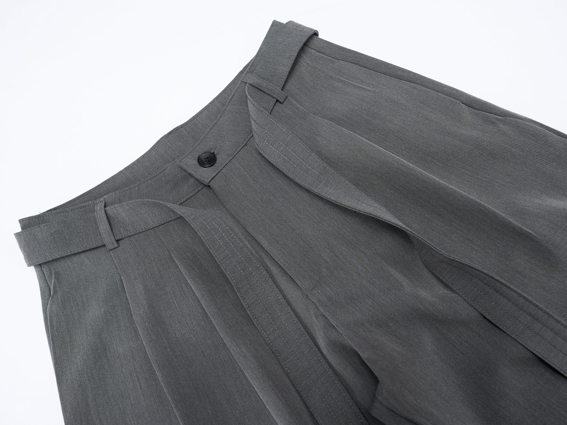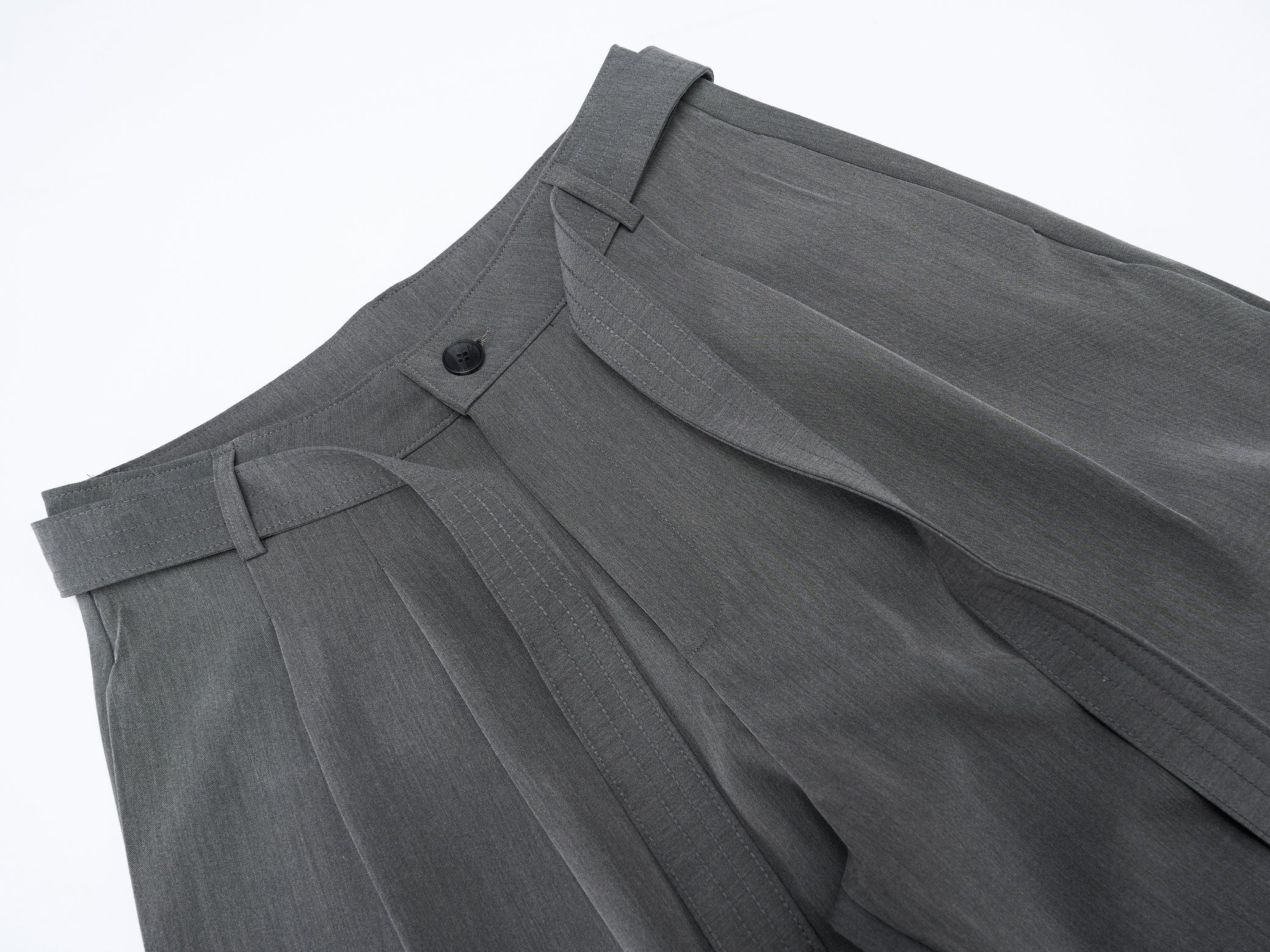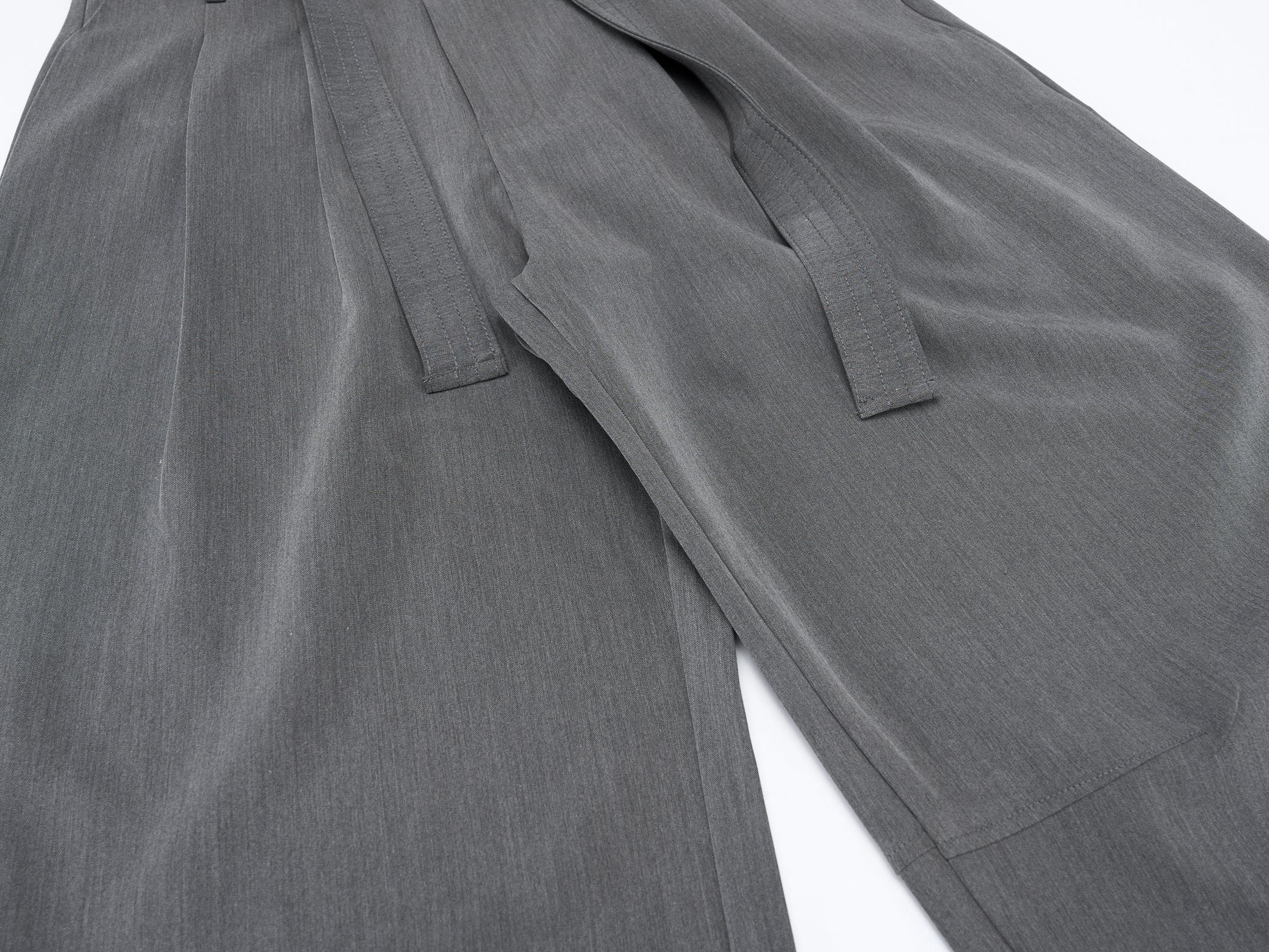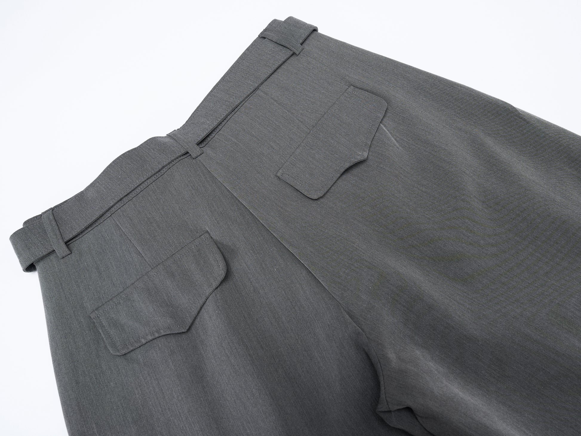 Clothing details: Barrel-leg silhouette, double front pleats, built-in fabric belts, smooth matte texture, and Omirad signature structured tailoring.