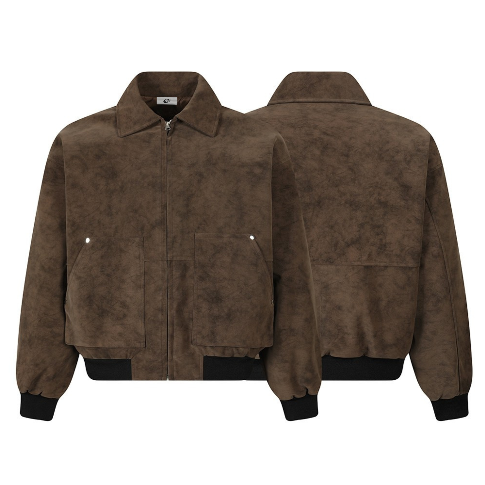 Clothing details: Suede-textured surface, front zip closure, oversized flap pockets, ribbed hem and cuffs, structured collar design