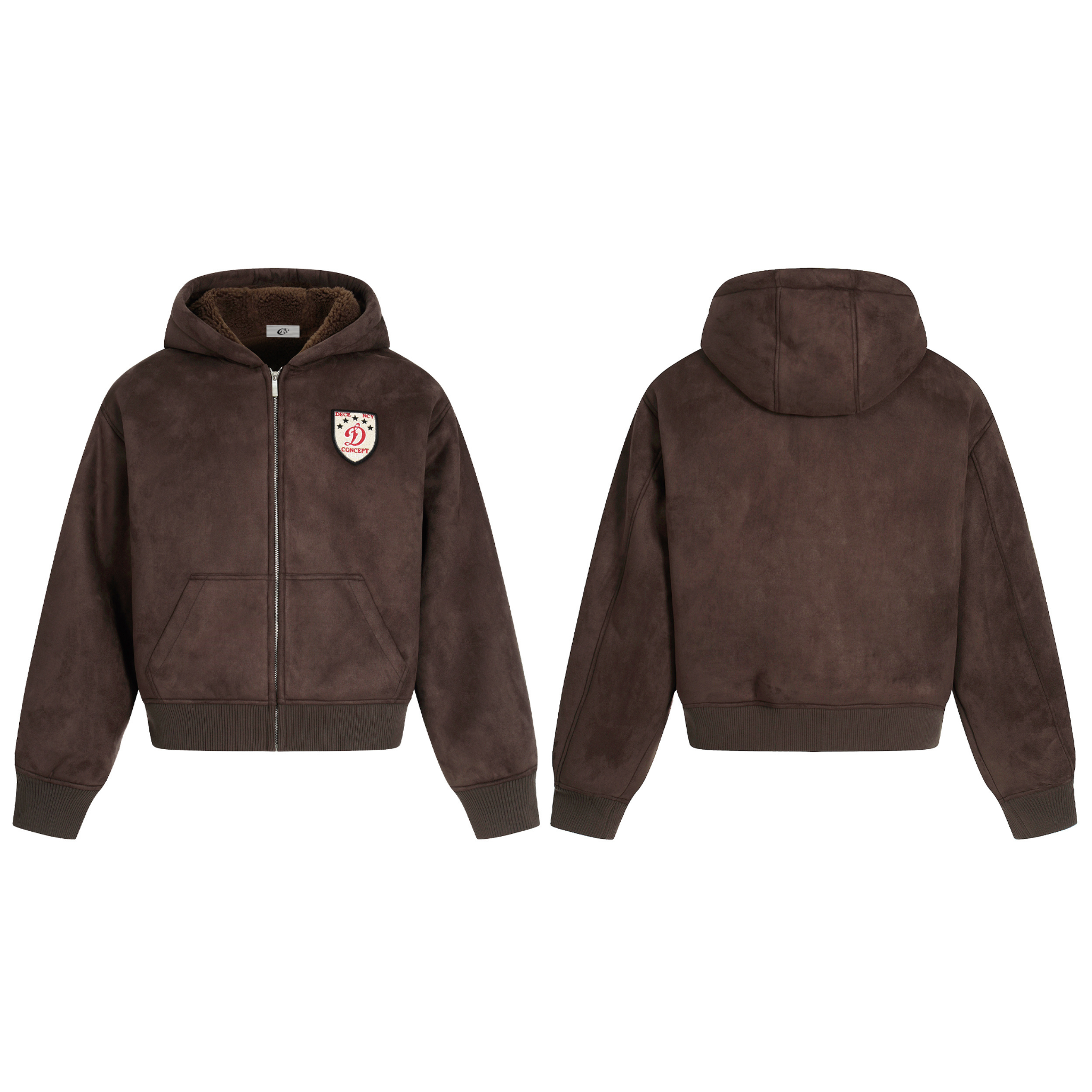 The Omirad Fleece-Lined Brown Hooded Jacket blends vintage athletic aesthetics with cozy winter functionality. Crafted from soft, high-density polyester fabric, it offers a suede-like matte finish and an ultra-warm fleece lining throughout the interior. The cropped silhouette is complemented by ribbed hems for structure and comfort, while the embroidered crest patch on the chest adds a subtle retro sports touch. Perfect for pairing with wide-leg jeans or sweatpants for a laid-back, high-street look.