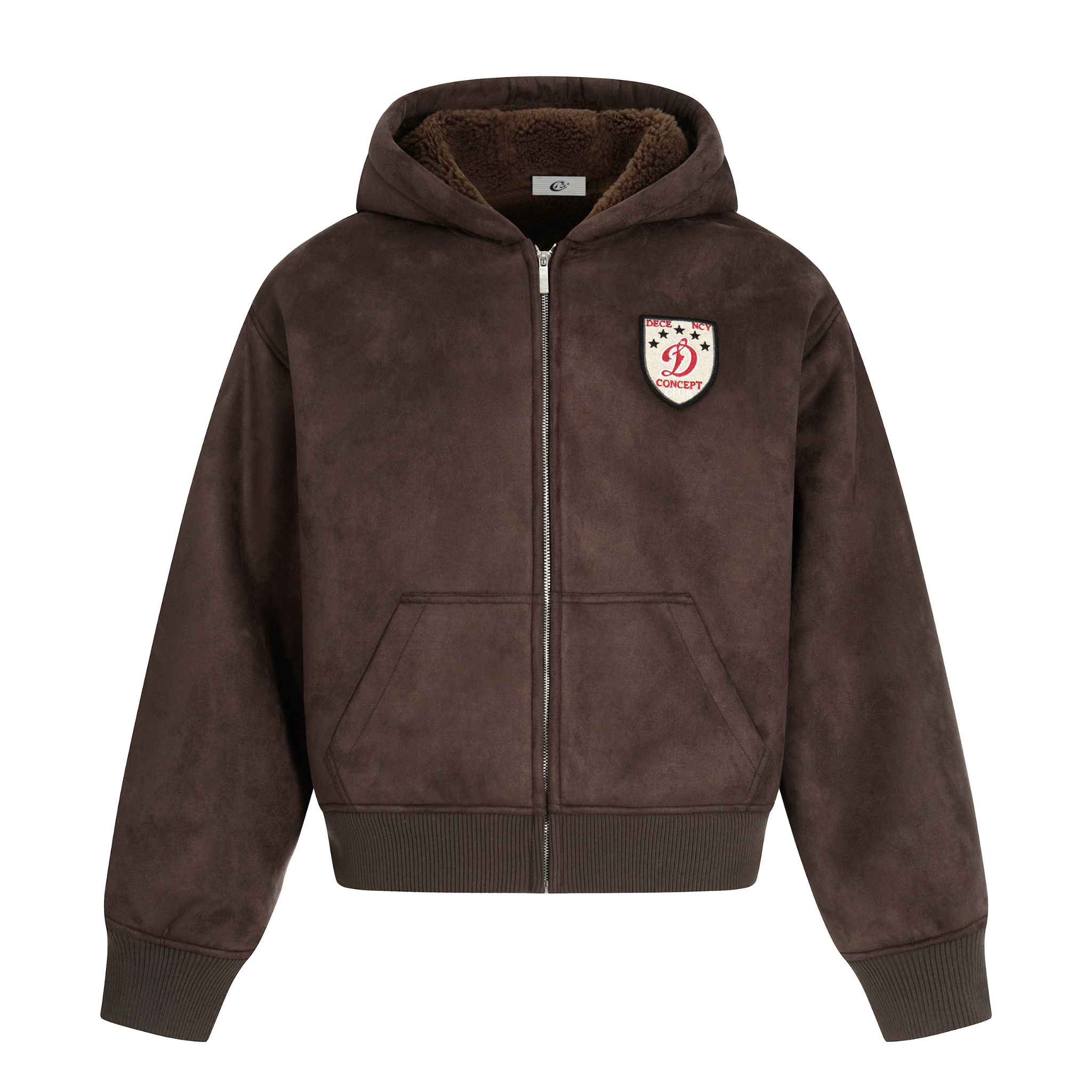 Clothing Details: Fleece interior lining, suede-texture shell, embroidered badge detail, ribbed cuffs and hem, full-zip front closure