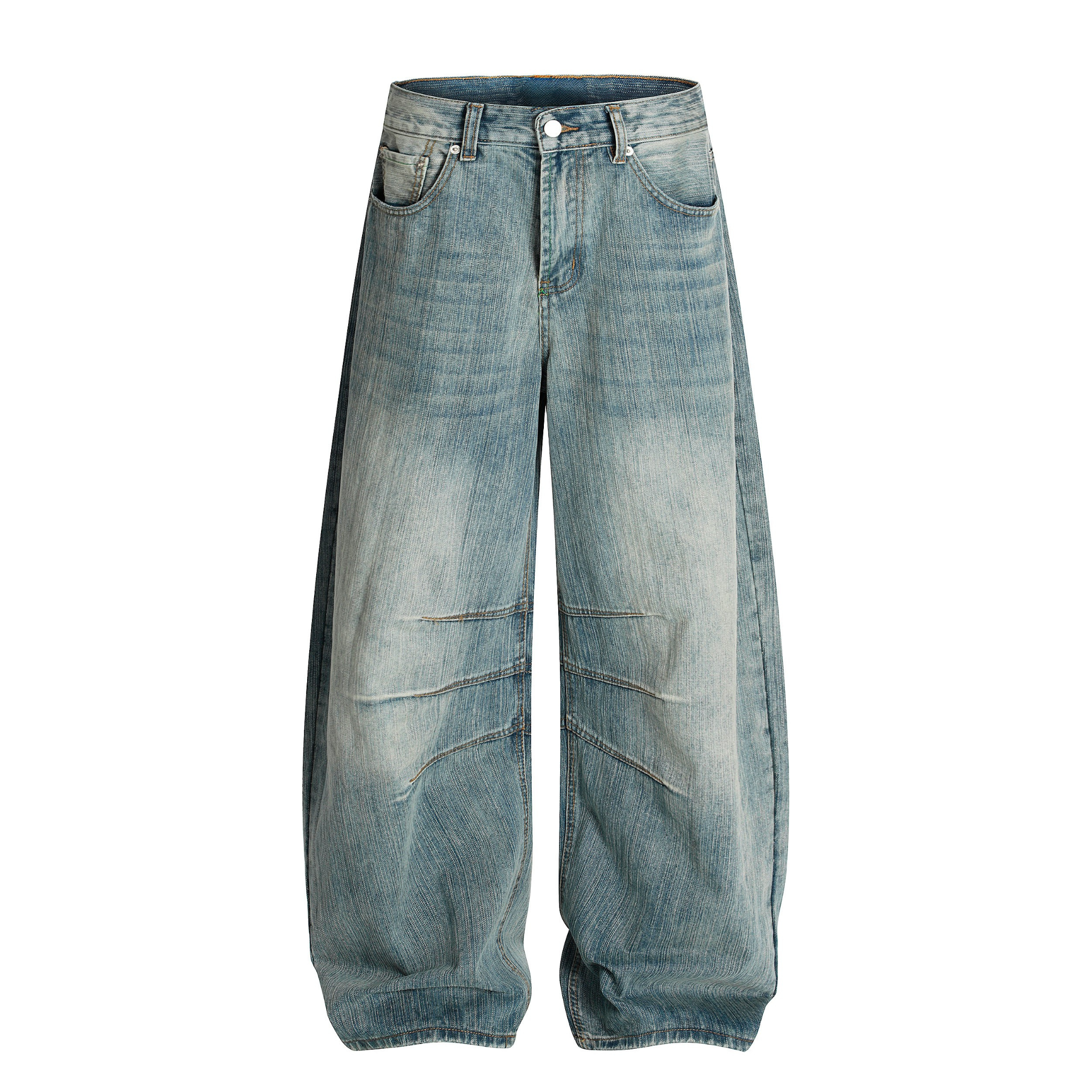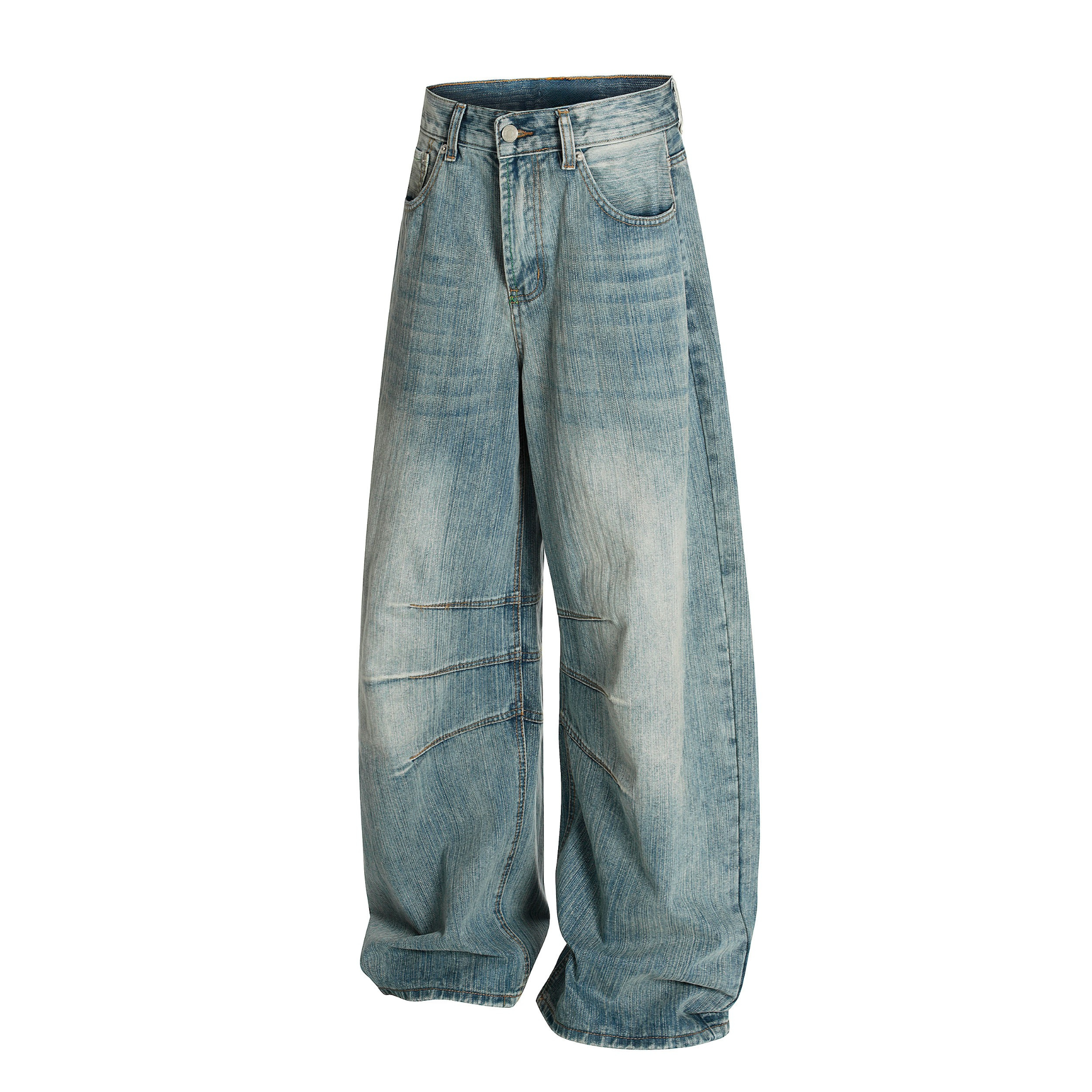 The Omirad Draped Crease Wide-Leg Jeans bring a sculpted, lived-in look to oversized denim silhouettes. Designed with layered crease detailing along the knees, these jeans create a natural draped effect that enhances the volume of the wide-leg shape. The soft light-wash finish adds vintage texture, while the stacked hem completes the relaxed streetwear vibe.