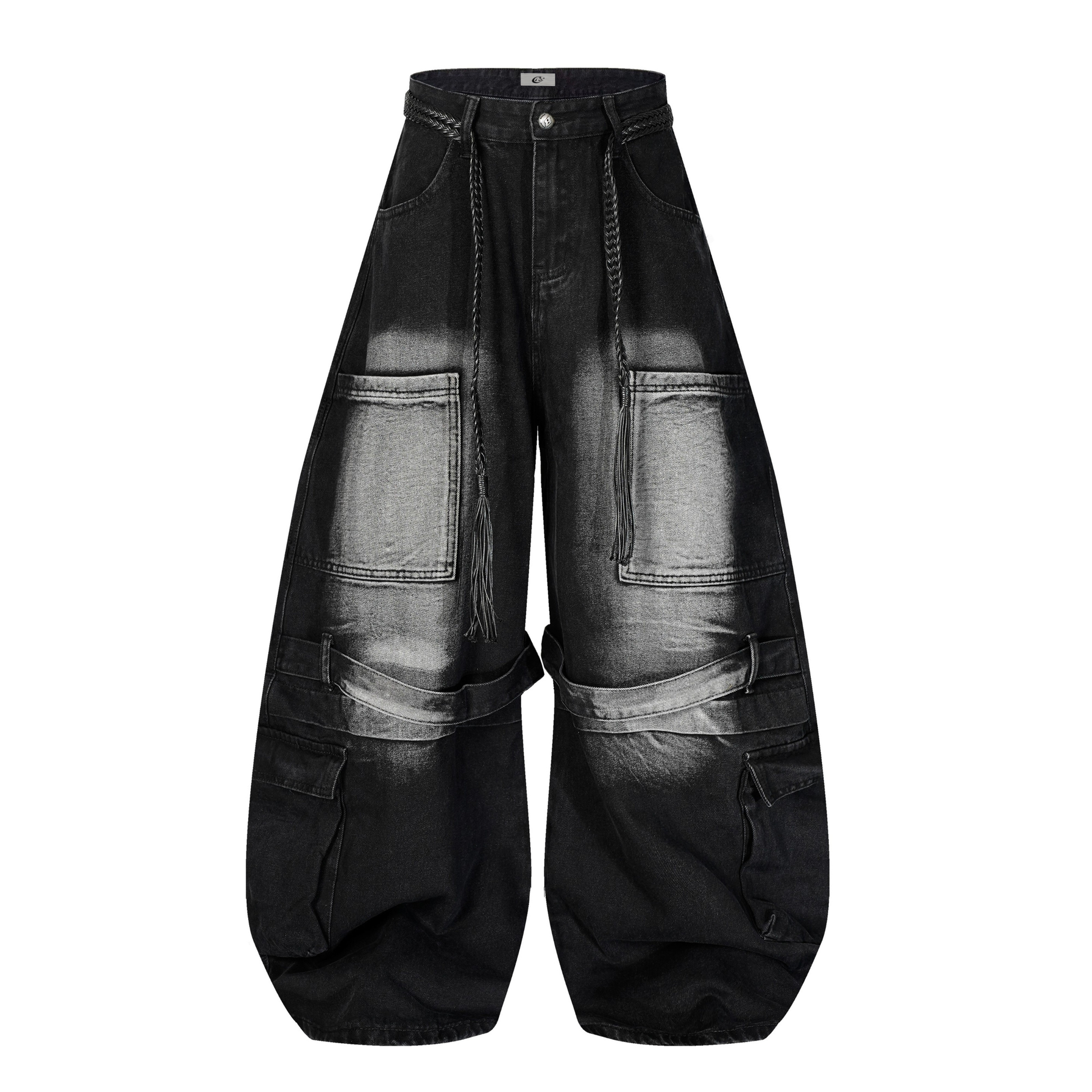 Clothing details: Arc-leg silhouette, layered utility pockets, washed gradient effect, braided rope details