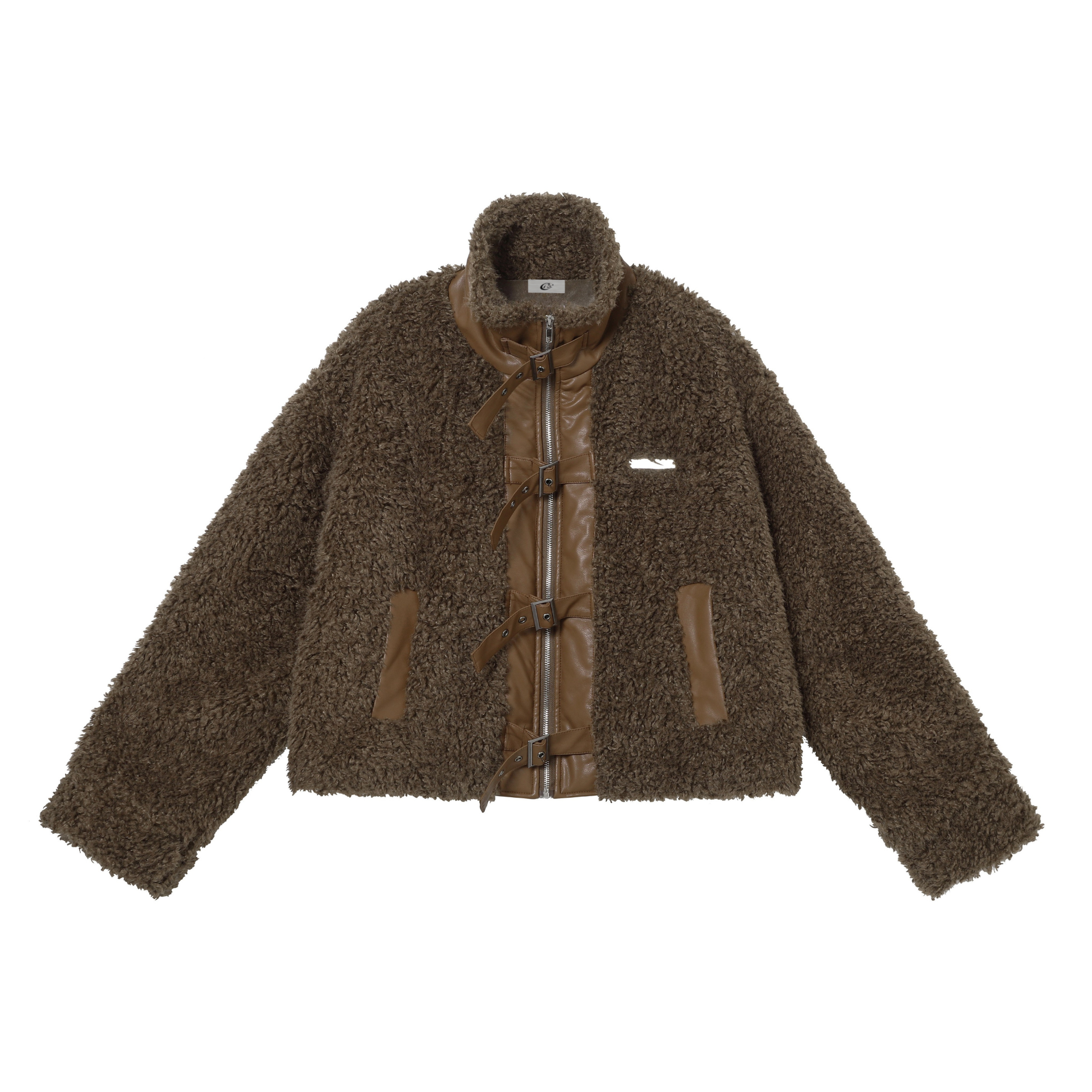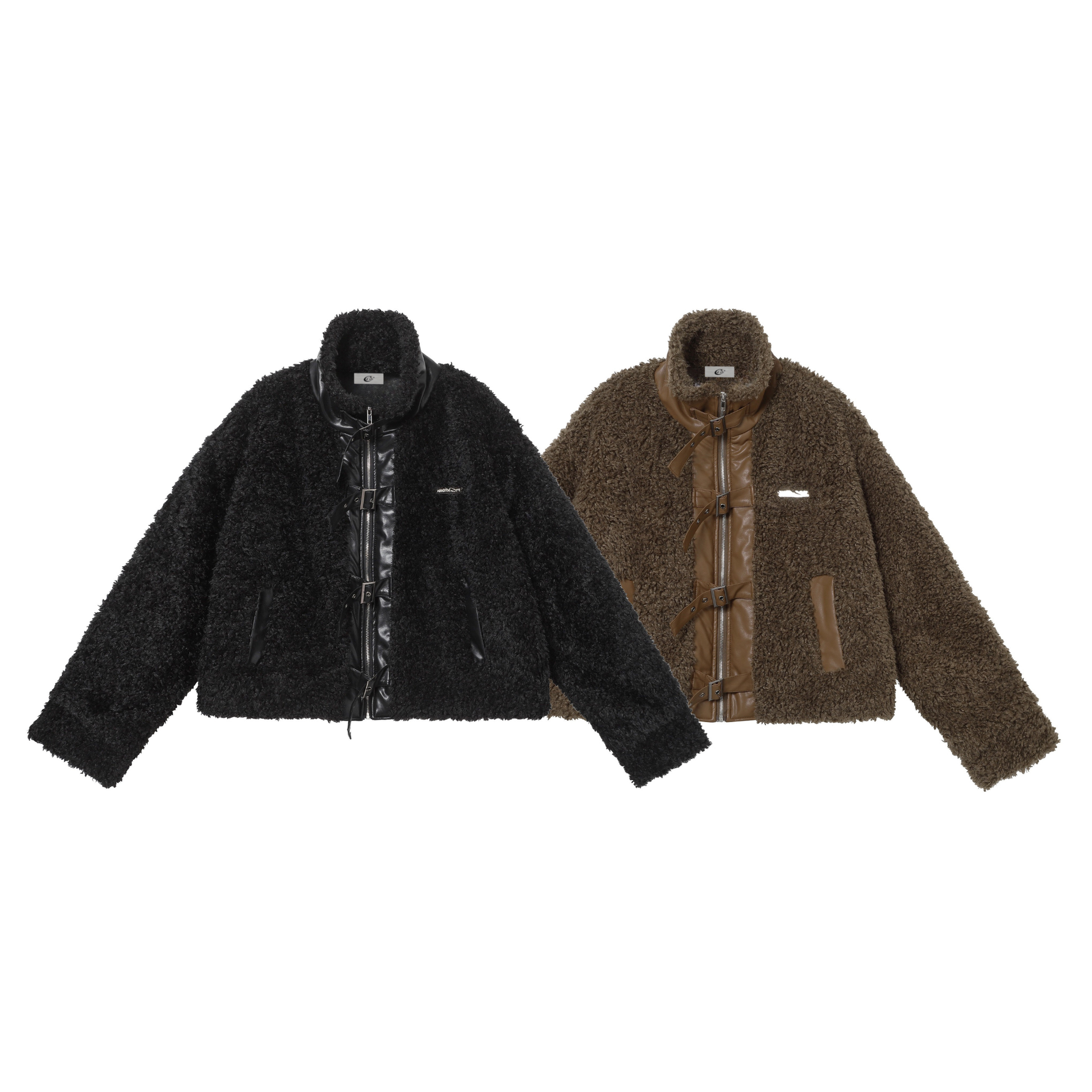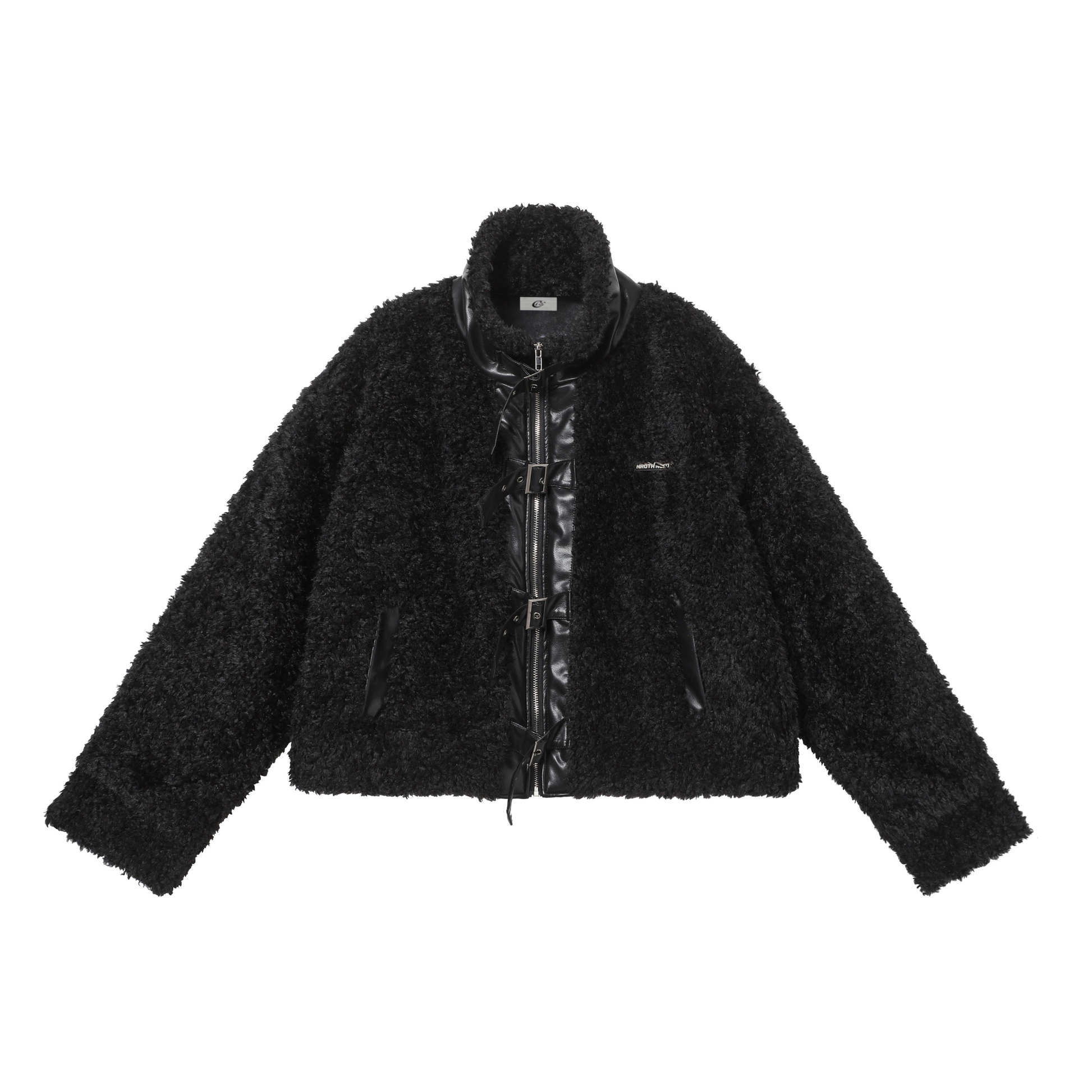 Clothing details: Faux leather patchwork, sherpa texture, buckle & zipper closure, side pockets, stand collar, cropped fit.