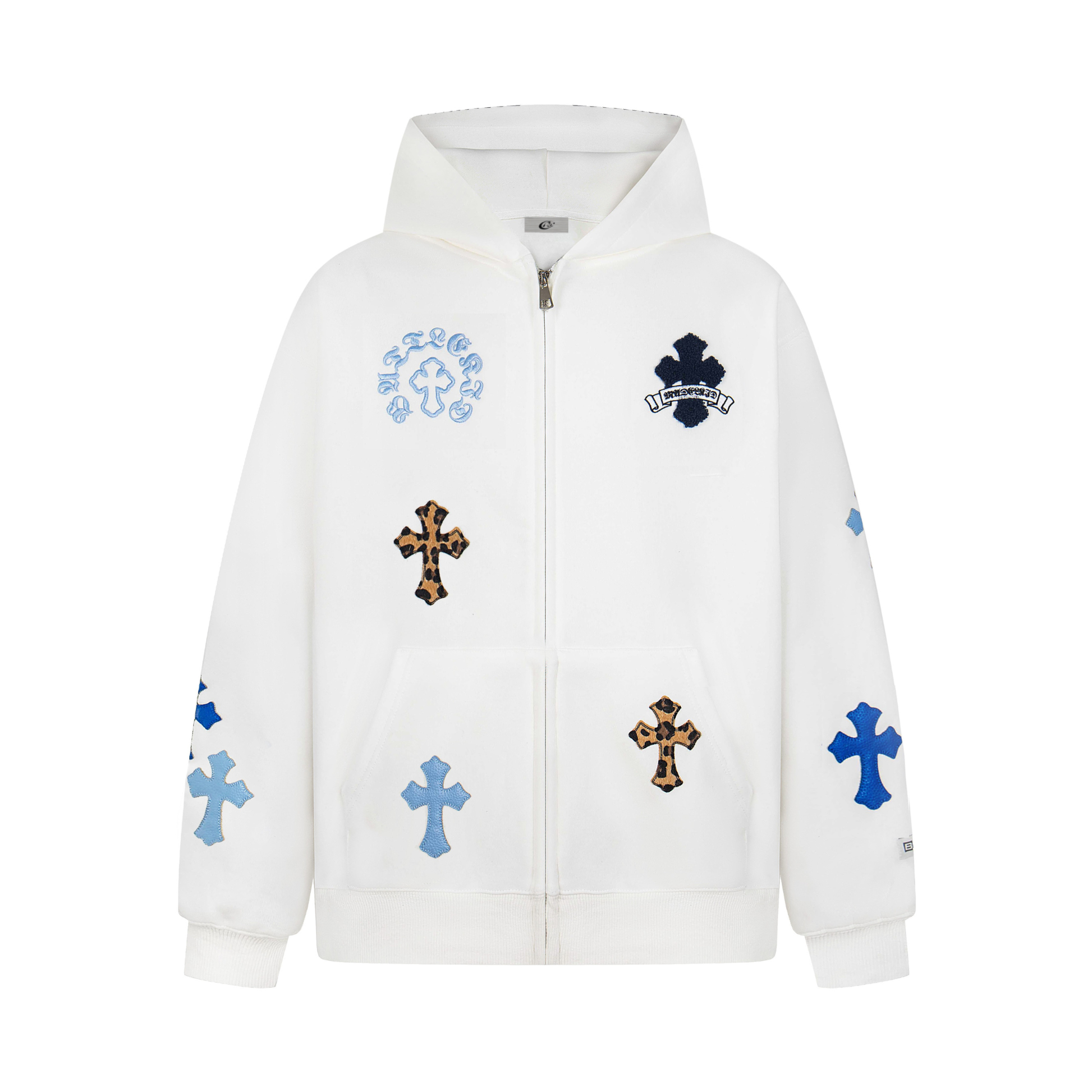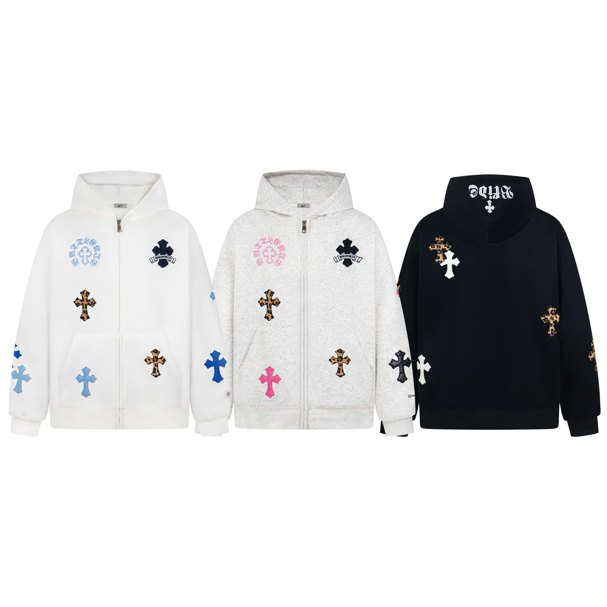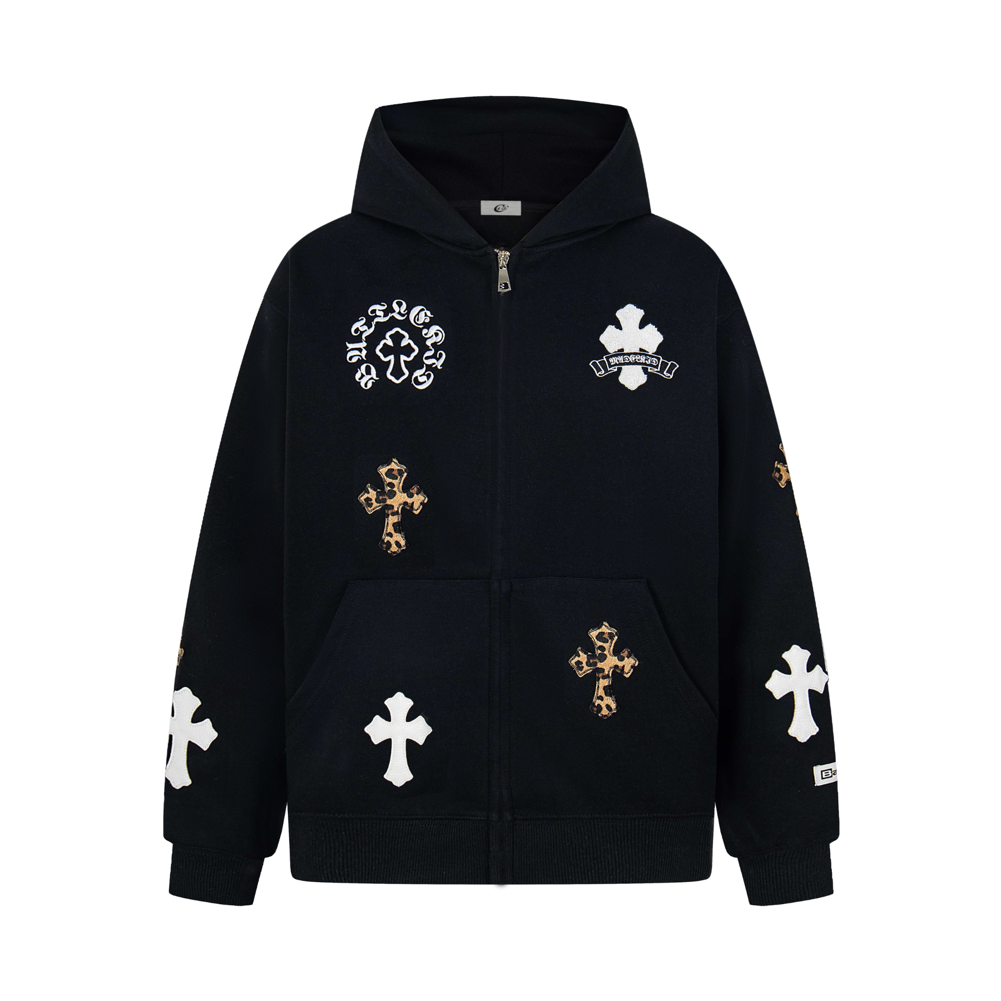 Clothing details: Gothic cross appliqué embroidery, full front zip closure, soft fleece interior, adjustable hood, and relaxed oversized fit