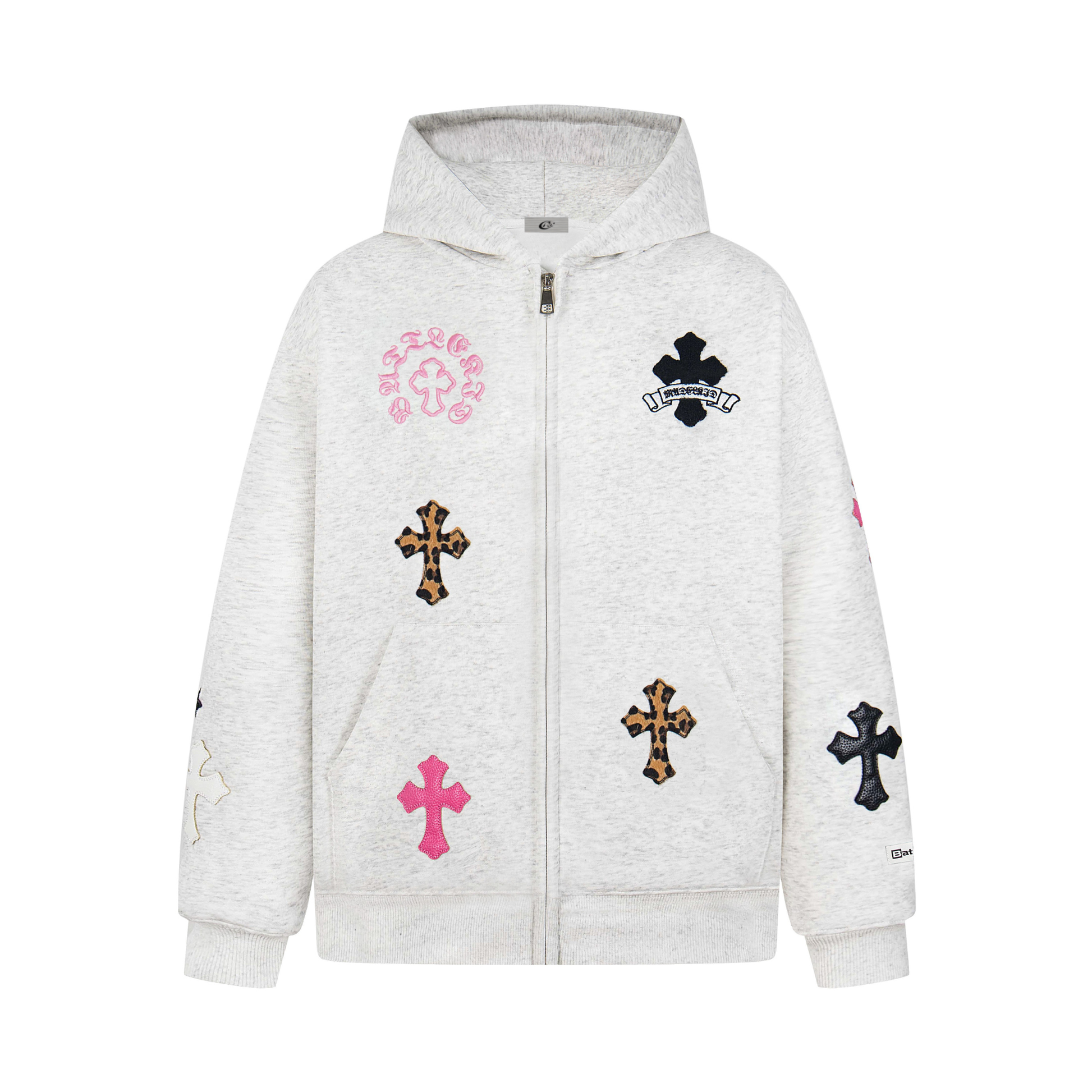The Omirad Cross Patch Full-Zip Hoodie blends Gothic streetwear aesthetics with premium comfort. Made from a 65% cotton, 30% polyester, and 5% spandex blend, it offers a soft yet structured feel with slight stretch for everyday wear. The standout feature is the array of embroidered and appliqué cross motifs, including leopard print and color-contrast designs, giving each piece a bold and layered texture. Available in white, heather grey, and black, it’s a statement essential for both casual and elevated street looks.