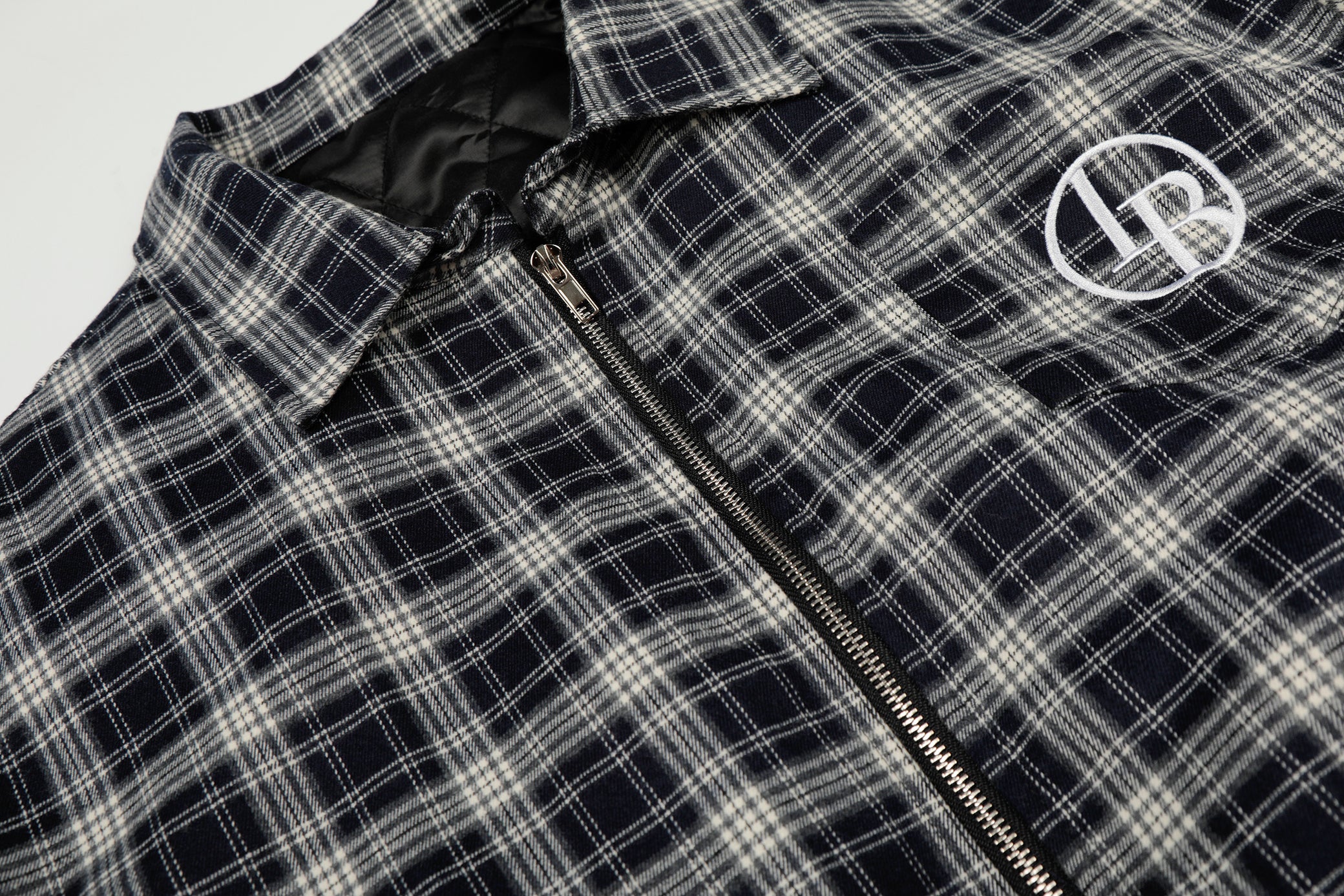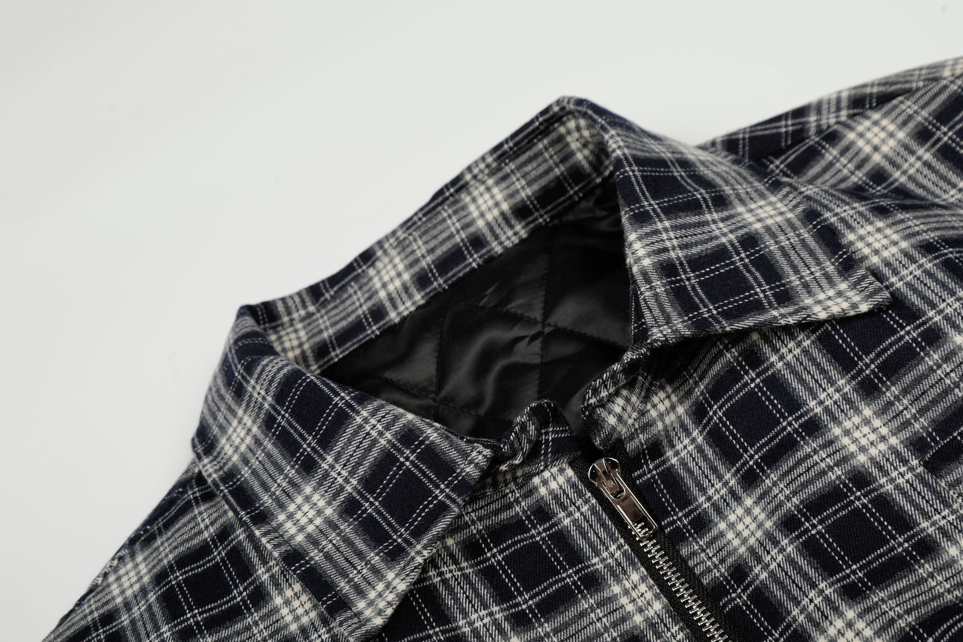Clothing details: Contrast sleeves, ribbed cuffs and hem, full zip closure, plaid shell, and Omirad embroidered logo.