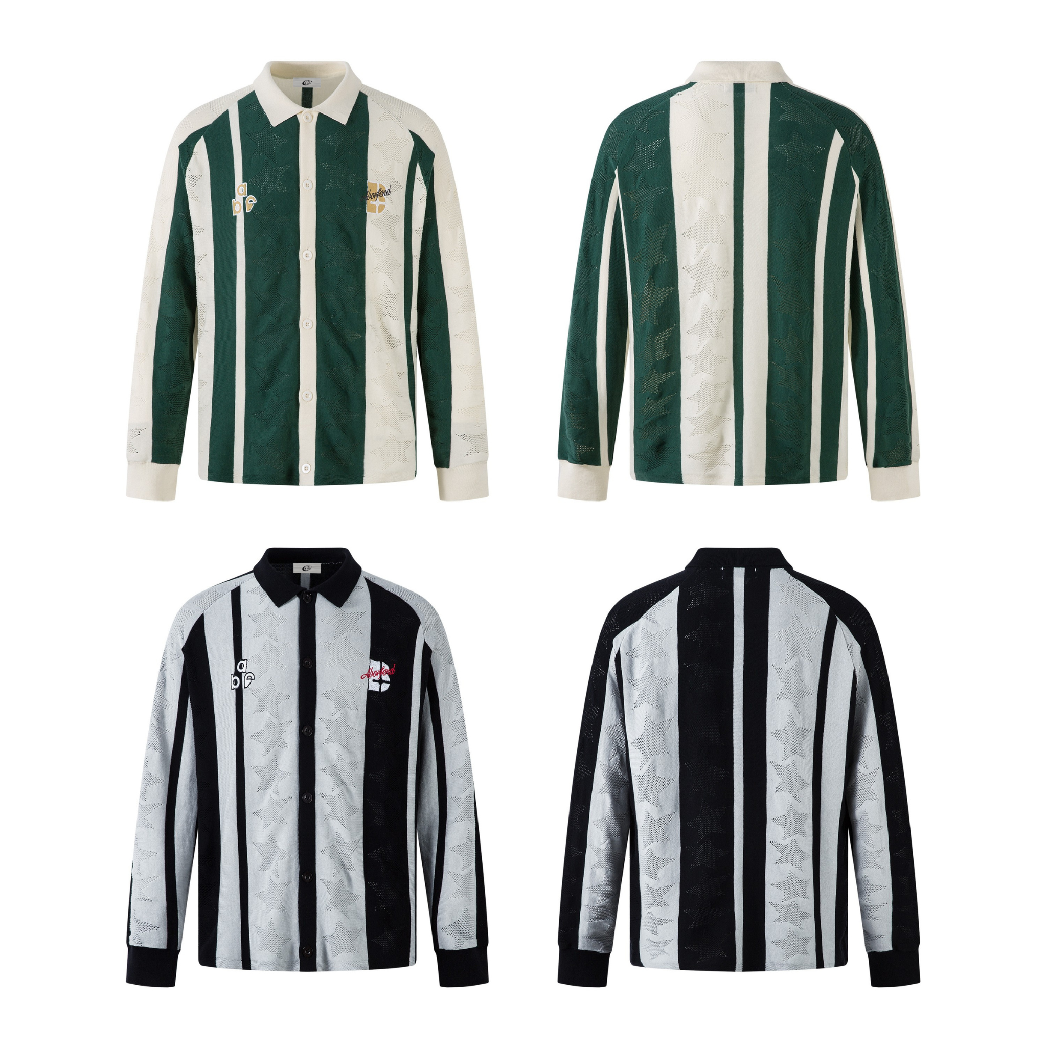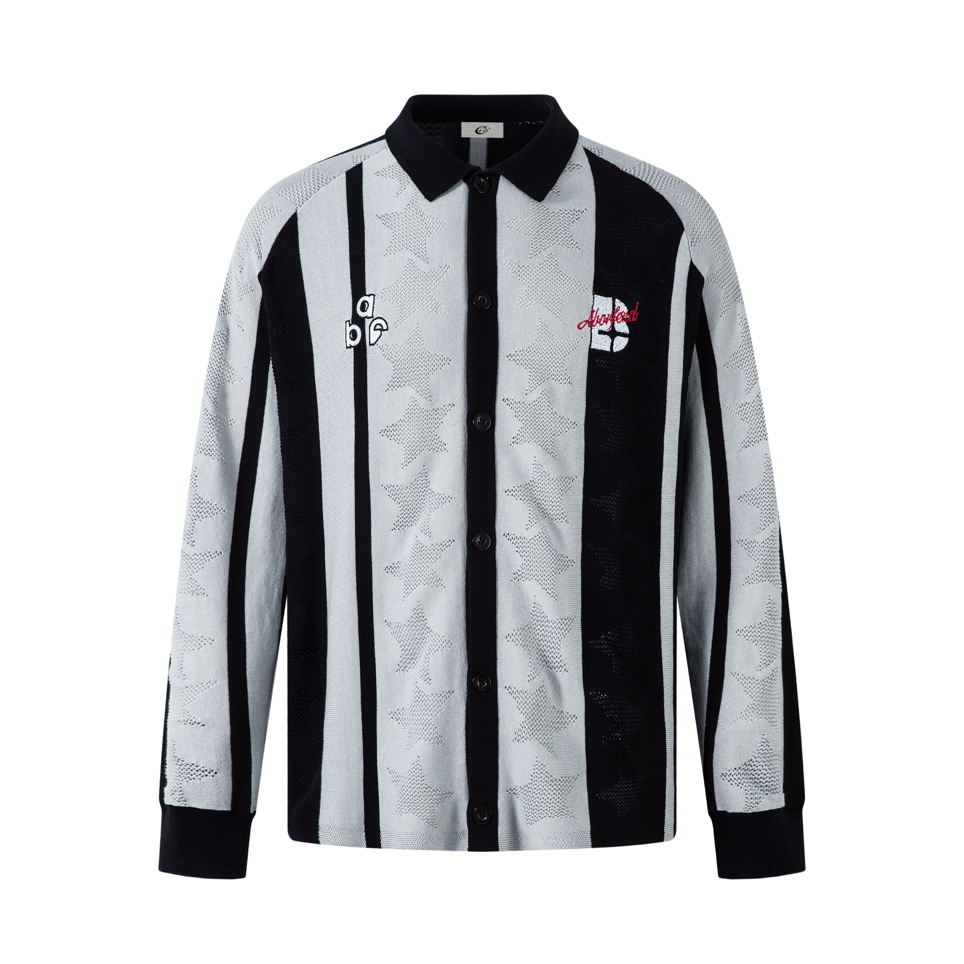 Clothing details: Vertical stripe design, star-textured knit pattern, embroidered logo details, button-up front, ribbed cuffs, relaxed fit.